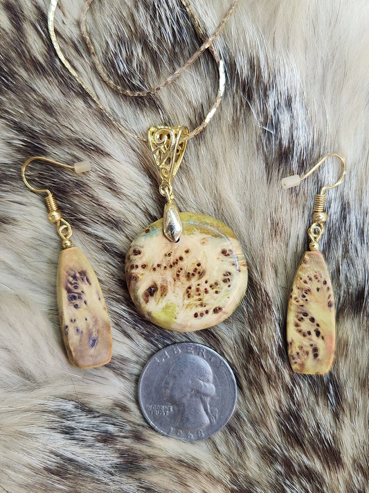 Yellow cedar burl dyed and stabilized neckless and earrings