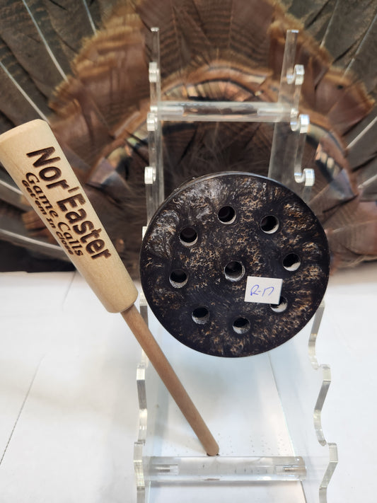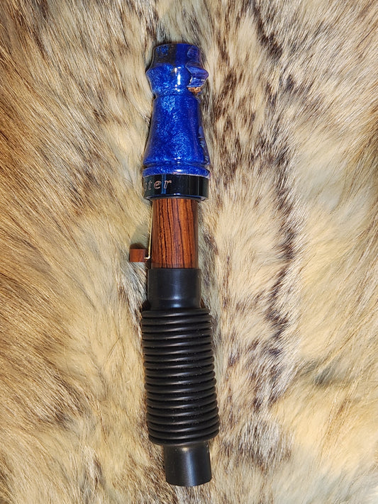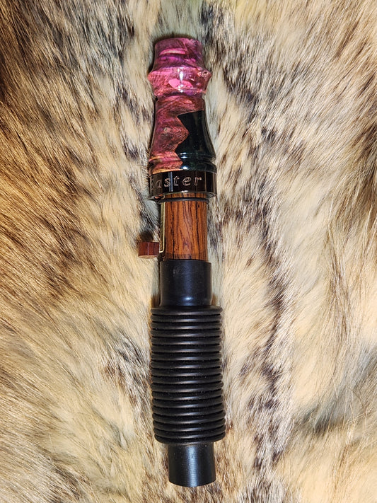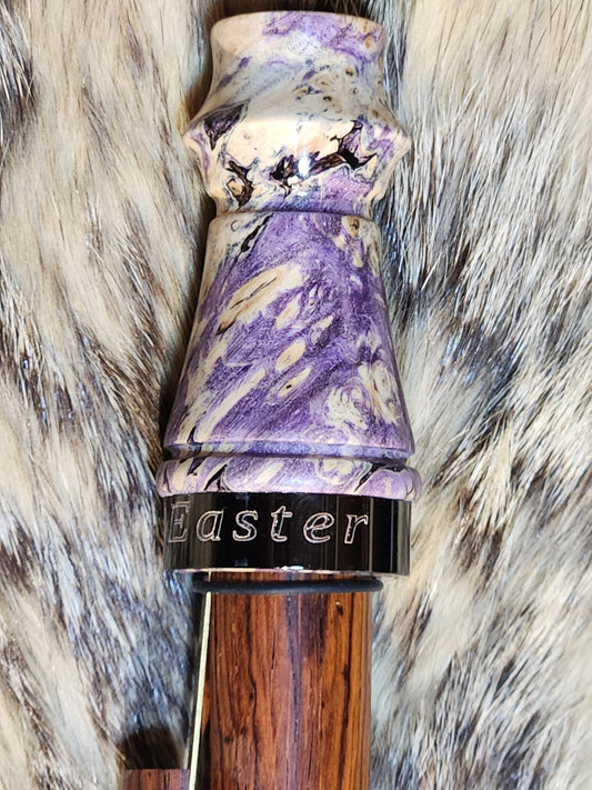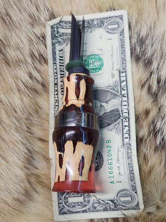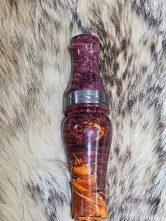 Boxelder burl double reed duck call with cocobolo wood tone board and Damascus band