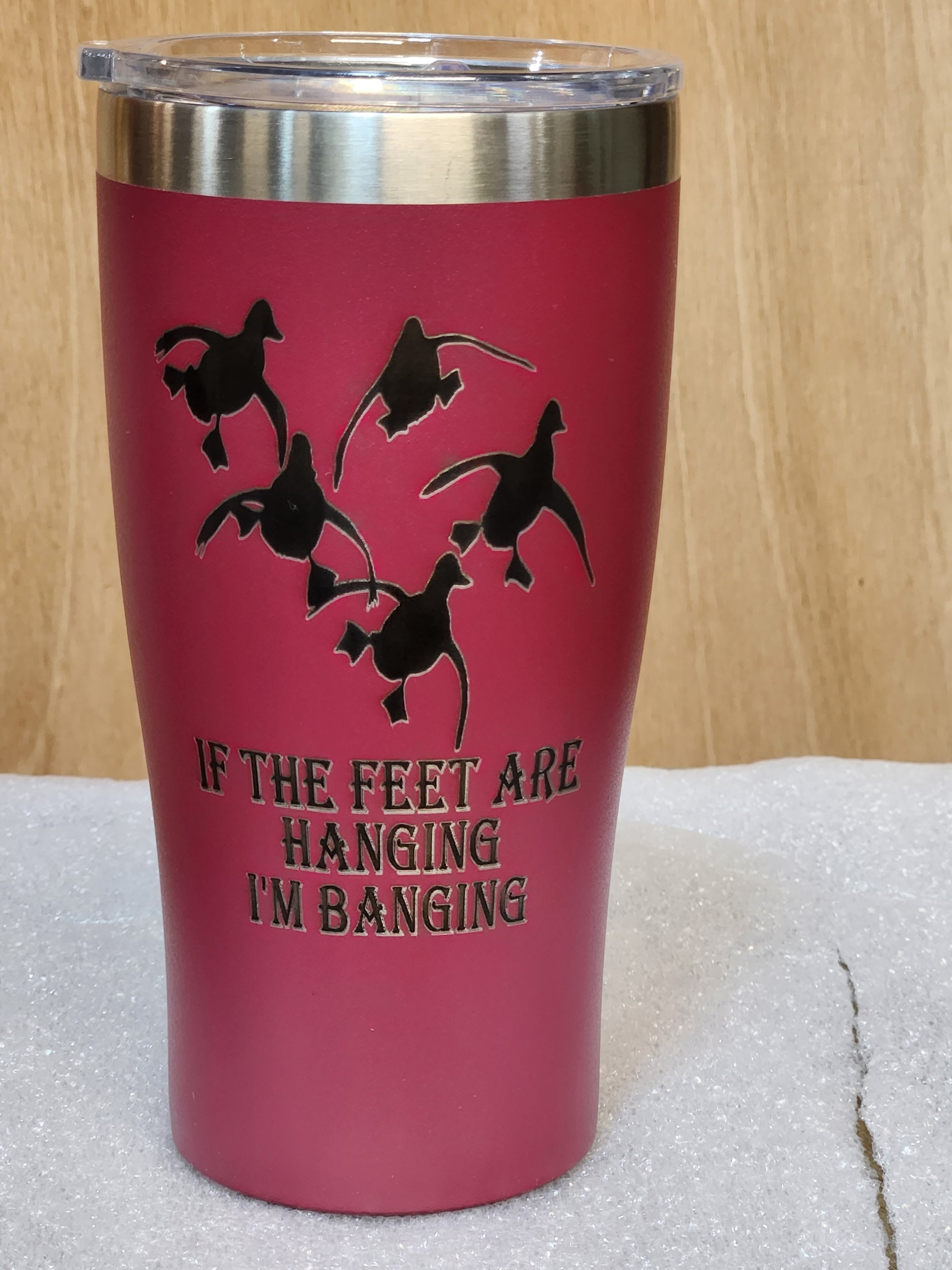 This is a 20 ounce tumbler slide closer lid for no spills. Marked with my logo on one side and the custom duck hunting logo on the other side.