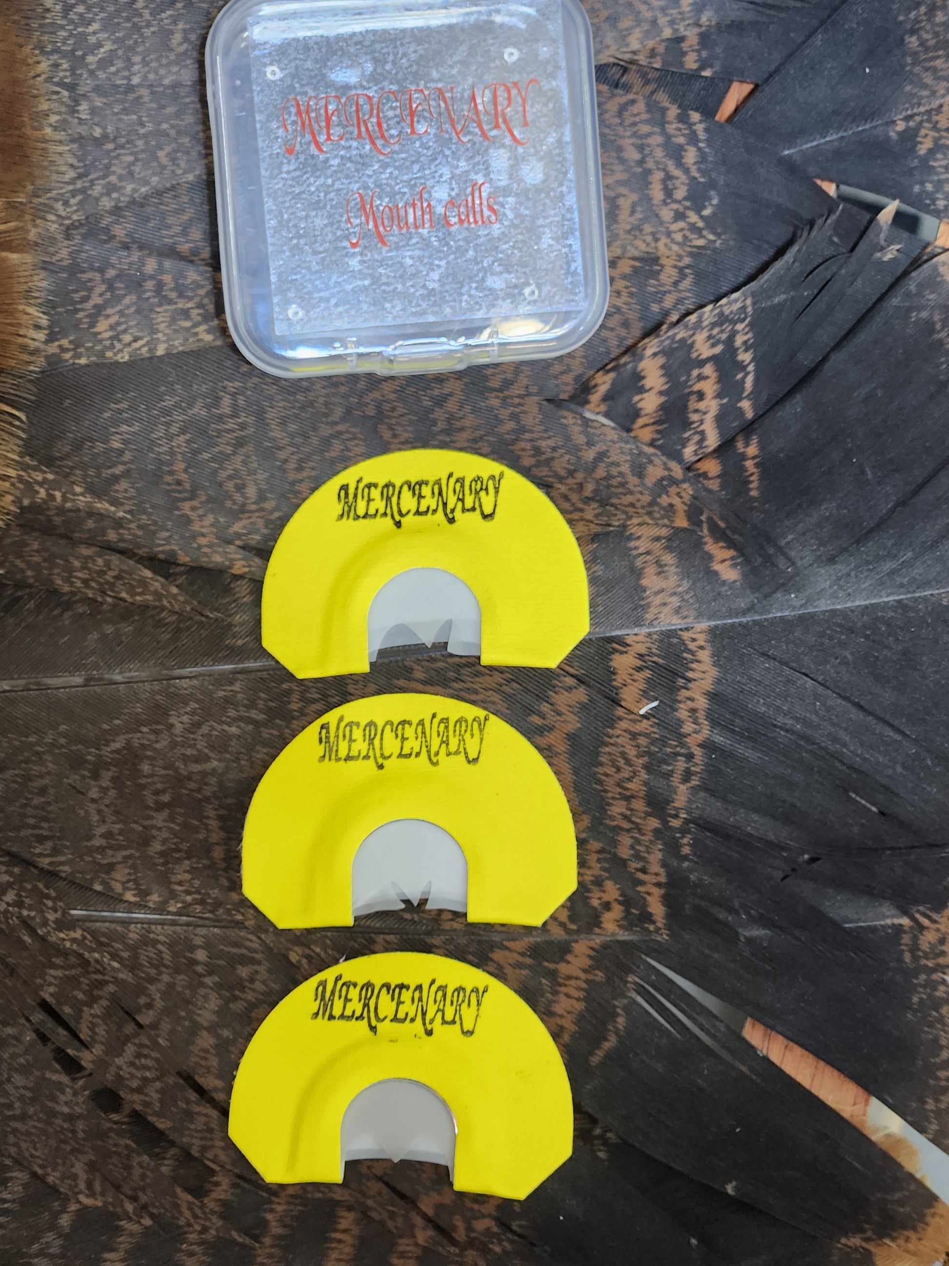 This is a 3 pack of Mercenary mouth calls of the most popular cuts. This is the set of cuts that started it all. Myself and a group of hunters worked with these cuts first to nail down the sounds we wanted before moving on to any other cuts. These 3 cuts have put down many Tom's and continue to bring them within range. Comes with the plastic storage case. These calls have been fine tuned and tested by turkey hunters over the last 5 years to out preform any store bought calls. My reed colors may change throughout the season but the sound will always be the same. Made right here in the noreaster game calls shop.