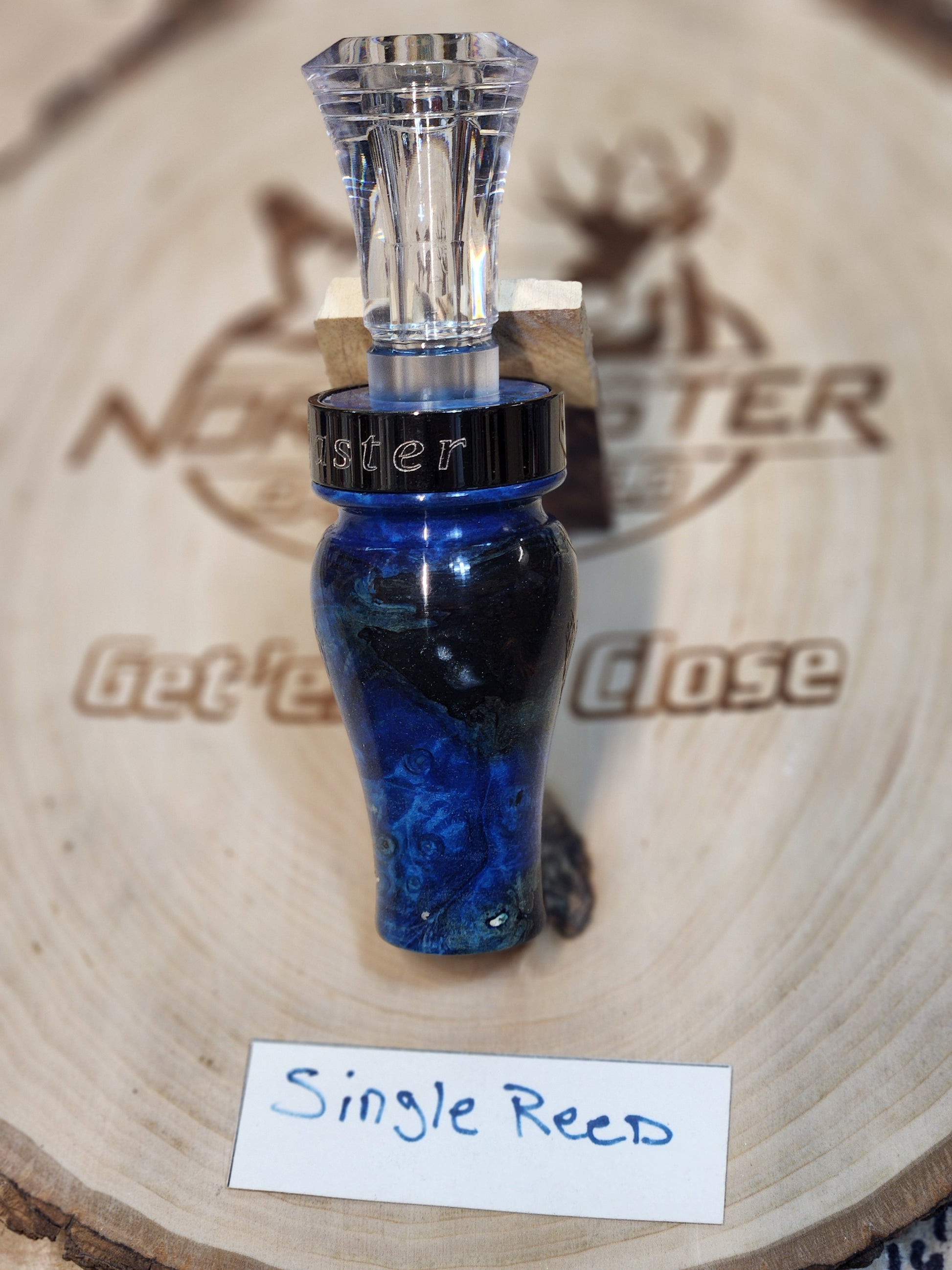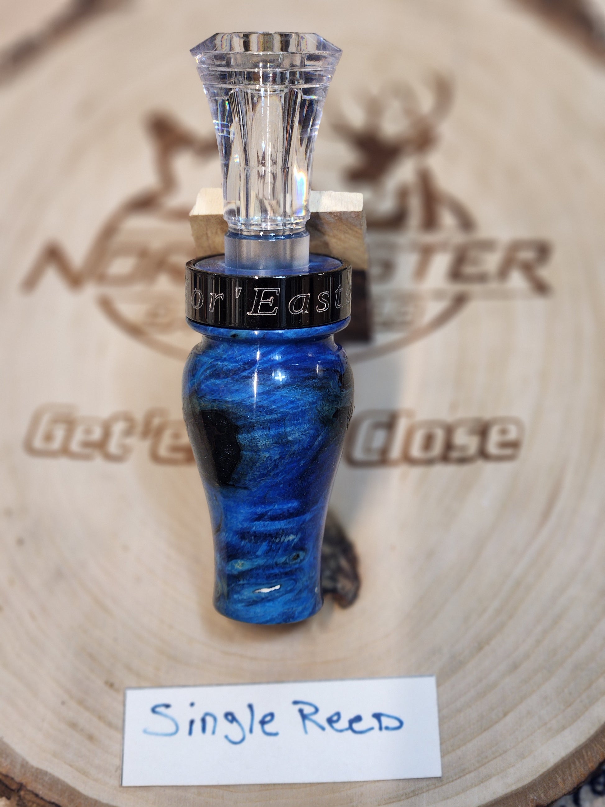 This is part of My new working class series. To keep the custom call cost down I'm using a echo inserts. The barrel is stabilized amboyna burl Wood with resin hand turned by me with 8 coats of CA finish and my Custom engraved metal band. Your call will ship with a free lanyard and nor'easter vinyl sticker and a custom noreaster storage pouch.
