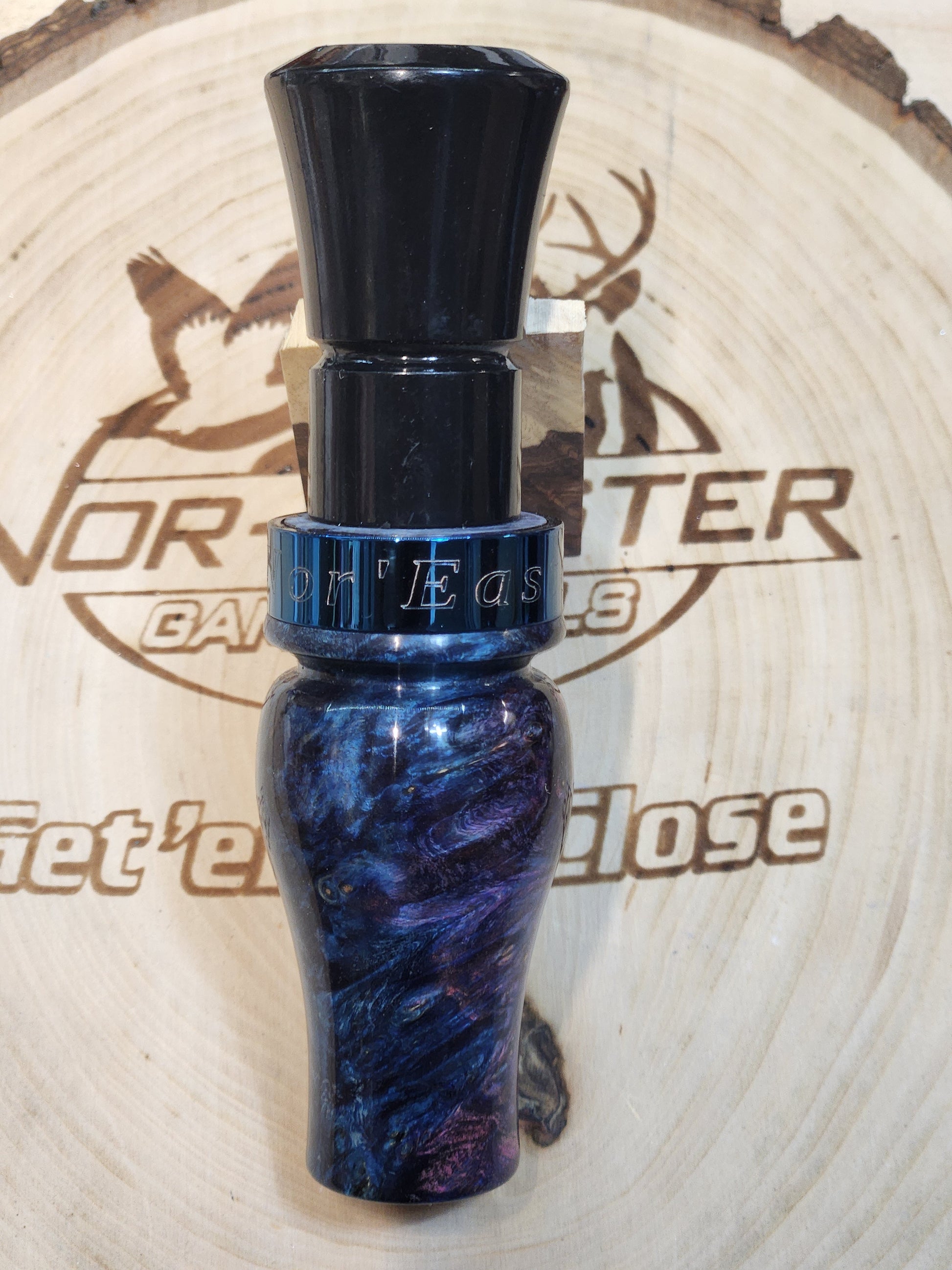 This is part of My new working class series. To keep the custom call cost down I'm using a echo inserts. The barrel is stabilized and Dyed amboyna burl Wood hand turned by me with 8 coats of CA finish and my Custom engraved metal band. Your call will ship with a free lanyard and nor'easter vinyl sticker and a custom noreaster storage pouch.