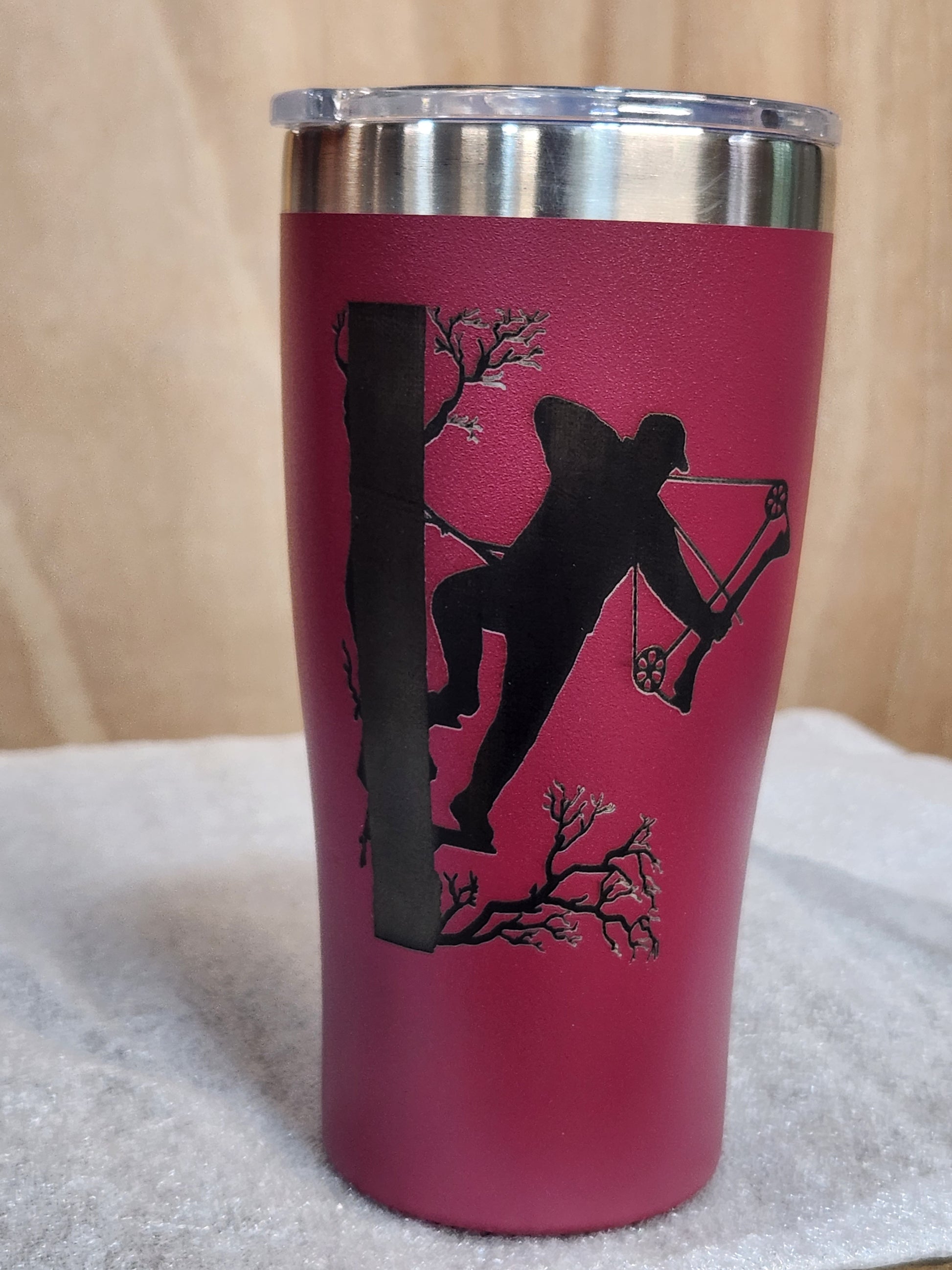 This is a 20 ounce tumbler slide closer lid for no spills. Marked with my logo on one side and the custom saddle hunting logo on the other side.