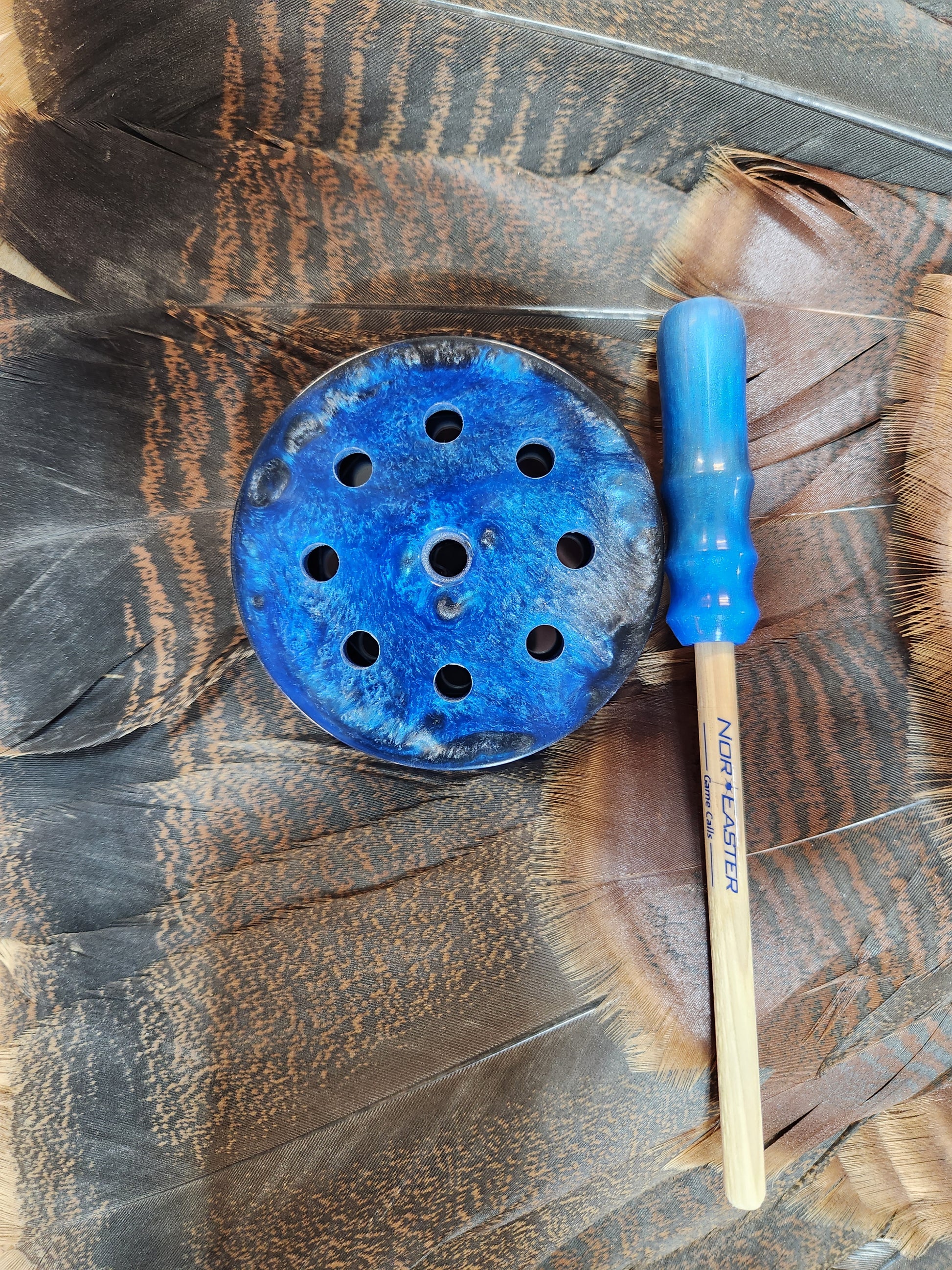 This is the new windbreaker turkey pot call made from alumilite resin. These calls are made one at a time by me including the custom striker. This series is anodized black aluminum over glass. We have been working on this design for almost 5 years tweaking it here and there. We gave it a good test run last year and the results where great. So jump on this custom pot call and make some noise. This call can break through the windy days and still play soft to get'em in close. Call comes with storage pouch and nor'easter vinyl sticker.