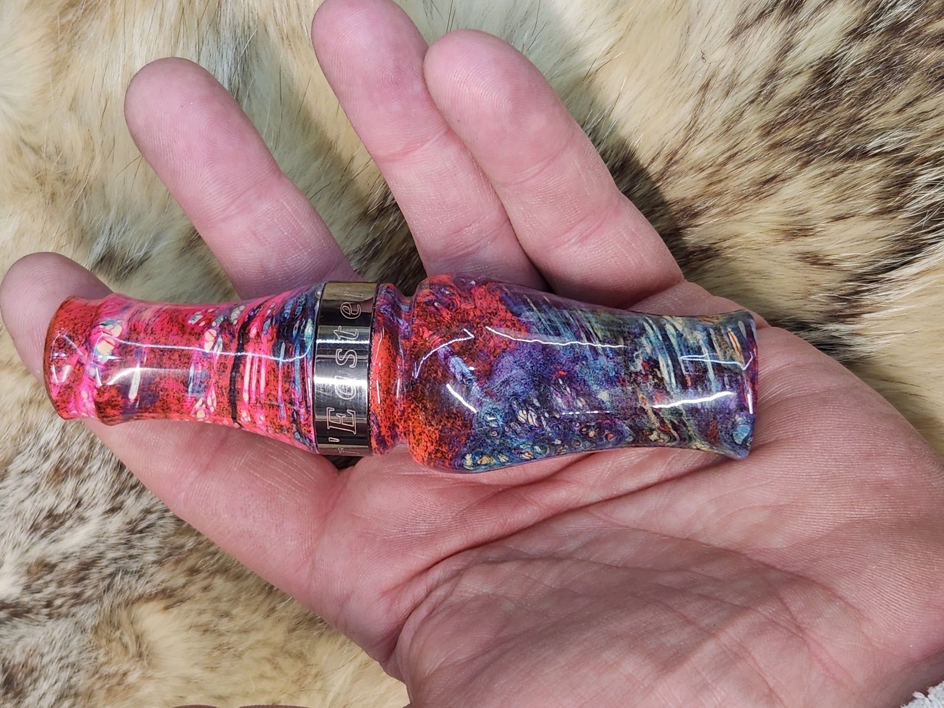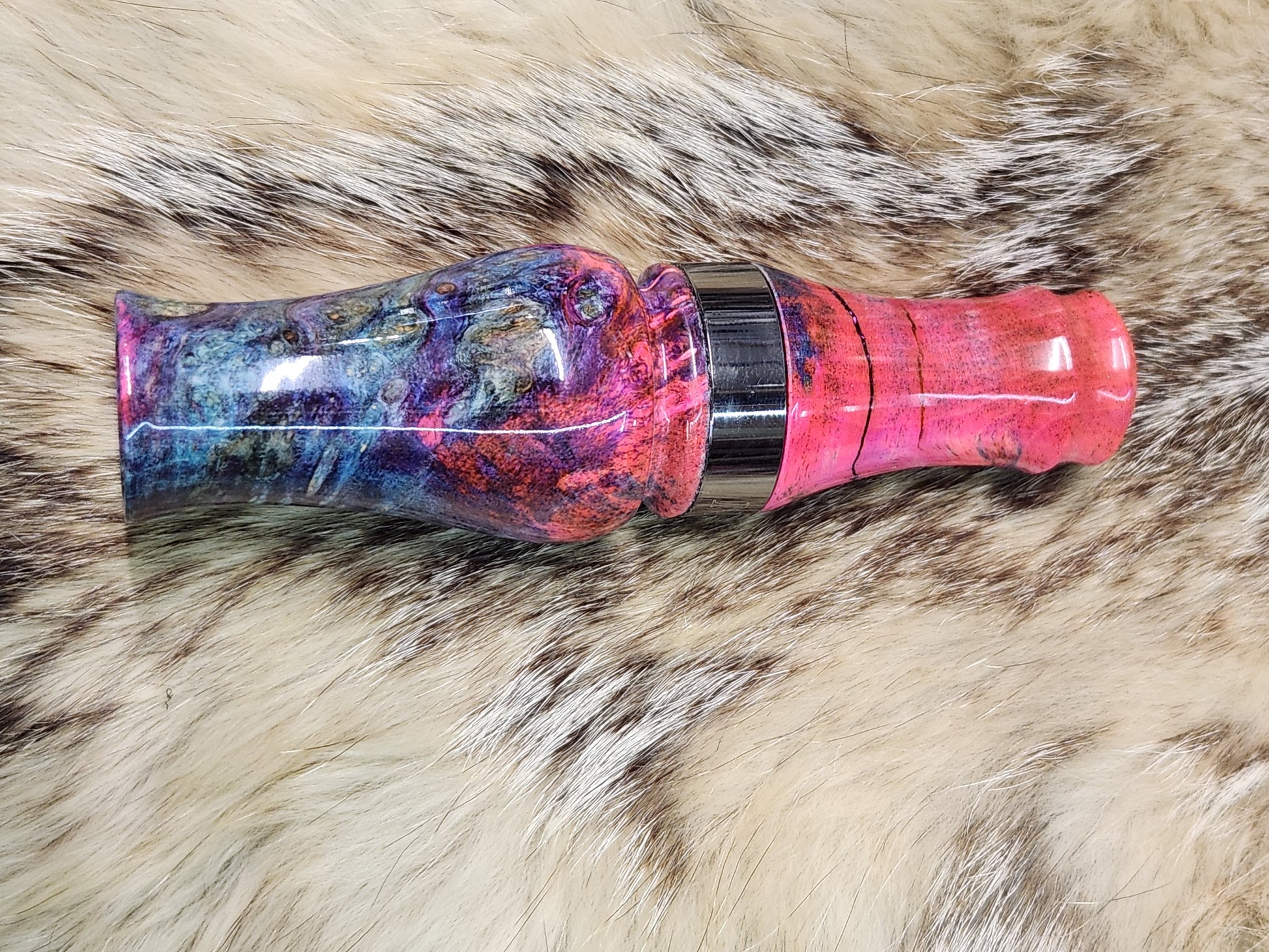 Custom Made Nor'Easter double Reed Duck Call made from Boxelder Burl Wood Dyed and Stabilized, I also coated the call with 6 coats of CA finish for a glass look and to protect the call. Great sounding double reed insert resin poured and shaped by me right here in the shop, call comes with a gun metal nickle band engraved with the nor'easter logo, also done right here in the shop, great call for getting the wary Ducks to come to your blind, If your looking for a true one of a kind call to show off this should do it, all the looks and great sounds. Ships in nor'easter storage pouch, free lanyard and nor'easter vinyl sticker.