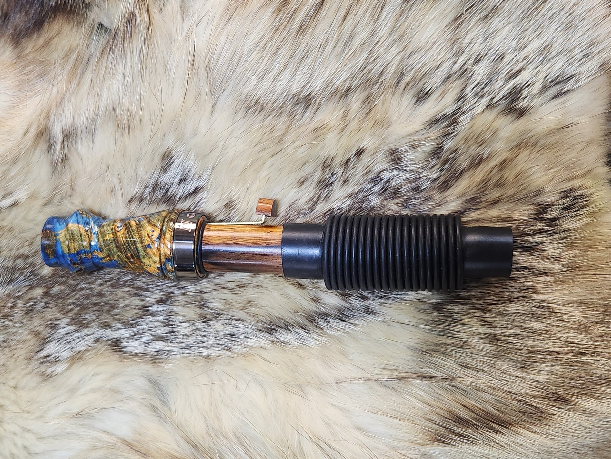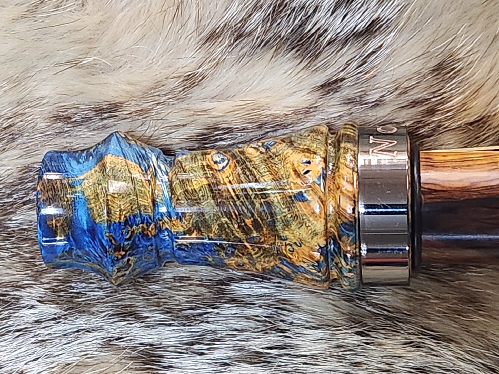 This is a "Limited Edition" Evolution Series adjustable grunt call, So get them before they're gone, The call is fully adjustable from a doe bleat to a swamp buck by just sliding the tone adjuster with one finger, no need to take apart your call to change the tone it can now be done in a second. The call is made from stabilized and dyed boxelder Burl wood with a cocobolo wood tone chamber. Even the custom engraved metal band is done in the shop the real Rubber Grunt tube makes for realistic sounds, No Plastic Here, They are turned and tuned one at a time by me right here in the shop using my tone board and hand cut reed. also has a hand turned cocobolo wood Thumb slide, Call is marked with the Nor'Easter Logo, If you like one of a kind calls this is the one for you, Great Looks And Sounds Like the real thing. Comes with a storage pouch and free lanyard along with a vinyl nor'easter game calls sticker