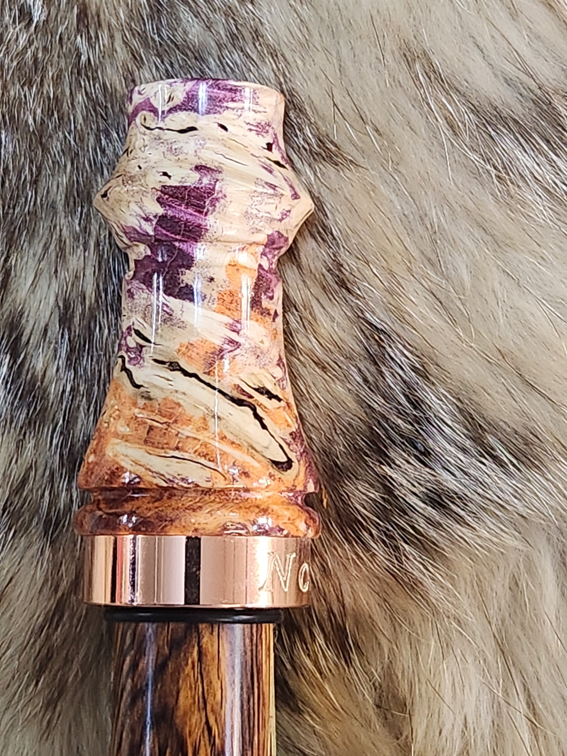This is a "Limited Edition" Evolution Series adjustable grunt call, So get them before they're gone, The call is fully adjustable from a doe bleat to a swamp buck by just sliding the tone adjuster with one finger, no need to take apart your call to change the tone it can now be done in a second. The call is made from stabilized and dyed boxelder Burl wood with a cocobolo wood tone chamber. Even the custom engraved metal band is done in the shop the real Rubber Grunt tube makes for realistic sounds, No Plastic Here, They are turned and tuned one at a time by me right here in the shop using my tone board and hand cut reed. also has a hand turned cocobolo wood Thumb slide, Call is marked with the Nor'Easter Logo, If you like one of a kind calls this is the one for you, Great Looks And Sounds Like the real thing. Comes with a storage pouch and free lanyard along with a vinyl nor'easter game calls sticker
