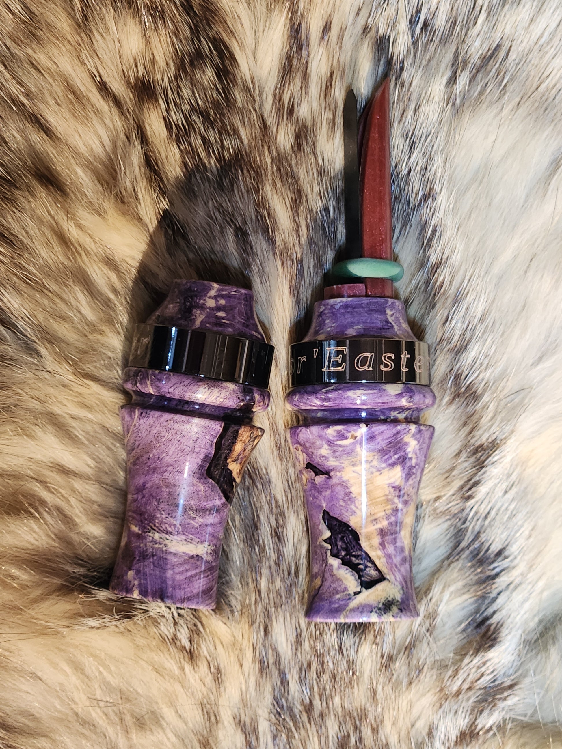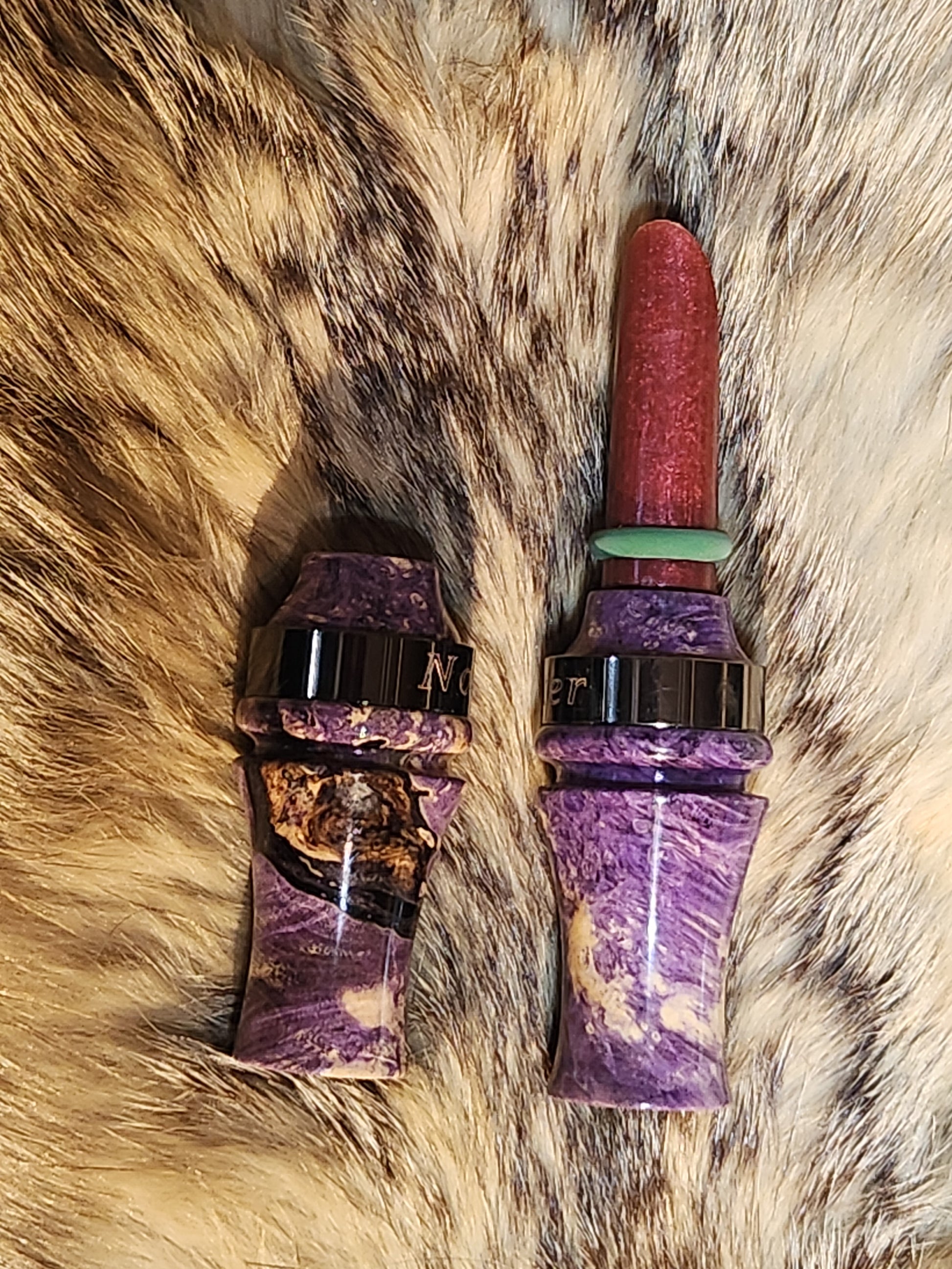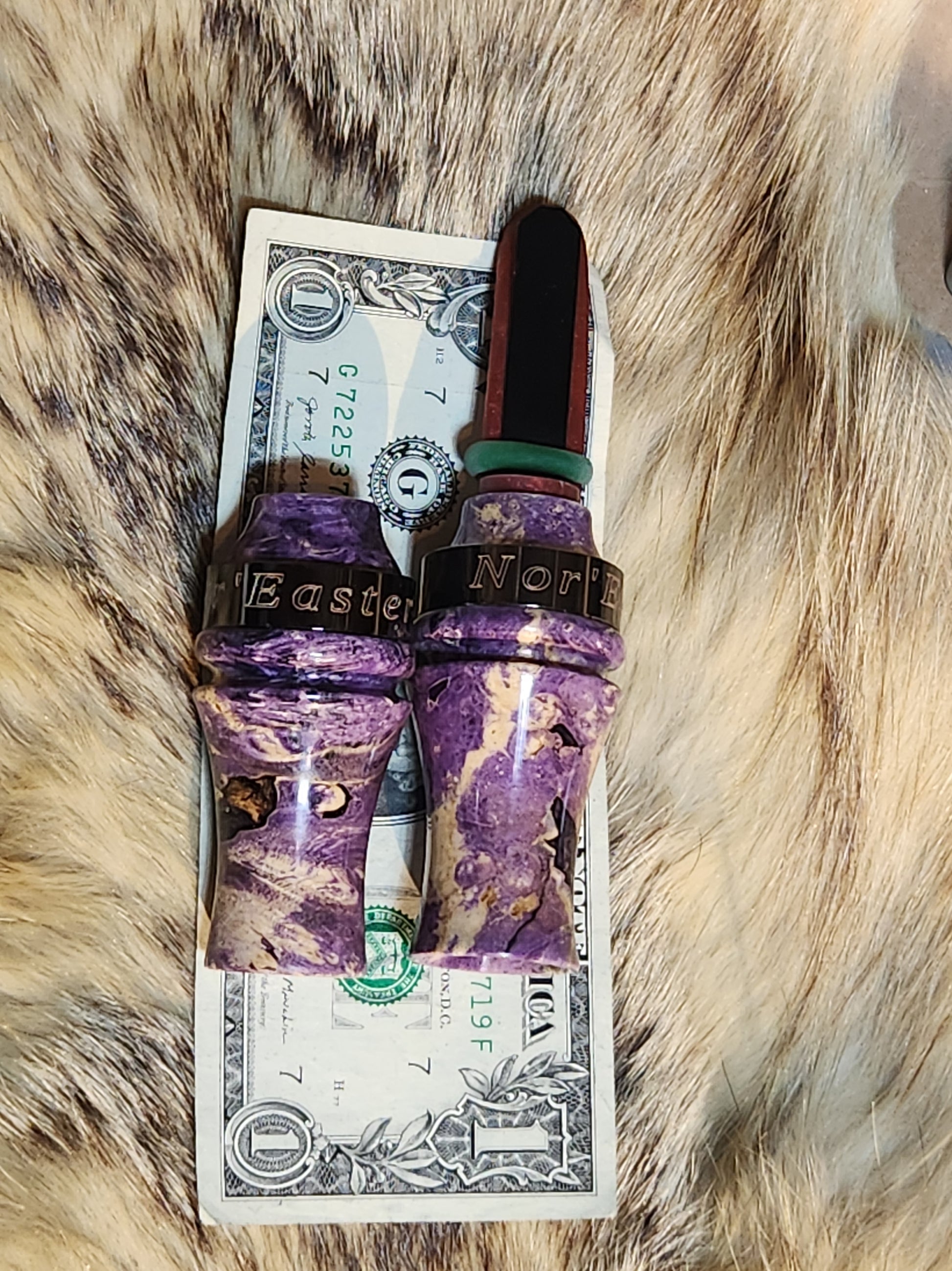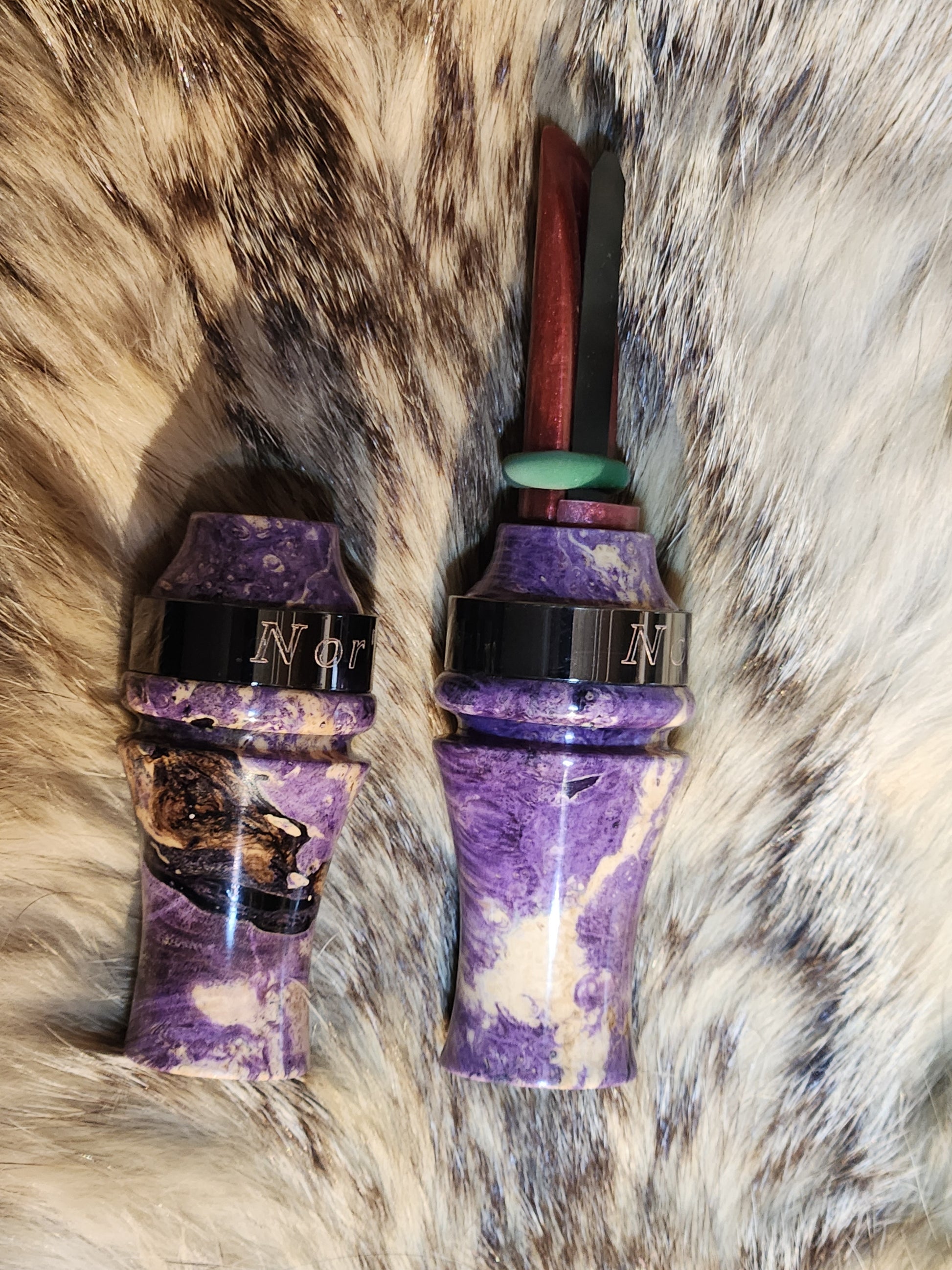 Experience superior sound with the Open Reed Boxelder Burl Coyote Howler. Handmade with stabilized Boxelder Burl Wood, this call has a Tone board and reeds crafted in-house for superior quality control. Finished with 6 coats of CA for ultimate protection, enjoy excellent all-round capabilities, from long howls to short yeps. Rabbit distress call was made from the same block as the howler this little call really screams to get there attention. Great set for the coyote hunter. Comes with storage bags, call lanyard and Nor'Easter Stickers.