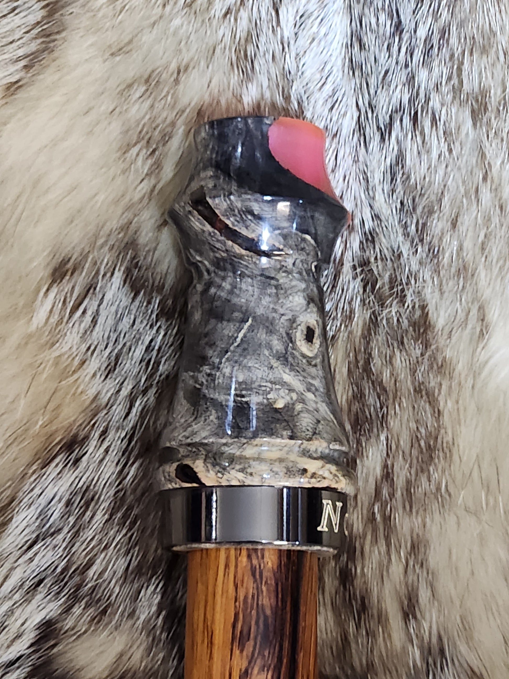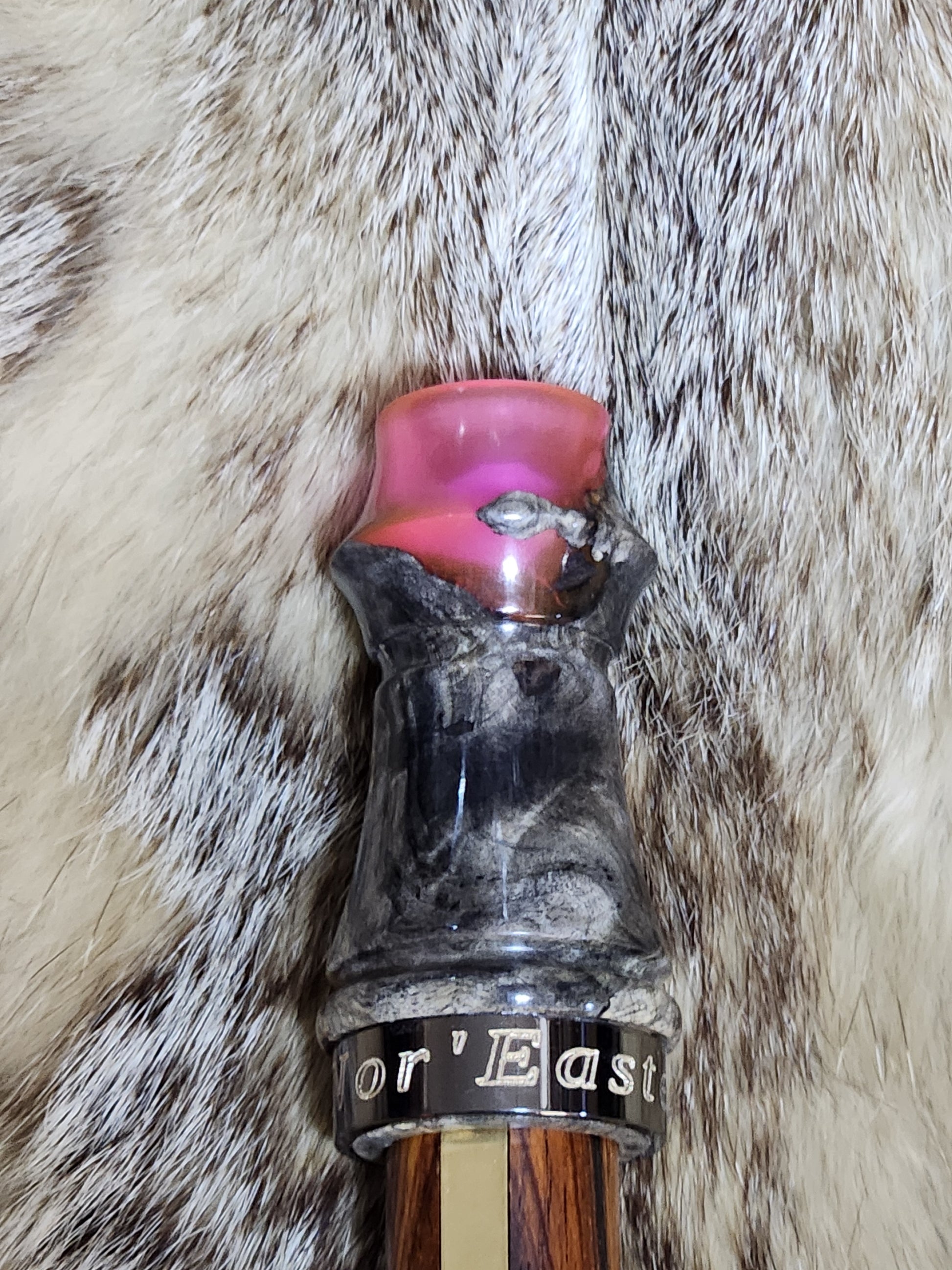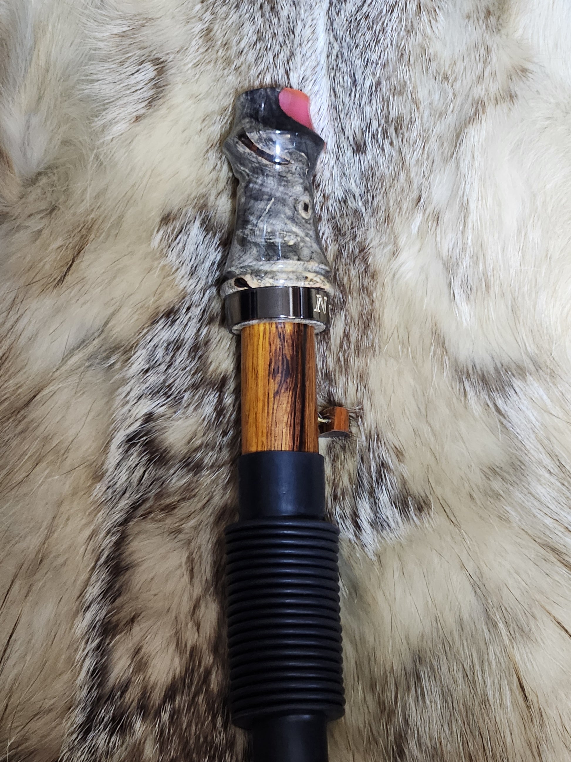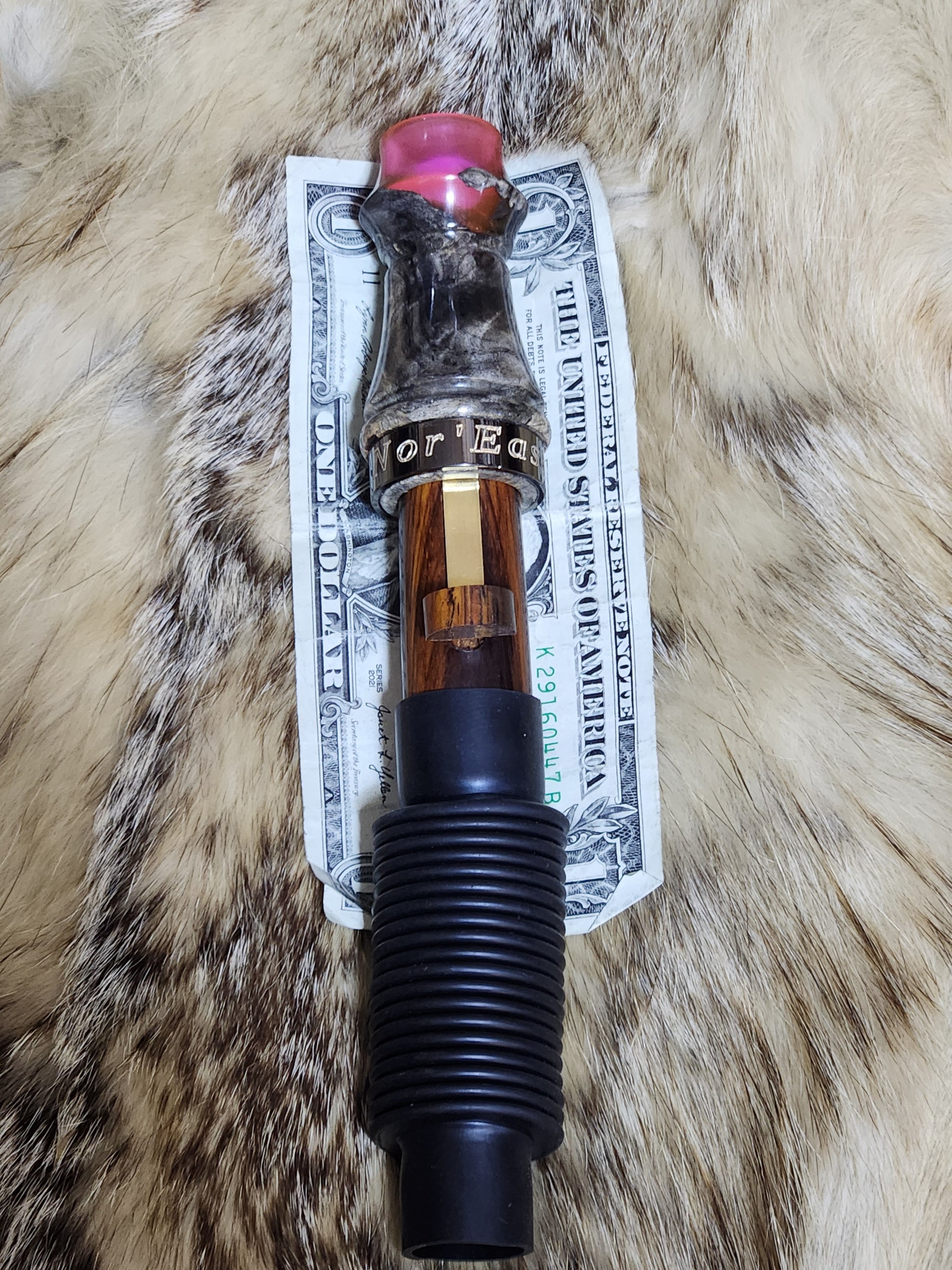 This is a "Limited Edition" Evolution Series adjustable grunt call So get them before they're gone, The call is fully adjustable from a doe bleat to a swamp buck by just sliding the tone adjuster with one finger, no need to take apart your call to change the tone it can now be done in a second. The call is made from stabilized buckeye burl wood and resin with custom engraved metal band With a real Rubber Grunt tube for realistic sounds, No Plastic Here, They are turned and tuned one at a time by me right here in the shop, i also has a hand turned the cocobolo wood tone channel and the cocobolo Thumb slide, i also make the brass slide and tone boards here in the shop and cut each reed for tone and even engrave the bands right here marked with the Nor'Easter Logo, If you like one of a kind calls this is the one for you, Great Looks And Sounds Like the real thing. Comes with free lanyard and nor'easter storage pouch along with some nor'easter vinyl stickers.