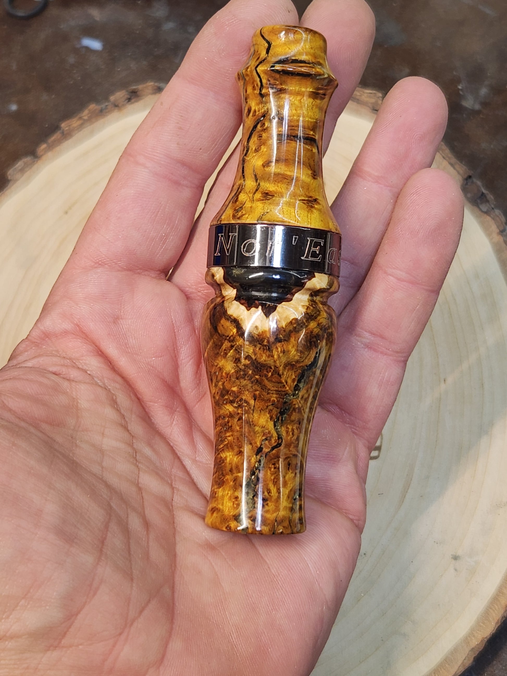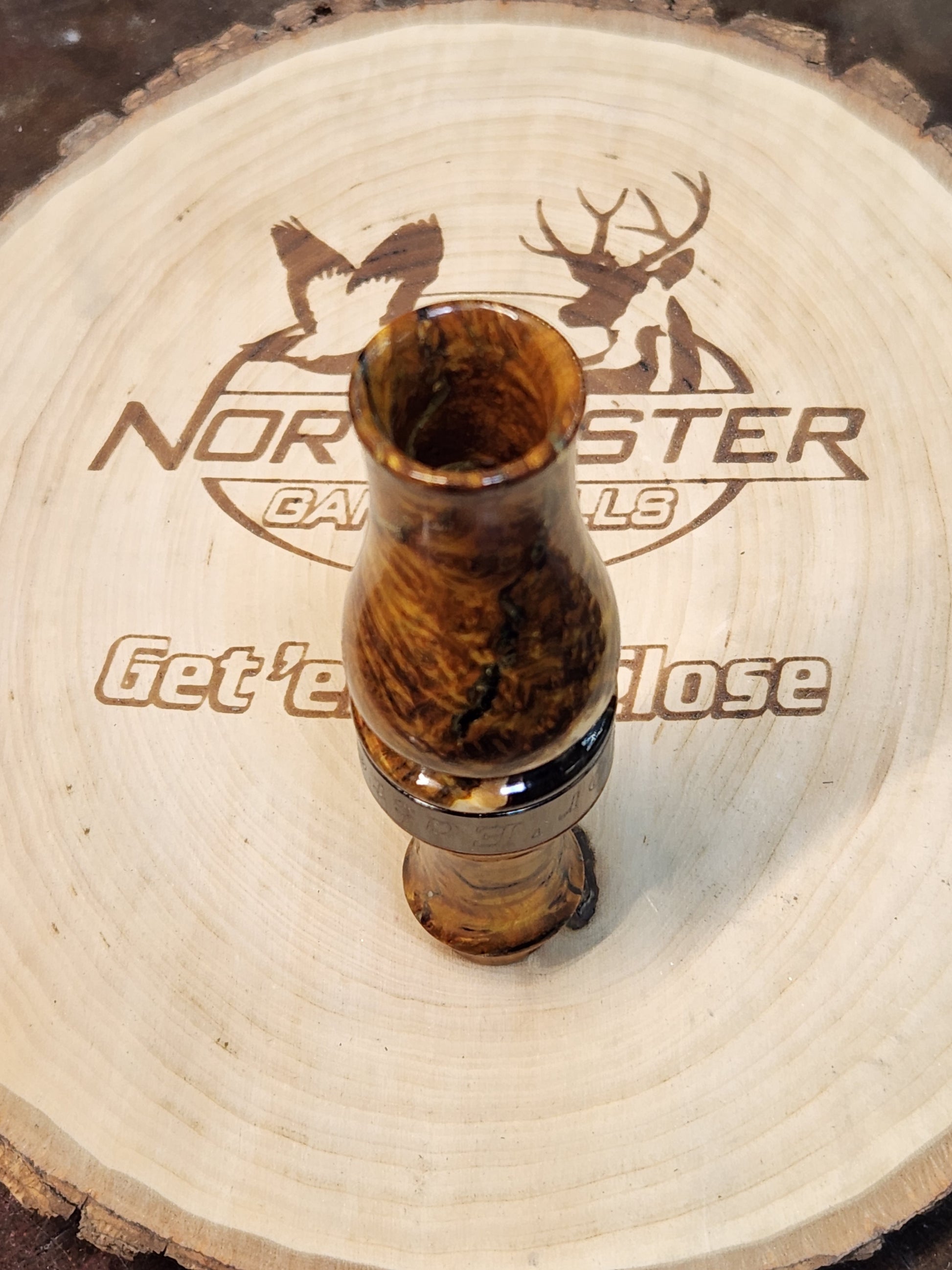 Stabilized chittum burl with resin double reed duck call, this one has all the looks and sounds great, its just a smidgen shorter than most of my calls but makes up for it in sound, made with my shop poured tone board, comes with a free lanyard and nor'easter storage pouch along with a nor'easter vinyl sticker.