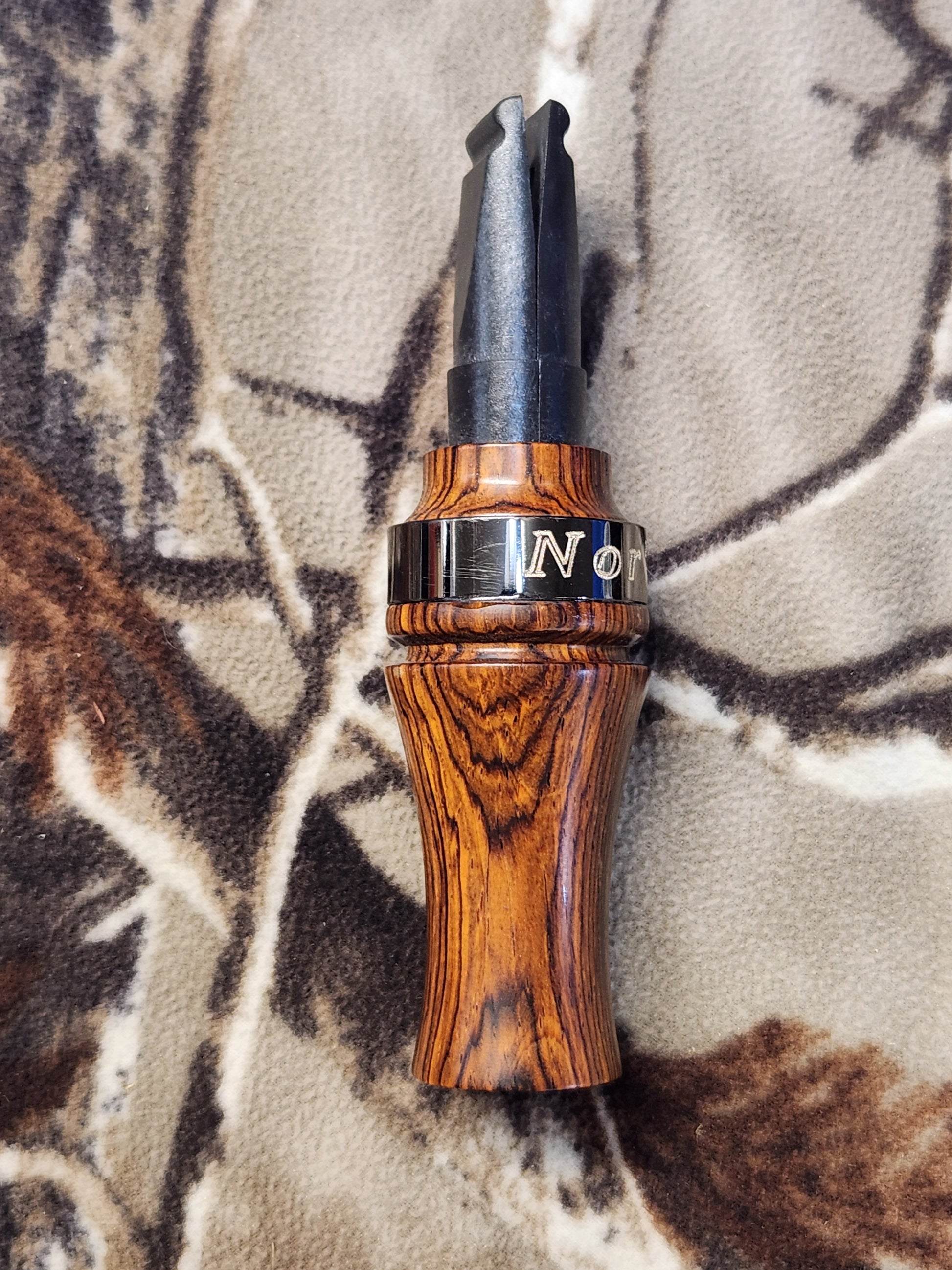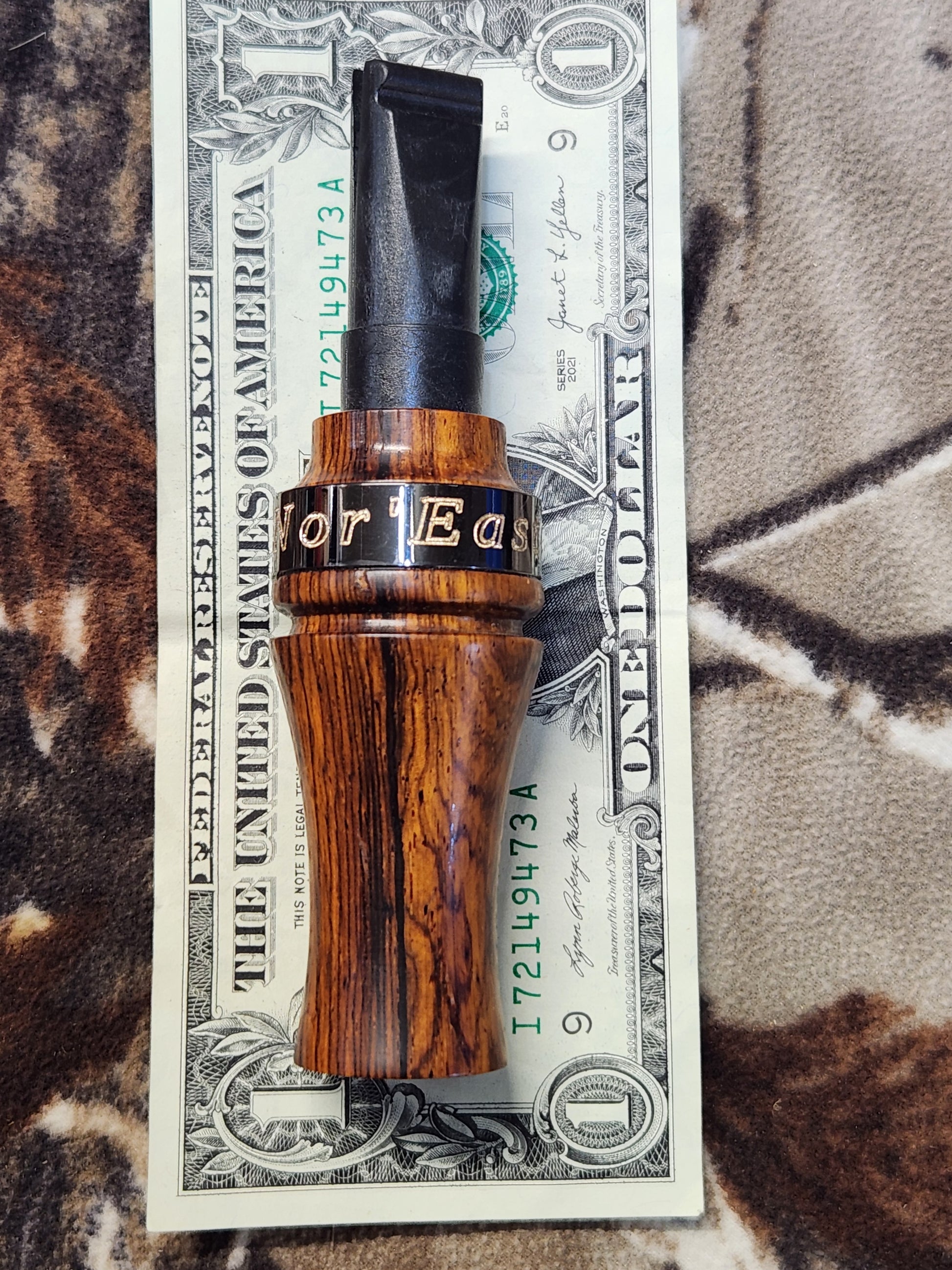 This is a custom crow call made from cocobolo wood. The custom tone boards are made here in the shop and the reeds are hand cut and then the call is tested and adjusted for tone, very easy to use for the beginner or seasoned caller. Call will come with a free lanyard, storage pouch and nor'easter sticker,