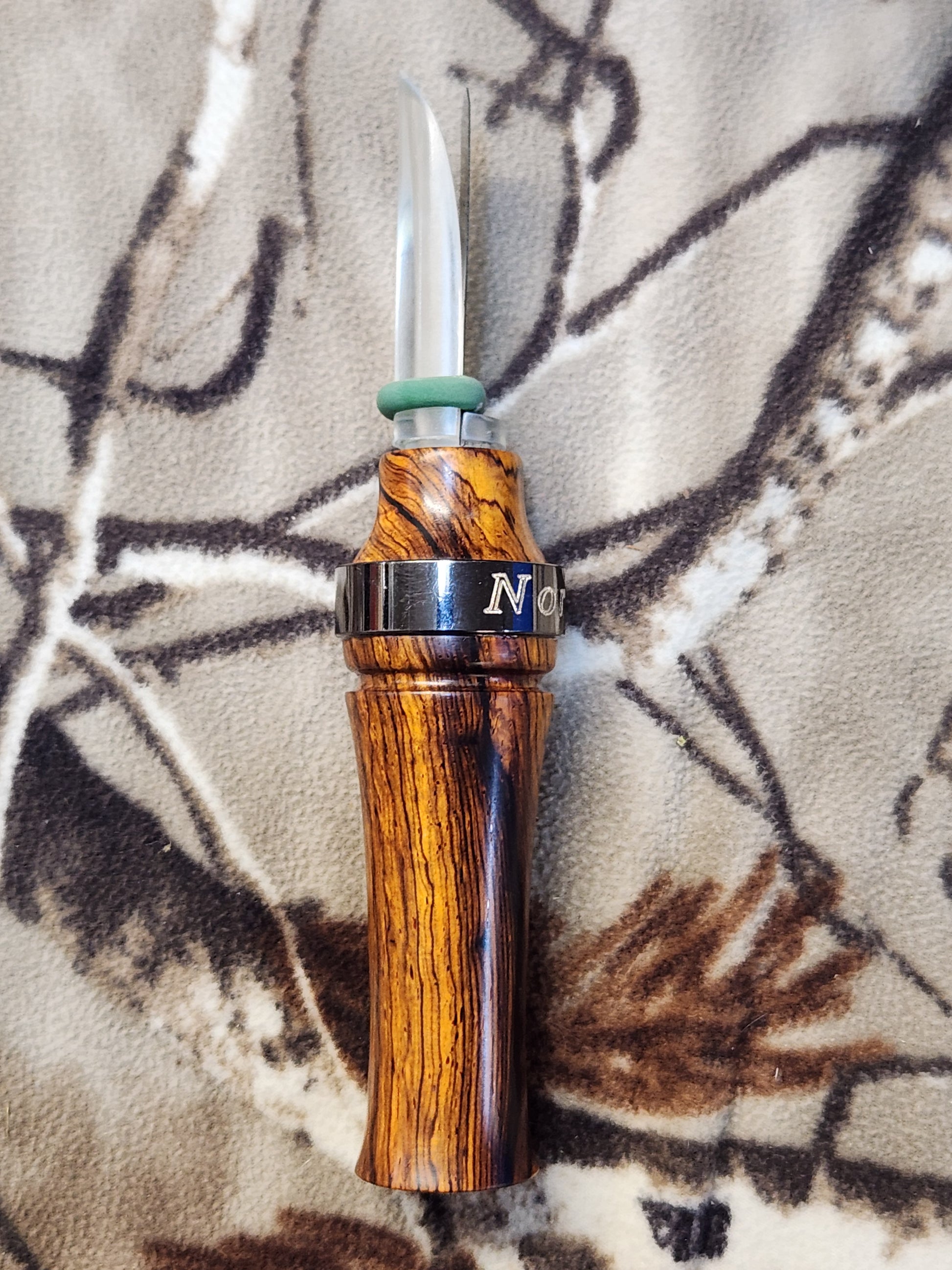 Experience superior sound with the Open Reed cocobolo Burl wood Coyote Howler. Handmade with cocobolo Burl Wood, this call has a Tone board and reeds crafted in-house for superior quality control. Finished with a penetrating wax for ultimate protection, enjoy excellent all-round capabilities, from long howls to short yeps. Comes with storage bag, call lanyard and Nor'Easter Sticker.
