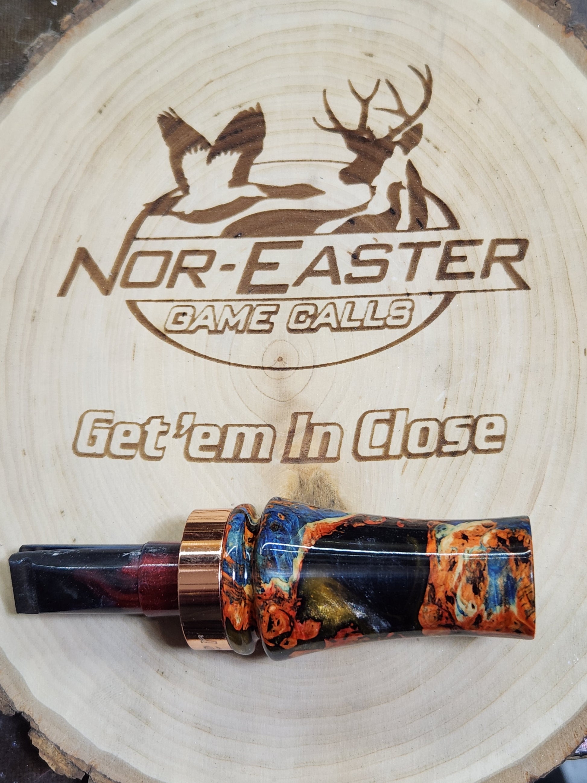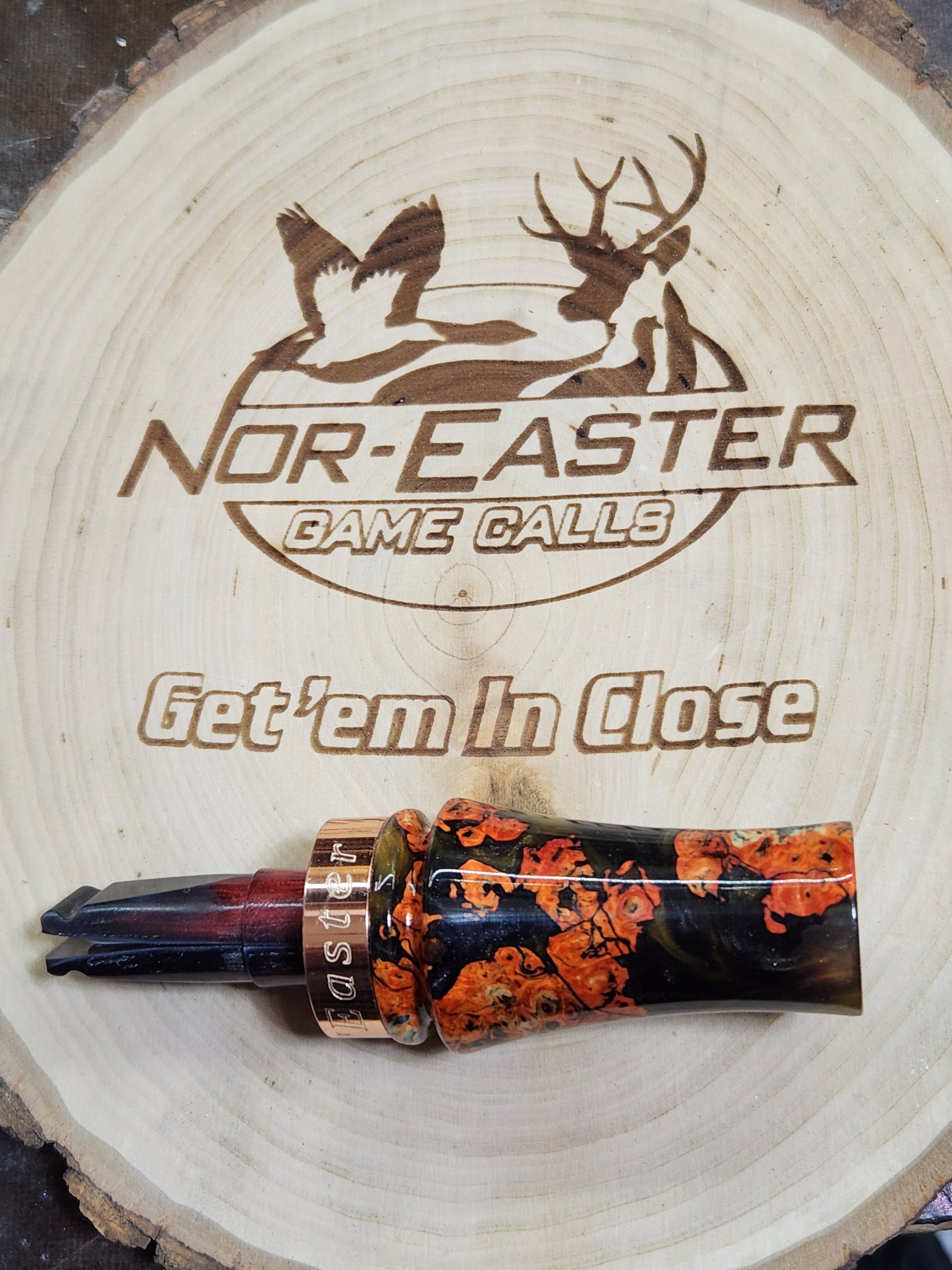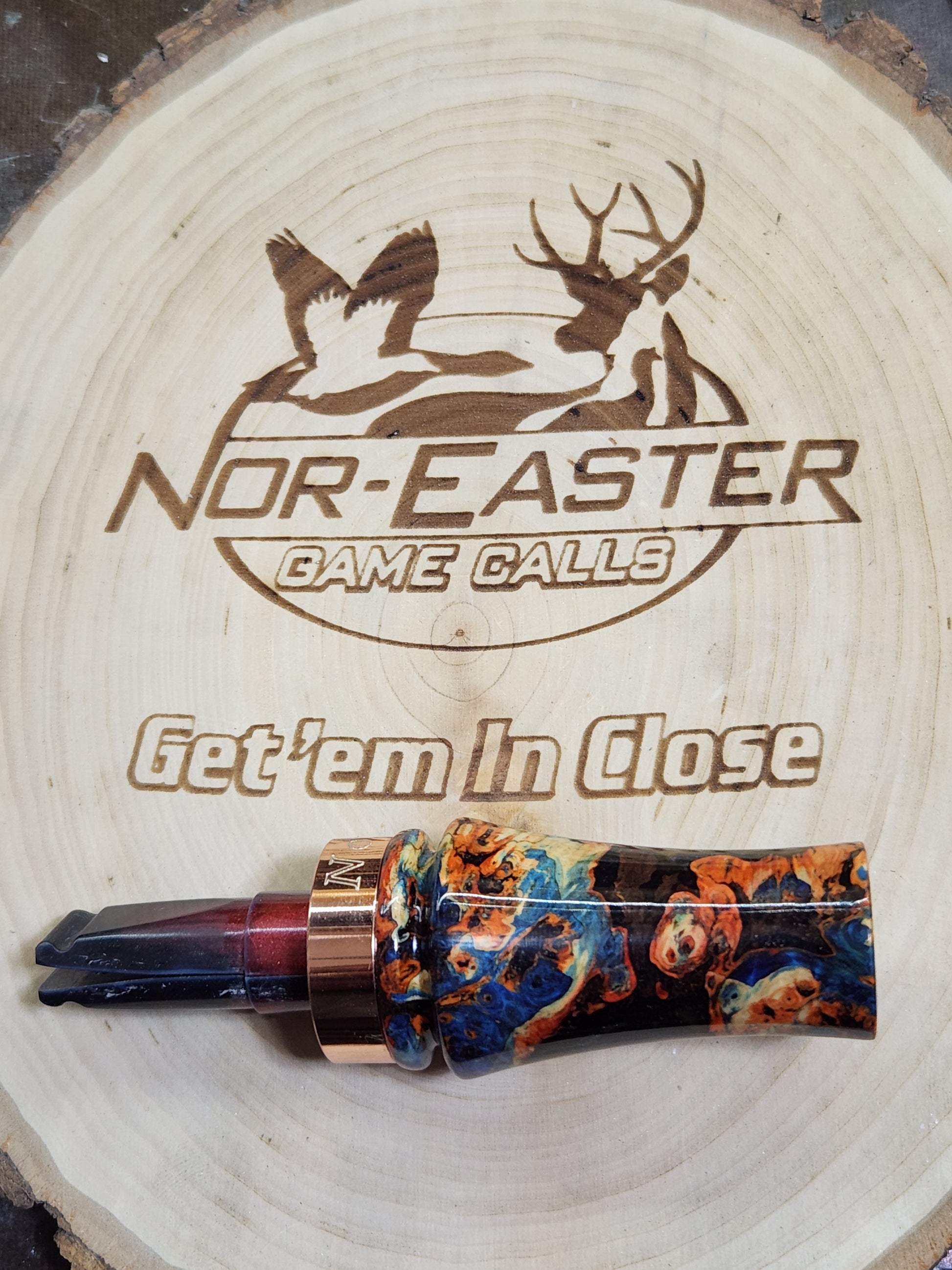 This is a custom crow call made from stabilized and dyed English chestnut burl wood mixed with resin. The custom tone boards are made here in the shop and the reeds are hand cut and then the call is tested and adjusted for tone, very easy to use for the beginner or seasoned caller. Call will come with a free lanyard, storage pouch and nor'easter sticker,