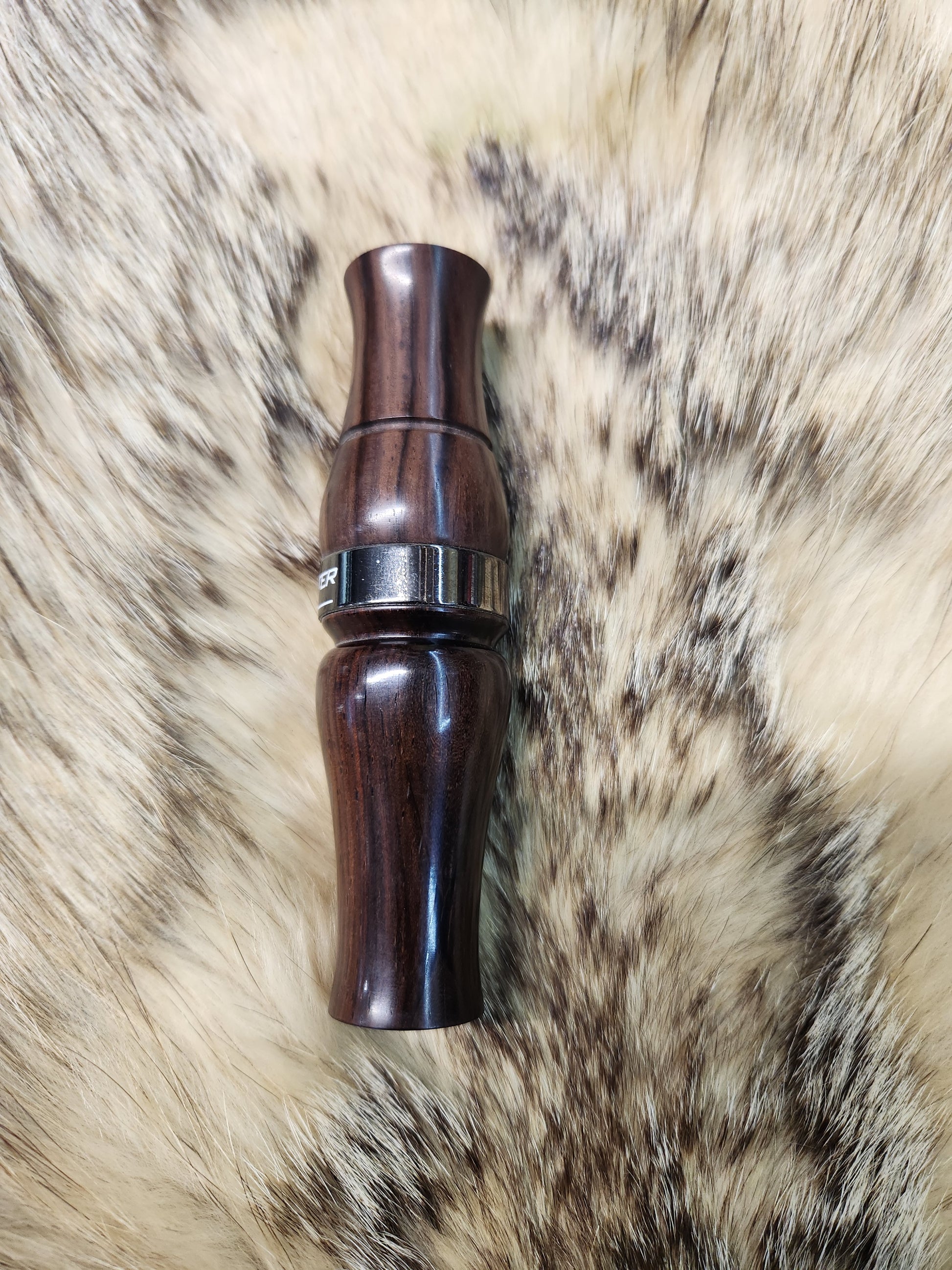 This custom made short reed goose call is made from Burmese Rose wood and has a custom cocobolo wood tone board and wedge, 4-3/4" inches long. all my true custom calls are all made right here in the shop one at a time, the tone boards and wedges are all cut on a custom made jig that was made just for Nor'Easter game calls, each call is hand turned on the lathe one at a time and then hand tuned for the best sound, call ships in Nor'easter Storage bag and vinyl sticker