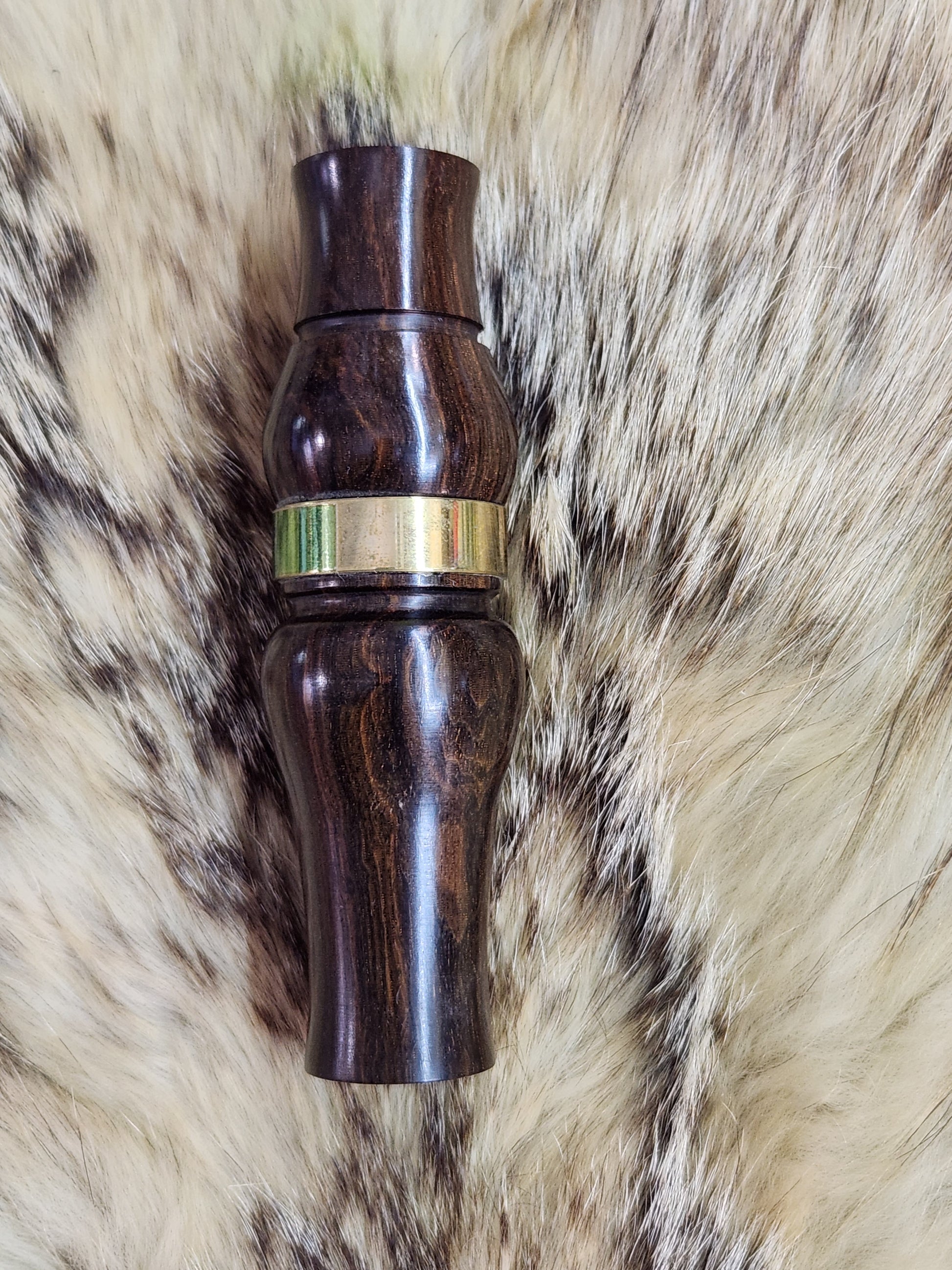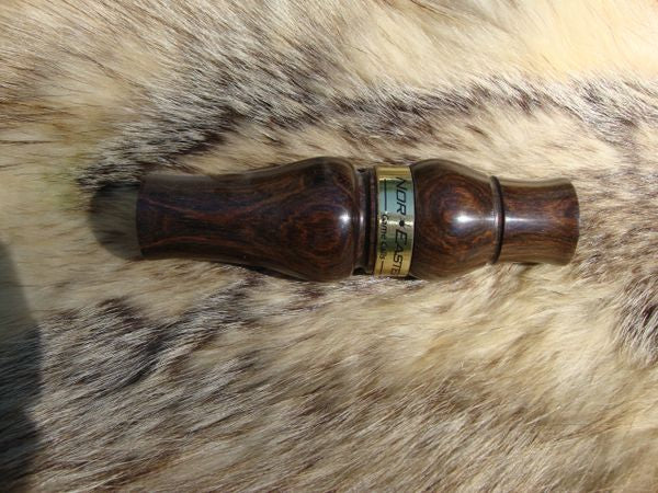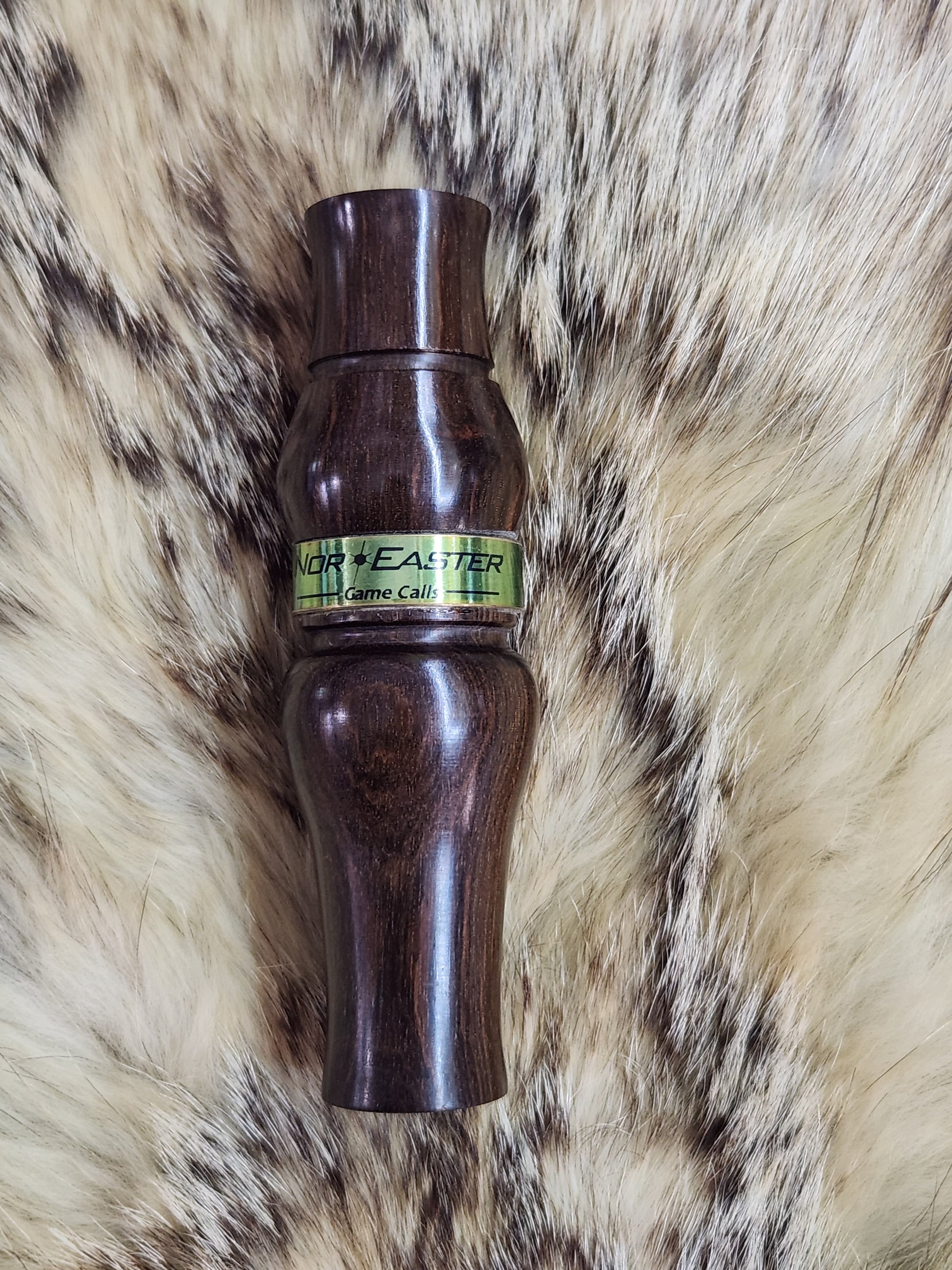 This custom made short reed goose call is made from Surinam Ironwood with a brass band and has a custom cocobolo wood tone board and wedge, 4-7/8" long. all my true custom calls are all made right here in the shop one at a time, the tone boards and wedges are all cut on a custom made jig that was made just for Nor'Easter game calls, each call is hand turned on the lathe one at a time and then hand tuned for the best sound,