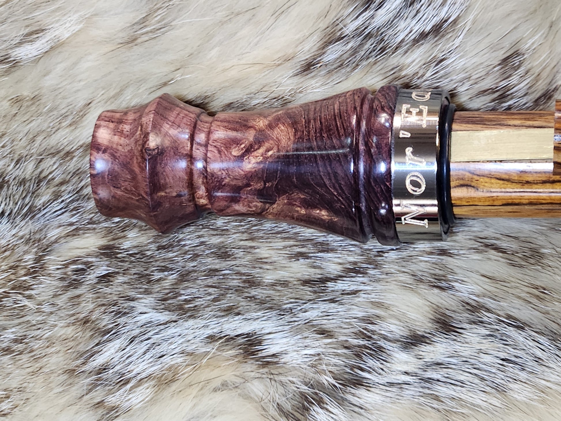 This is a "Limited Edition" Evolution Series adjustable grunt call, So get them before they're gone, The call is fully adjustable from a doe bleat to a swamp buck by just sliding the tone adjuster with one finger, no need to take apart your call to change the tone it can now be done in a second. The call is made from very rare Honduran Rosewood Burl with a cocobolo tone chamber. Even the custom engraved metal band is done in the shop. The real Rubber Grunt tube makes for realistic sounds, No Plastic Here, They are turned and tuned one at a time by me right here in the shop using my tone board and hand cut reed. also has a hand turned cocobolo wood Thumb slide, Call is marked with the Nor'Easter Logo, If you like one of a kind calls this is the one for you, Great Looks And Sounds Like the real thing. Comes with a storage pouch and free lanyard along with a vinyl nor'easter game calls sticker