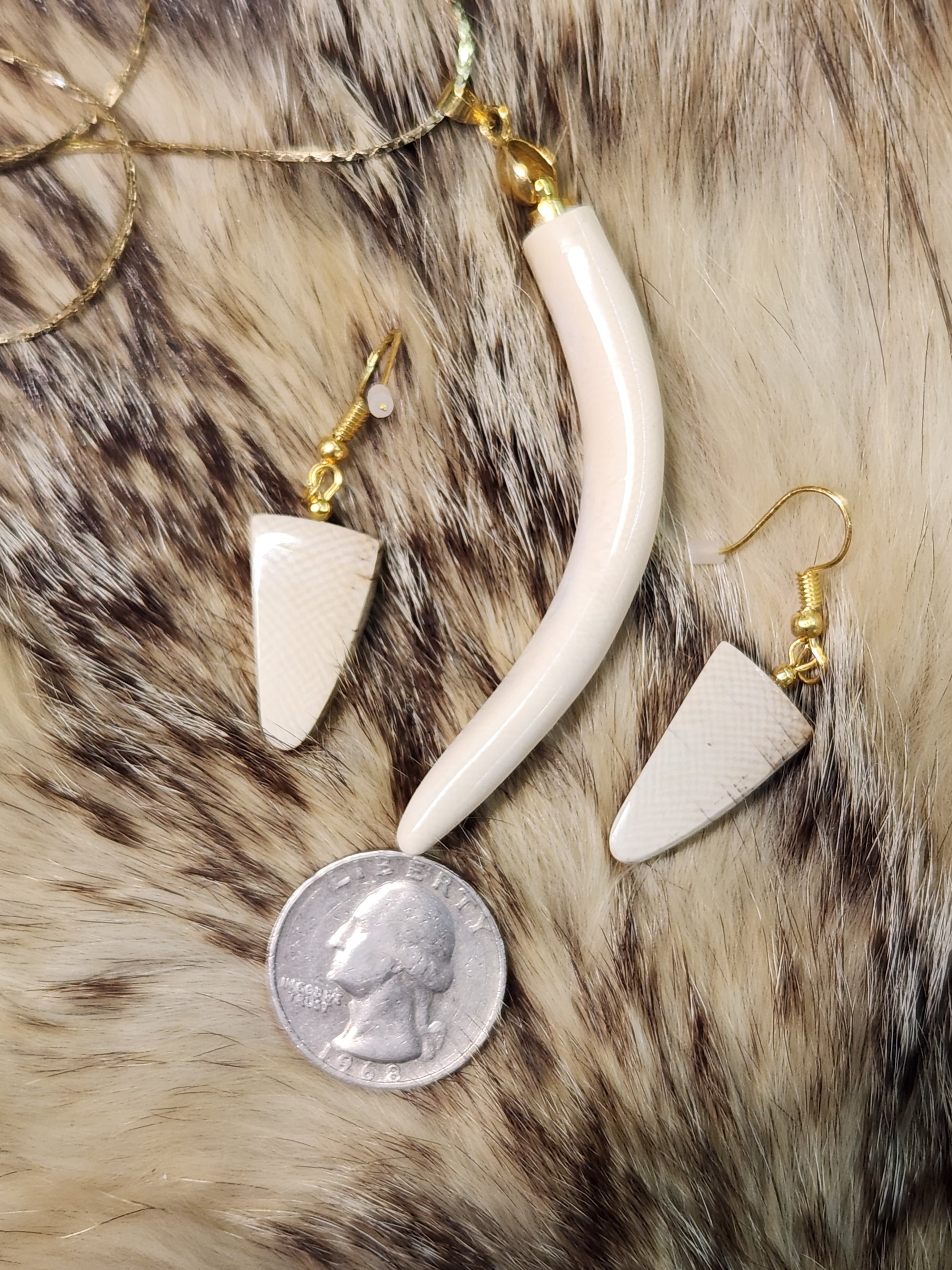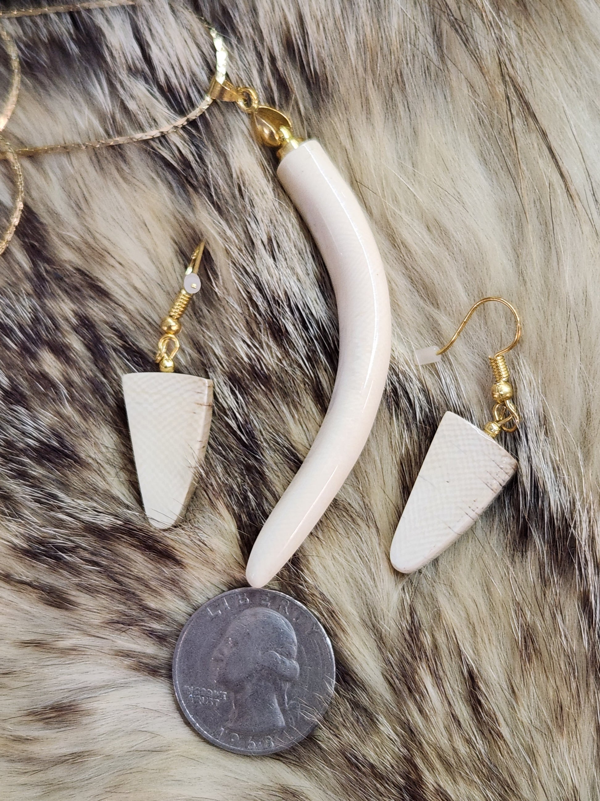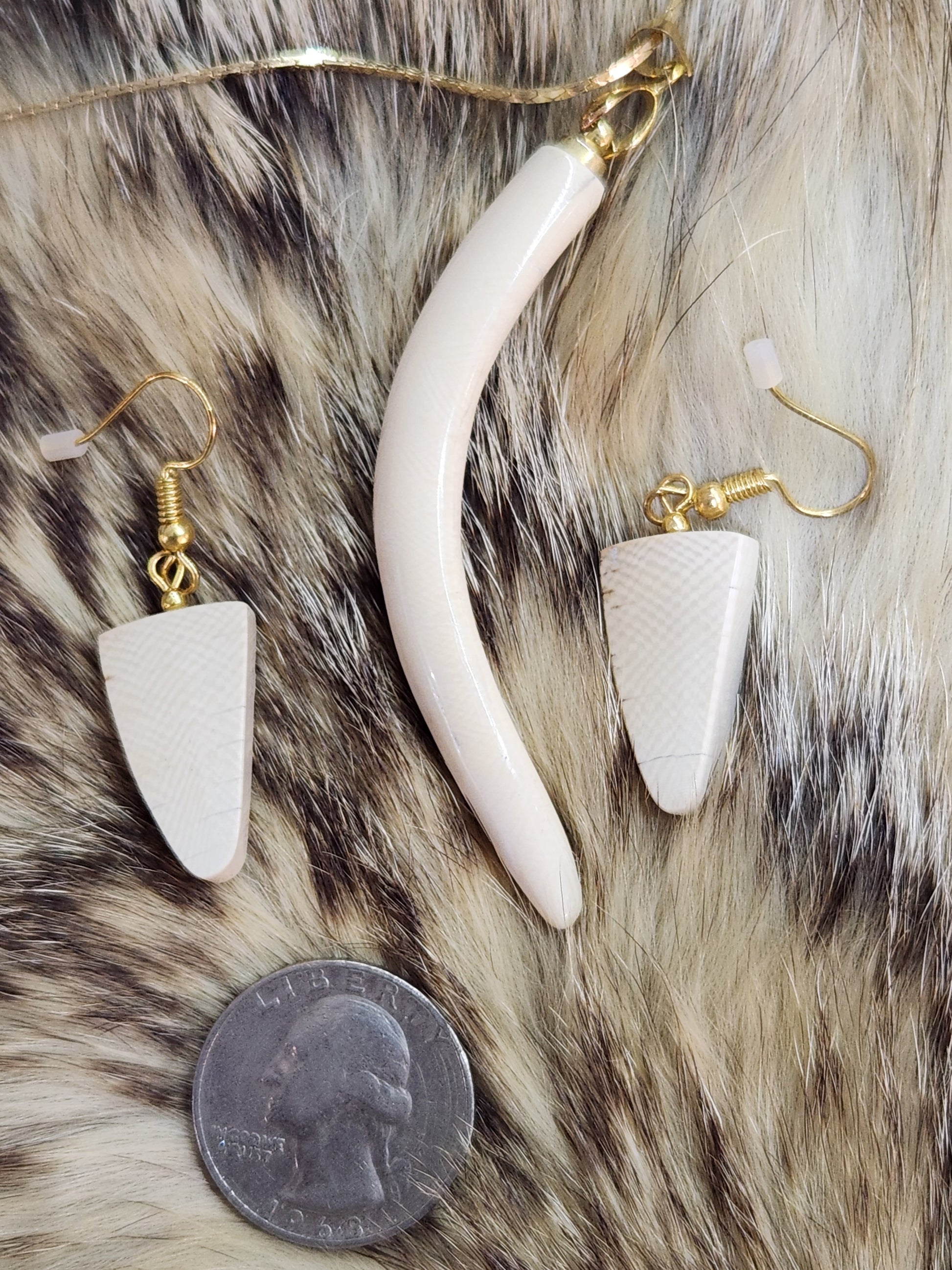 This exclusive neckless and earrings are handcrafted by me here in the shop from 15,000 to 25,000-year-old mammoth ivory, sourced from Siberia. Each piece is adorned with 14kt gold-plated fittings for an elegant look and natural age-related checking for added character. Designed to be timeless and treasured, this neckless is the perfect gift for your special someone. It comes in a zip-up storage case.