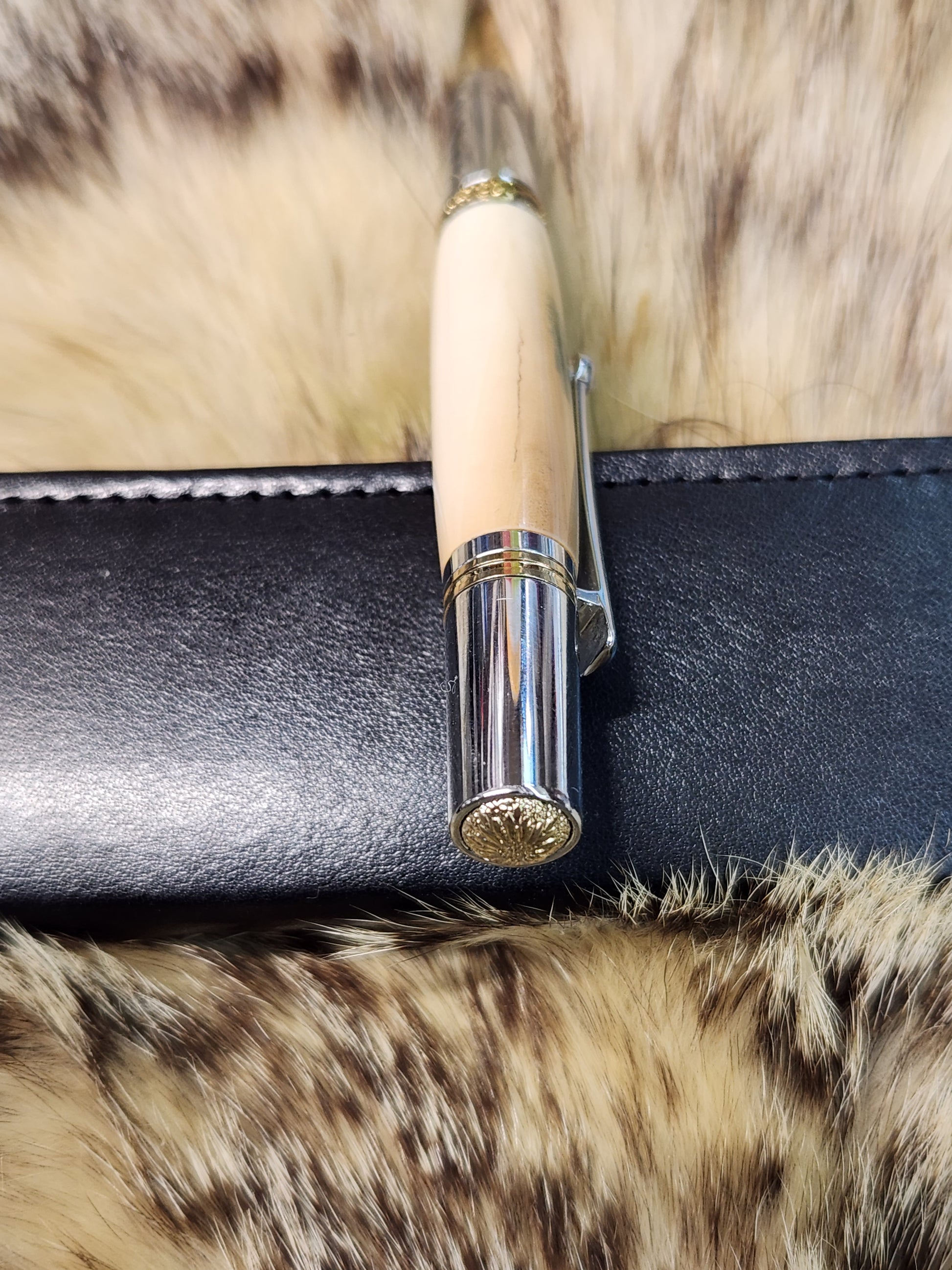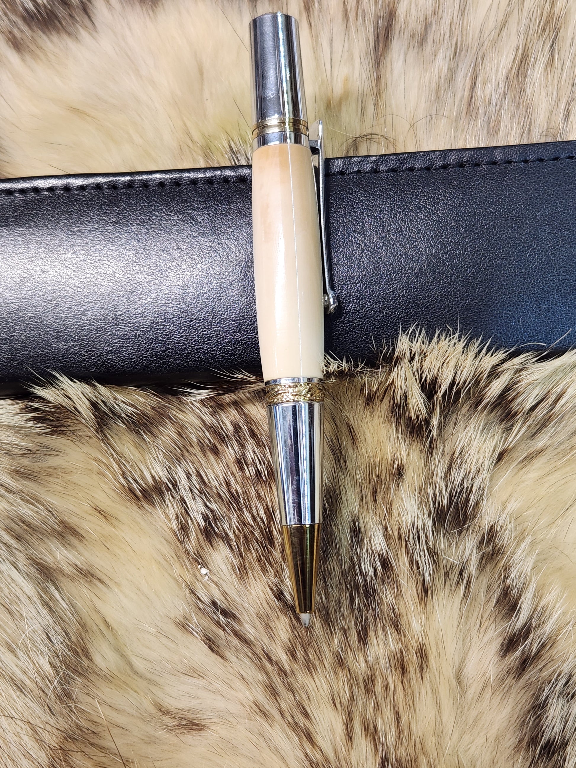 Custom Majestic squire style pen made from mammoth ivory, the mammoth ivory looks great and does have some very very minor checking in the ivory as most mammoth ivory does because of its age and filled with resin, the mammoth ivory will Date between 15,000 and 25,000 years old and was found in Alaska's perma frost region, This little gem will make a great gift for the person who has everything, comes with custom storage box, No international sales