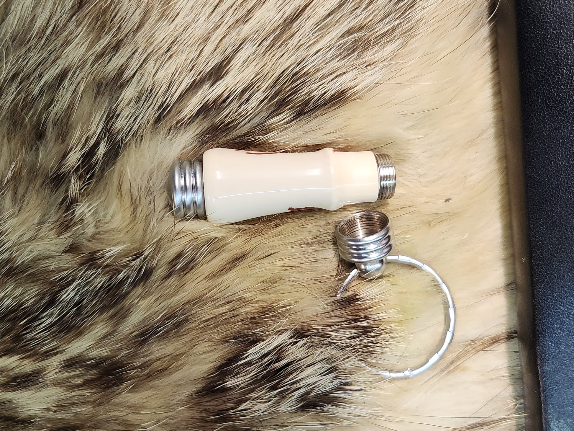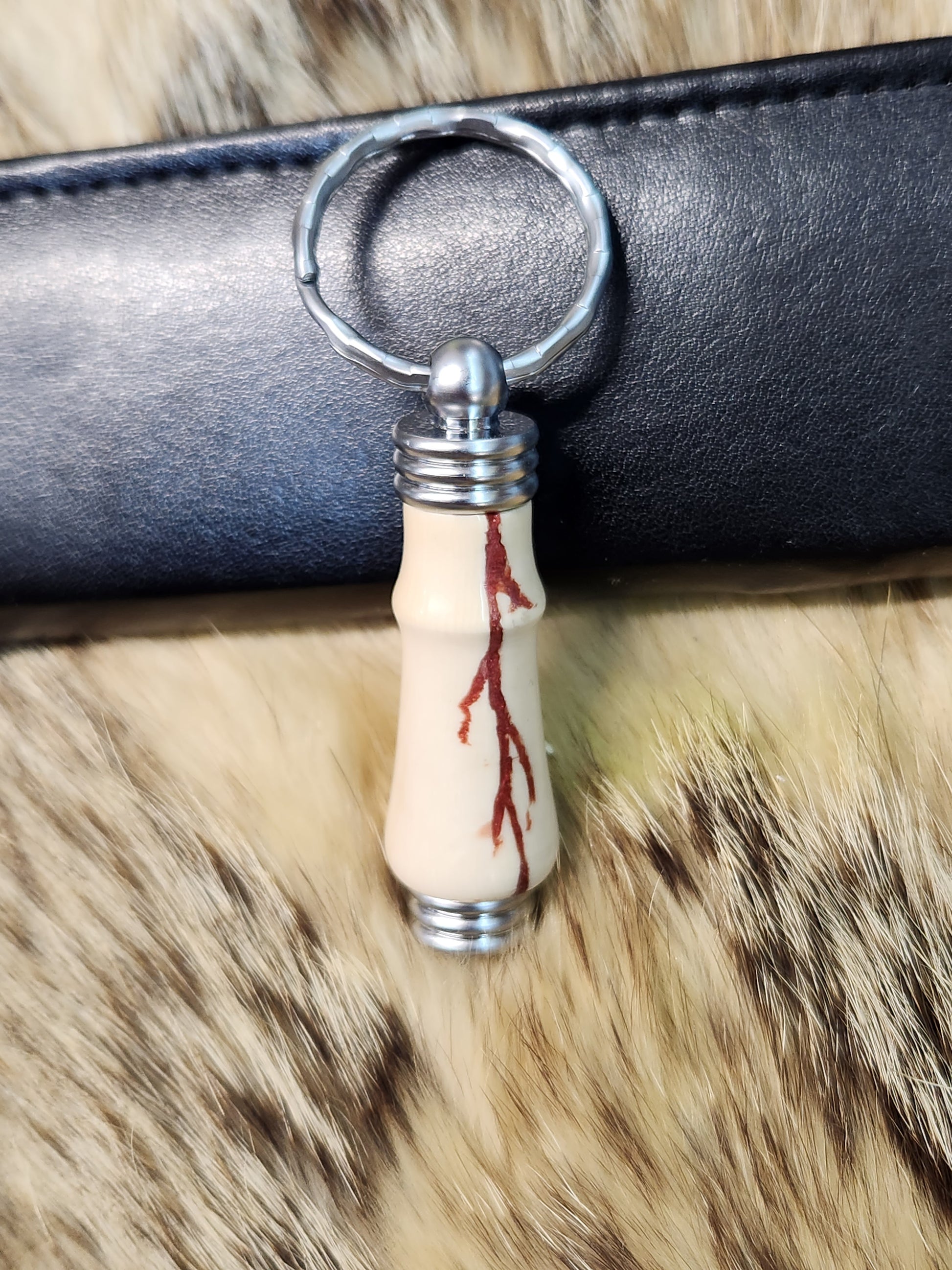 Custom Made Mammoth Ivory Key chain Hidden Compartment, Top Of key ring unscrews to reveal a nice little compartment for anything small you want on hand, the mammoth ivory looks great and does have some very minor checking in the ivory as most mammoth ivory does because of its age, i filled the cracks with red resin and reshaped them a bit so its not so straight. the mammoth ivory will Date between 15,000 and 25,000 years old and was found in Siberia Russia in the perma frost region, This little gem will make a great gift for the person who has everything, No international sales