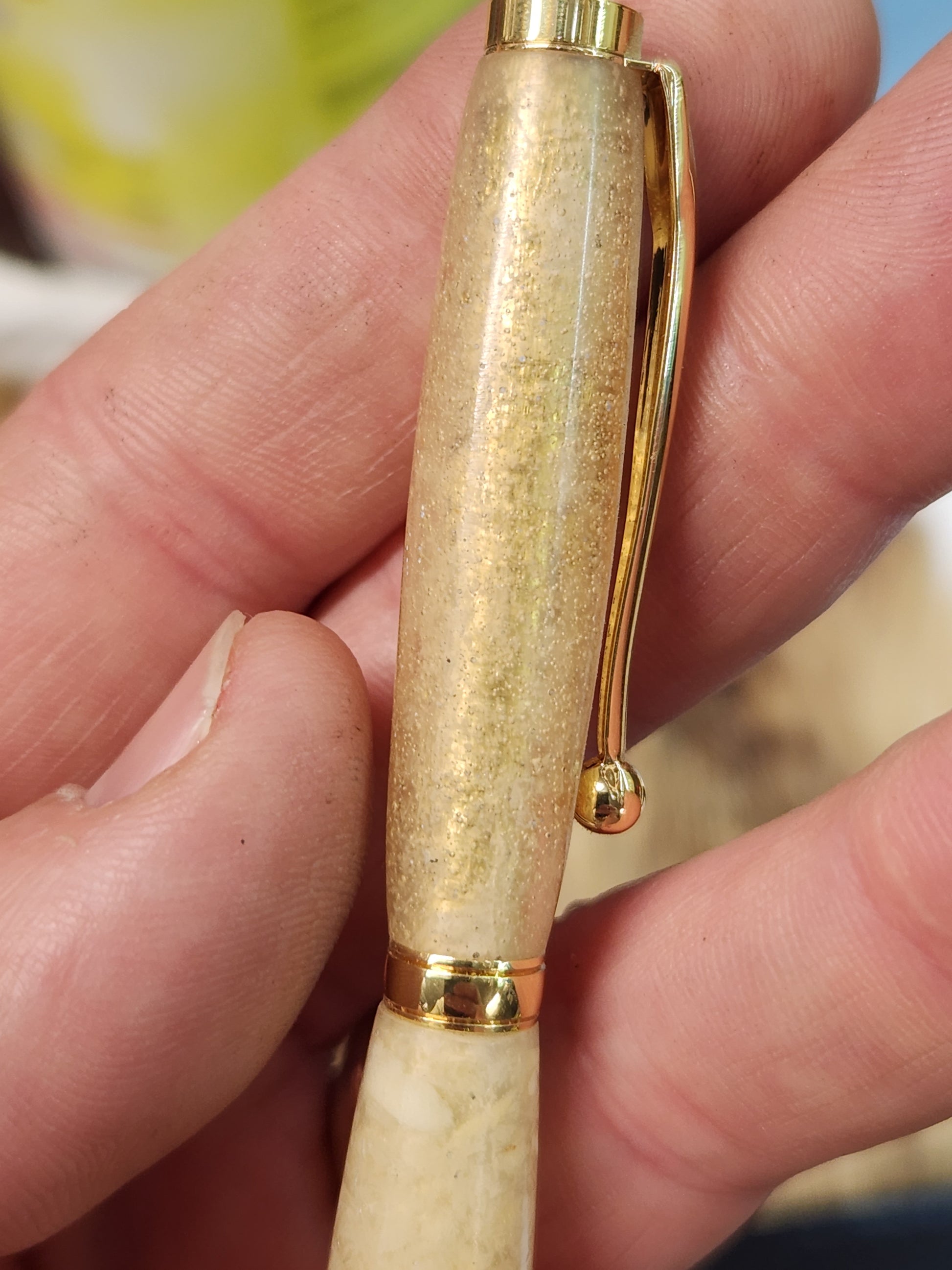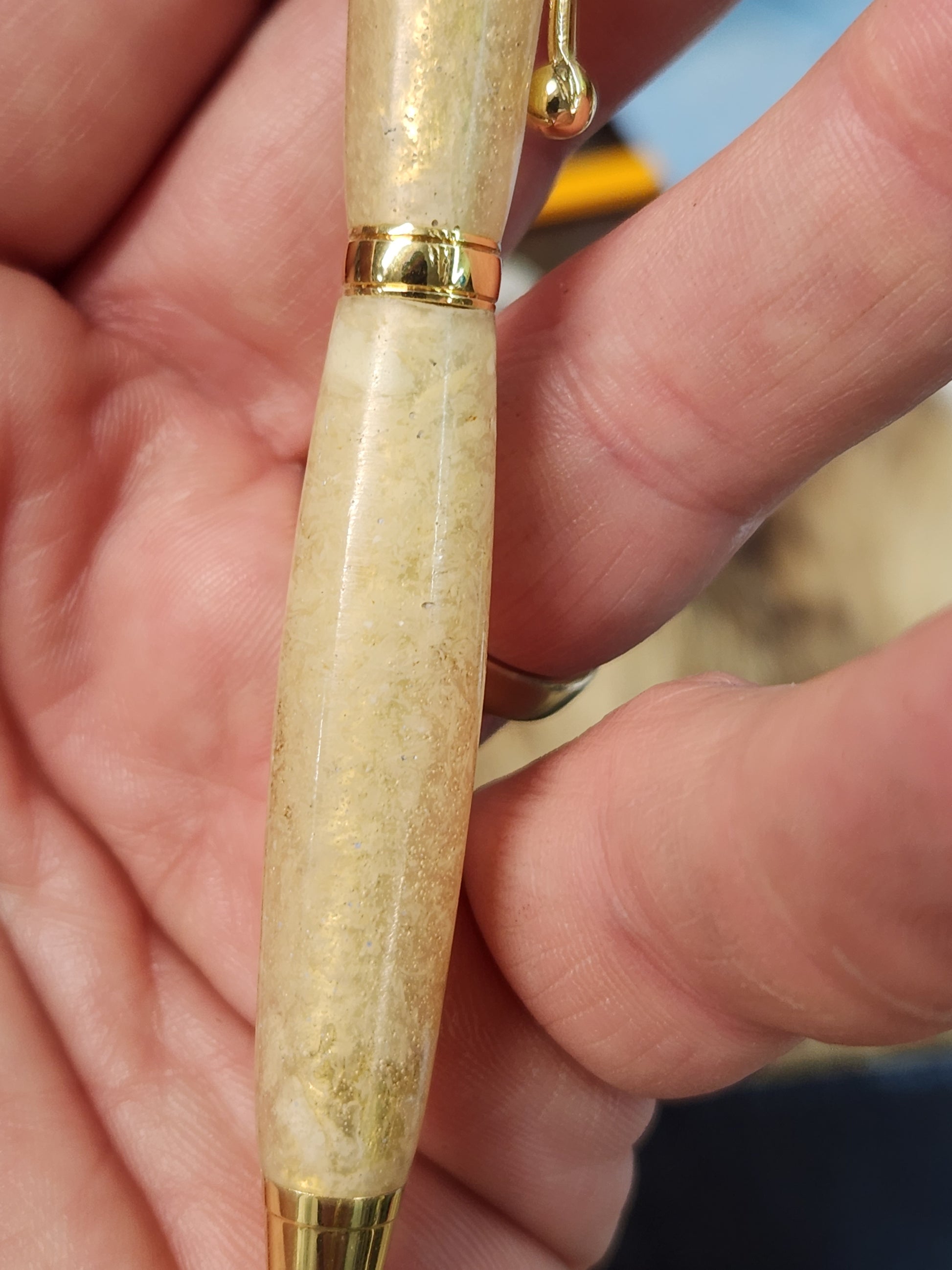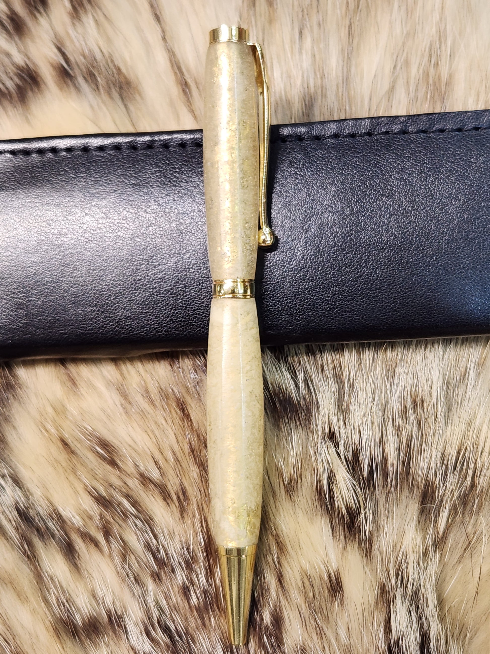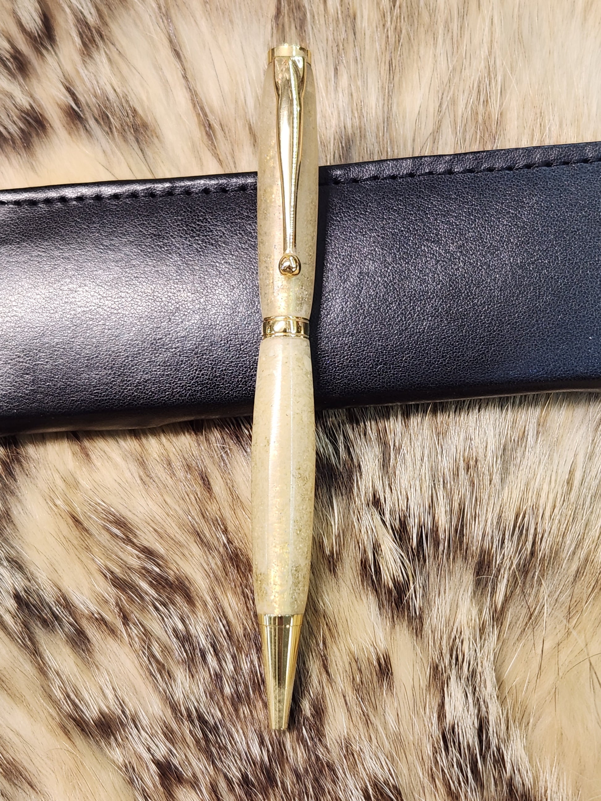 This pen is crafted from a special combination of mammoth ivory shavings, resin and 14kt satin gold plated fittings, making it a truly unique writing implement. The mammoth ivory dates back between 15,000 and 25,000 years, sourced from the permafrost region of Siberia, Russia. Pen comes with a custom storage or display box.