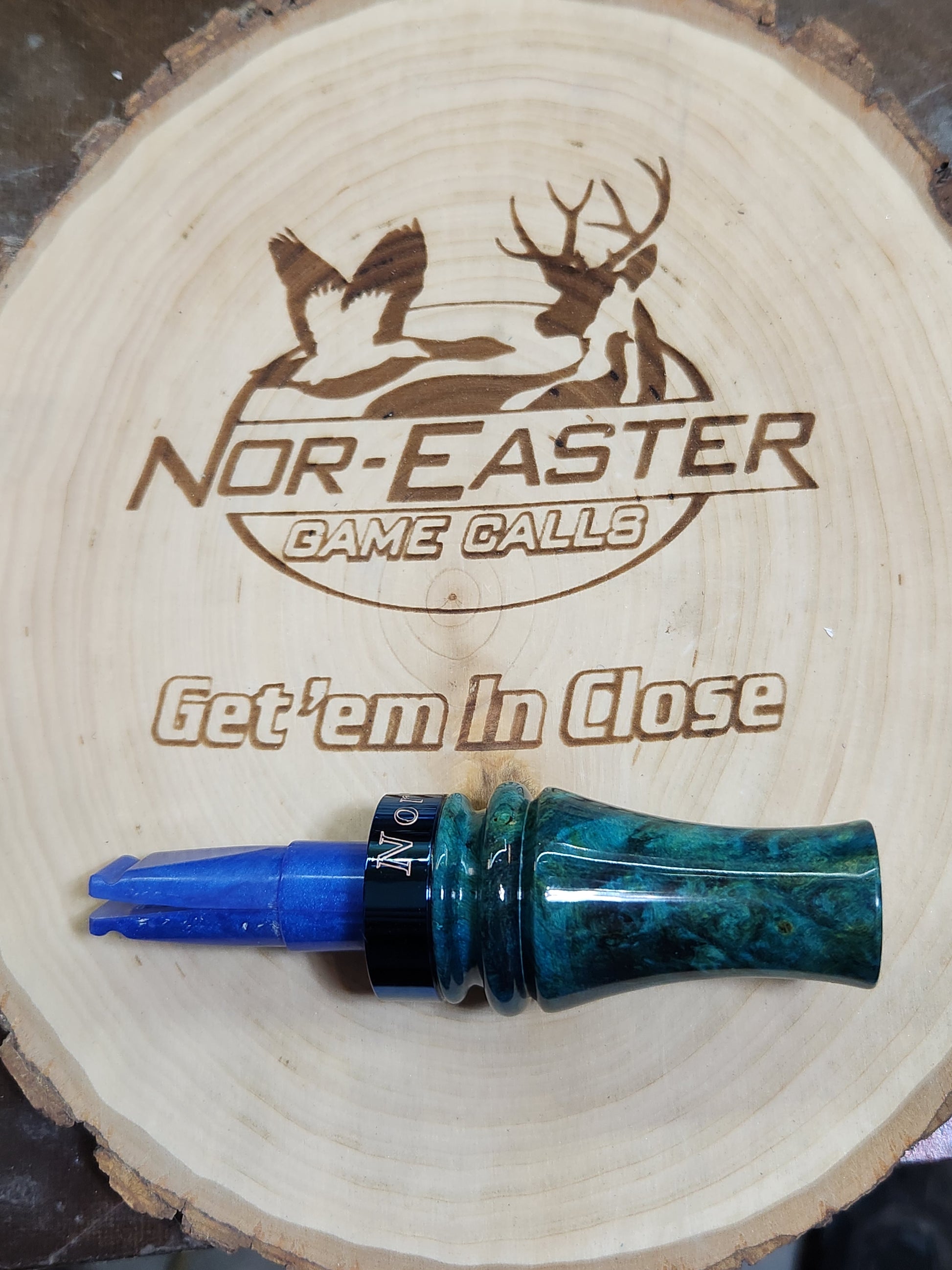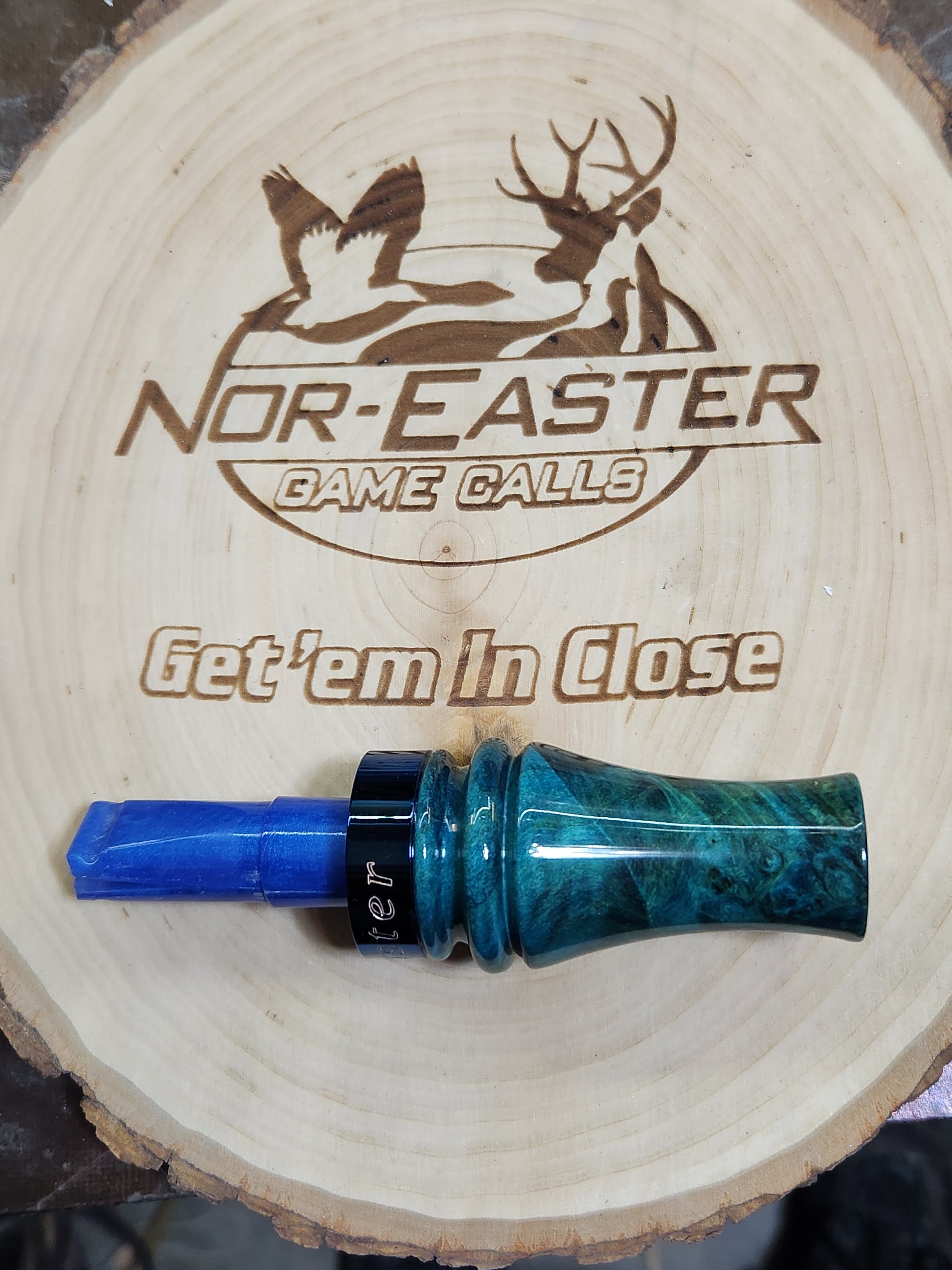 This is a custom crow call made from stabilized and dyed maple burl wood. The custom tone boards are made here in the shop and the reeds are hand cut and then the call is tested and adjusted for tone, very easy to use for the beginner or seasoned caller. Call will come with a free lanyard, storage pouch and nor'easter sticker,