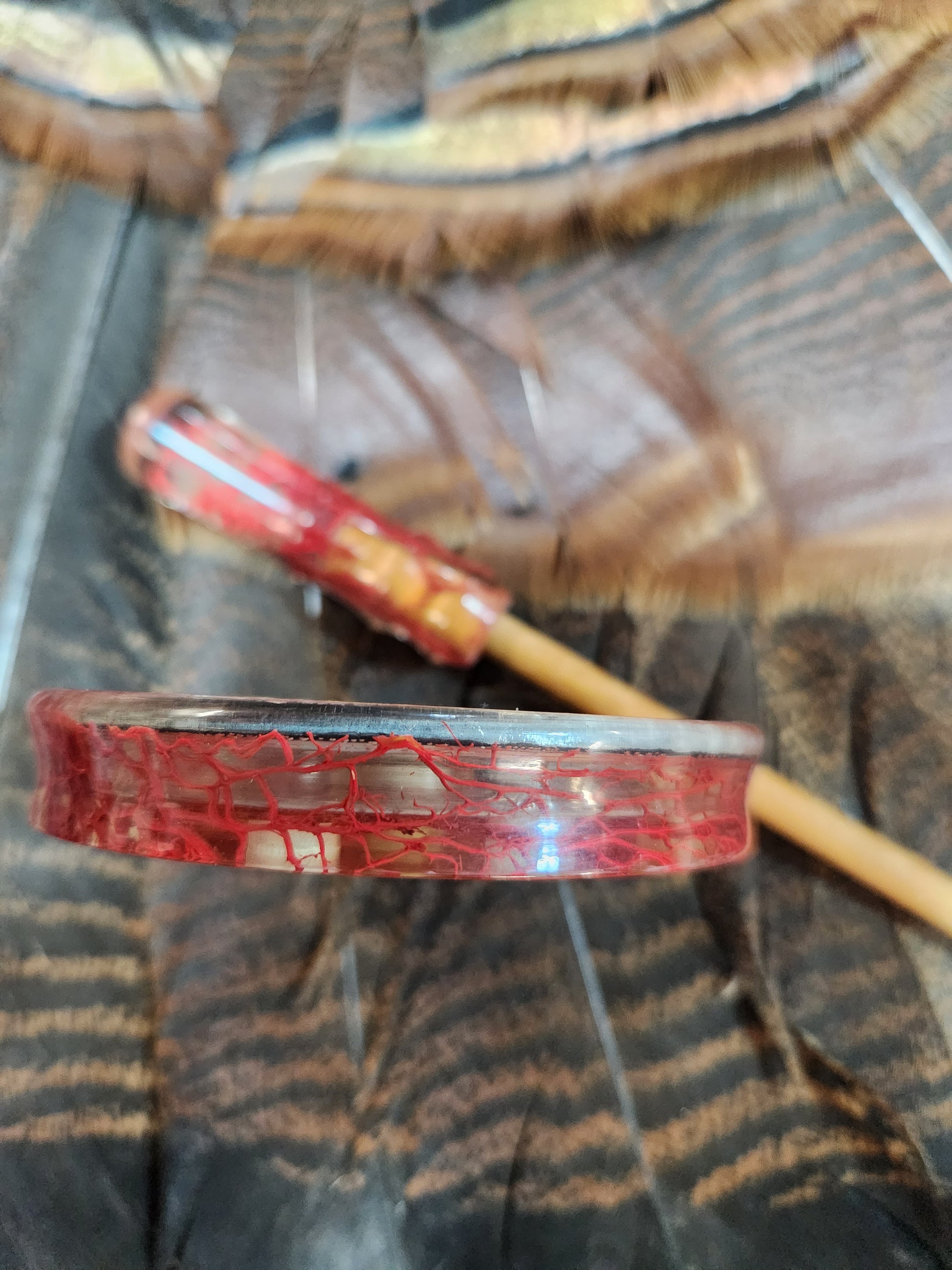 This is the blood series turkey pot call designed by myself. Its made from alumilite resin and dyed blood red prickly pear cactus to resemble arteries. These calls are made one at a time by me including the custom striker. This is a thin series with grey slate with no sound board. We have been using this design for over 5 years with great results putting many Tom's to rest. So jump on this custom pot call and make some noise. This call can break through the windy days and still play soft to get'em in close. Call comes with custom striker, storage pouch and nor'easter vinyl sticker.