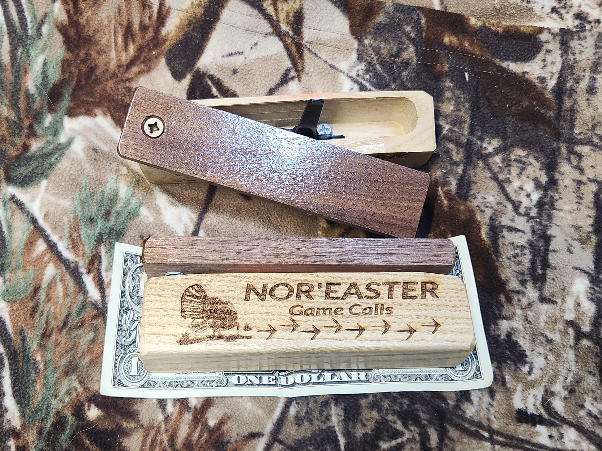 This is the Nor'Easter Lil' Clucka, This little call can do it all, at only 4-7/8 long 7/8 wide and 2 inches tall it will fit in your shirt pocket, but thats not all, this call can cluck and yelp with the best of them, yelp away with the sound of a nice young Bird then open the call flip up the ABS tab and the lid will rest against the tab so all you have to do is lightly hit the lid into the tab for some great clucks you can go slow or fast with just a tap to the lid, call is made from Oak and Walnut, Sorry no hidden chalk vile in this little guy just no room in the call.