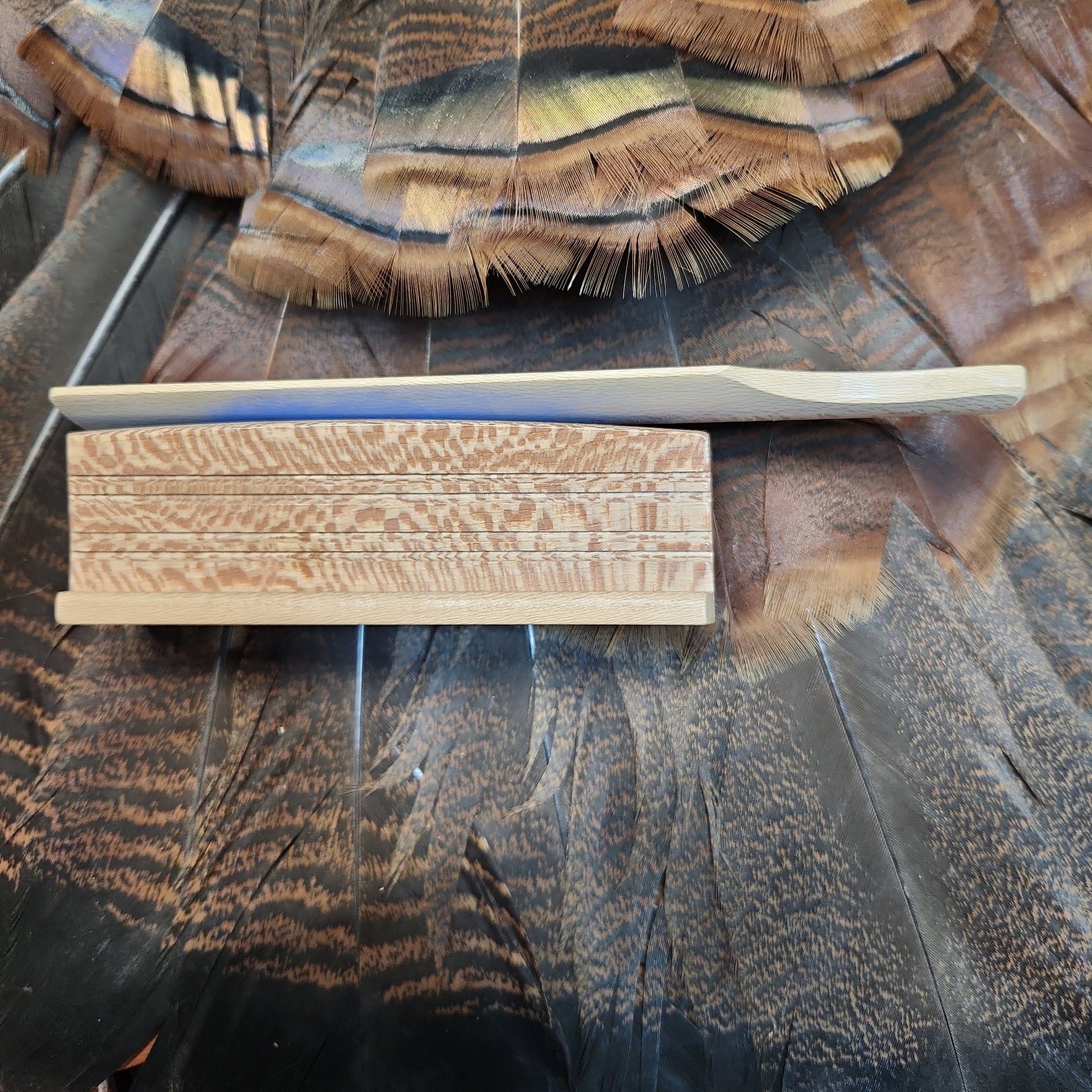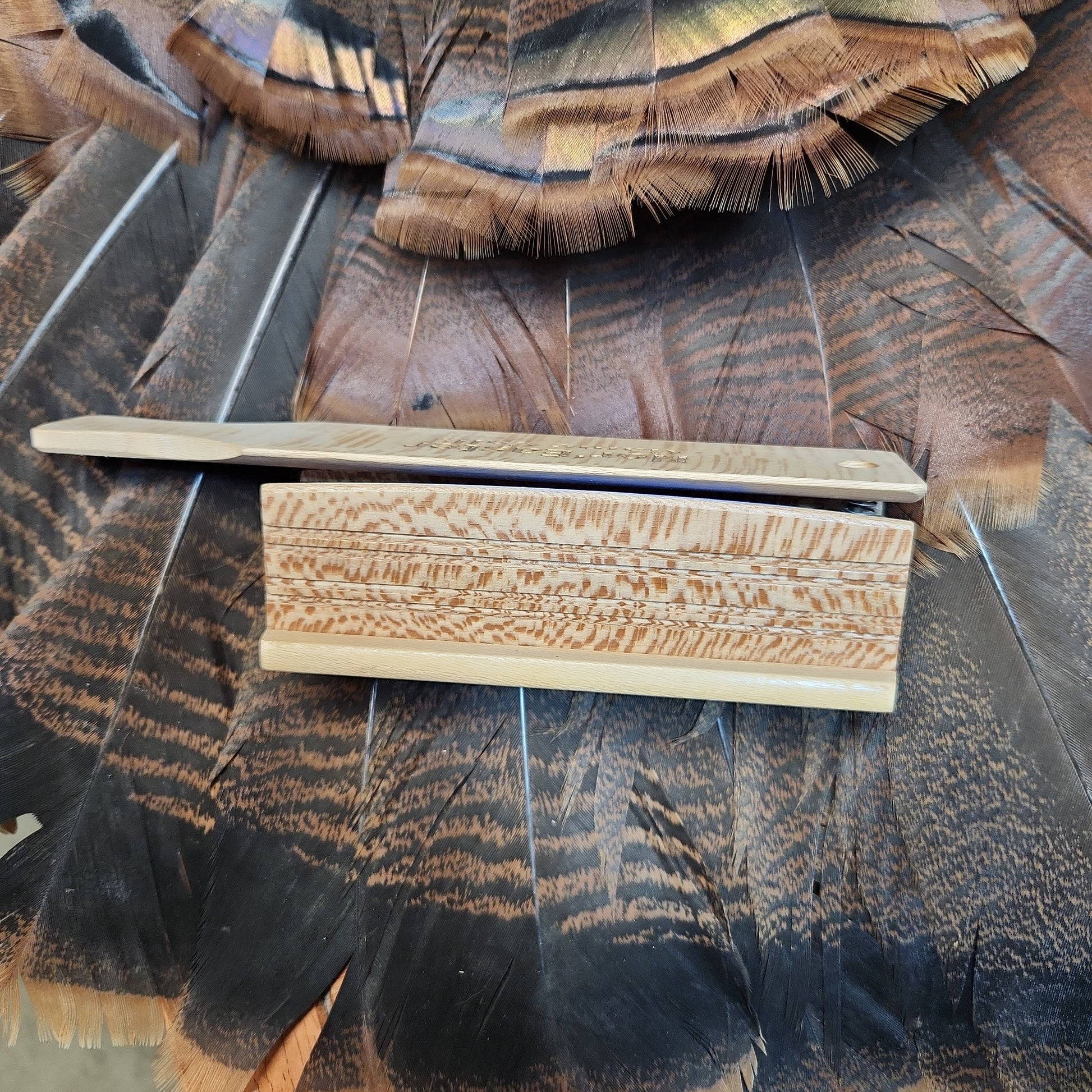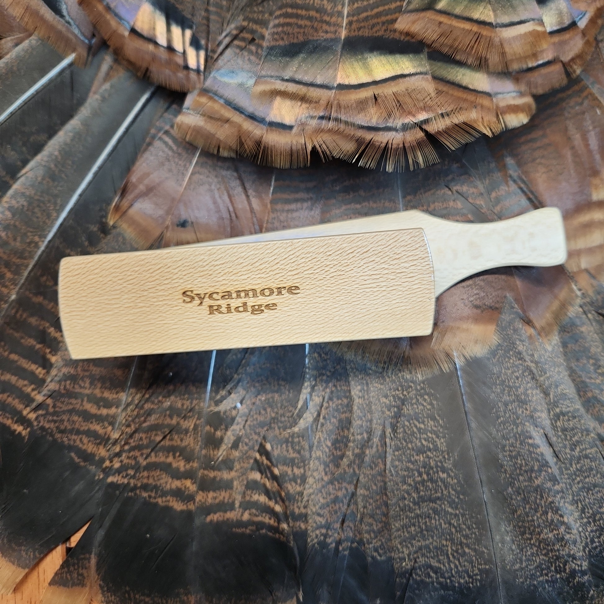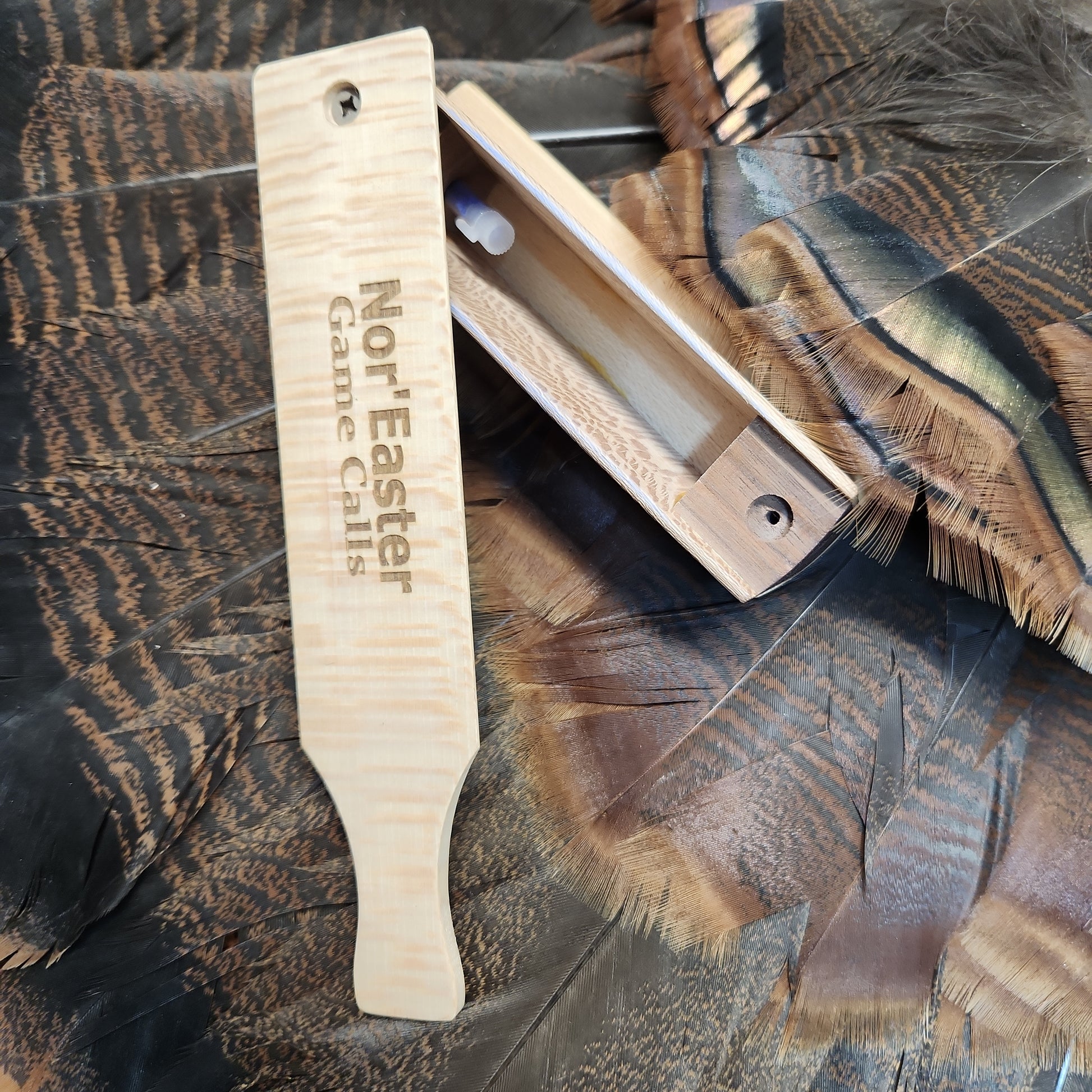 This is the Nor'Easter game calls Sycamore Ridge box call all Sycamore Lacewood construction, 8-1/2 inches overall 1-3/4 wide and 2 inches tall, this little call sounds great for mature tom to a young jake, The Lacewood gives a tone that most calls just cant give and is very easy to use for the beginner to pick up and call in the wary tom, Also all my Box calls come with a hidden vile of chalk inside the box to re-chalk the paddle in the field. if you every wanted a box call that sounds great and easy to use this is it. I'm only taking one picture of the calls so yours may vary every so slightly as they are all very very close in looks,