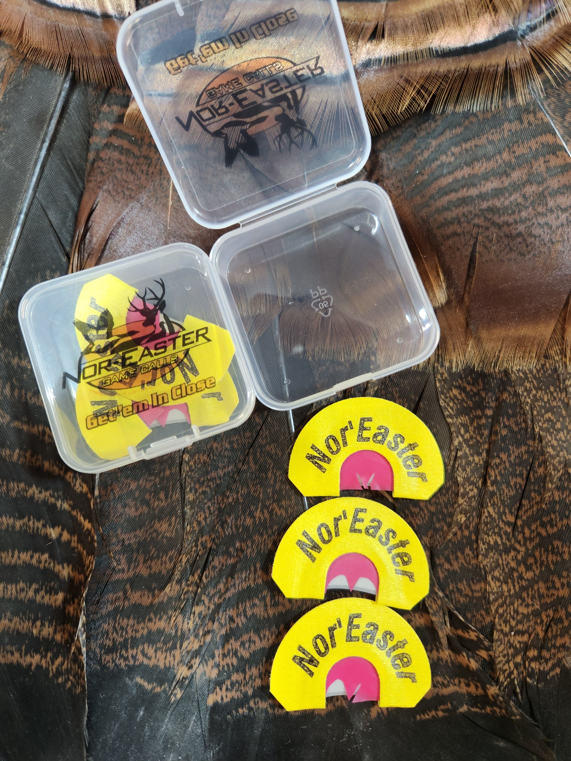 This is a full set of the Nor'Easter widow maker mouth calls they are a three reed set up you get the most common cuts. Bat wing, shipwreck, and the V cut each call is made right here in the shop by me. These calls have been field tested by a large group of hunters including myself. Check my Instagram account to see just how many birds couldn't resist these calls. Well proven and ready for you to take on your next hunt. They will ship for free and colors may vary they also come in the nor'easter carry case.