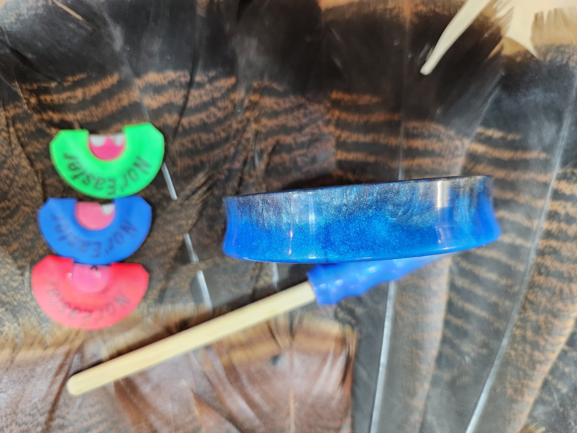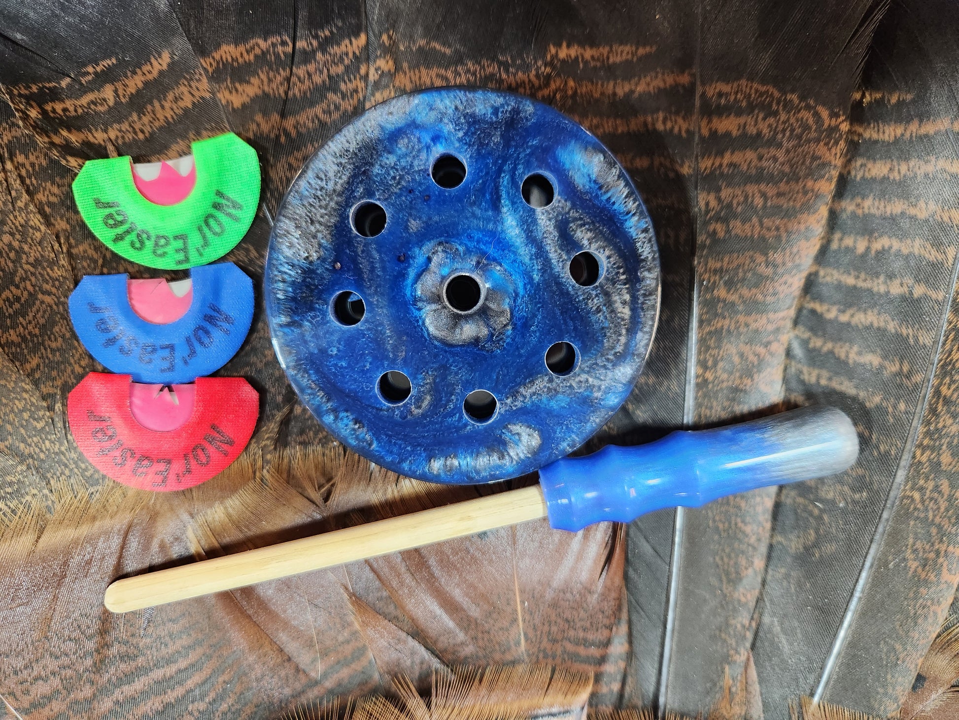 This is the new windbreaker turkey pot call made from alumilite resin and a set of cheating hen mouth calls making a slam set. These calls are made one at a time by me including the custom striker and mouth calls. This series is anodized black aluminum over glass. We have been working on this design for almost 5 years tweaking it here and there. We gave it a good test run last year and the results where great. So jump on this custom pot call and make some noise. This call can break through the windy days and still play soft to get'em in close. Call comes with storage pouch and nor'easter vinyl sticker.