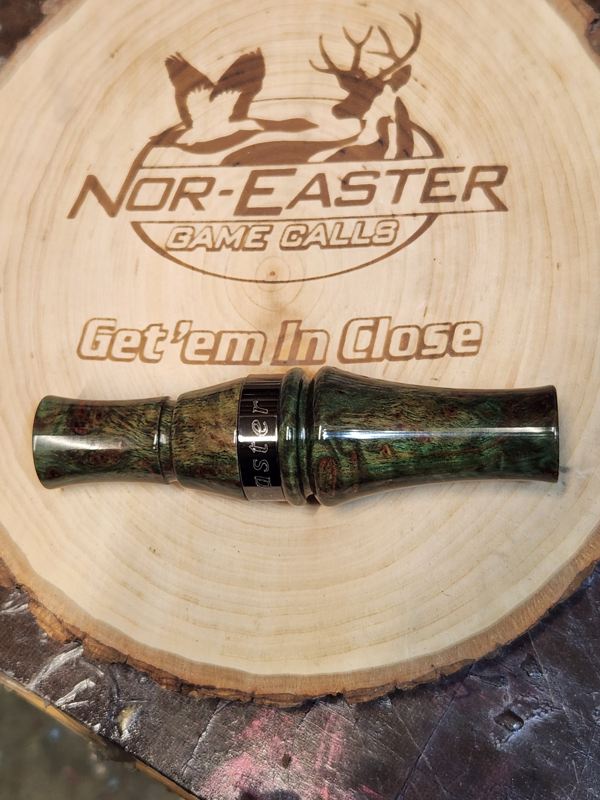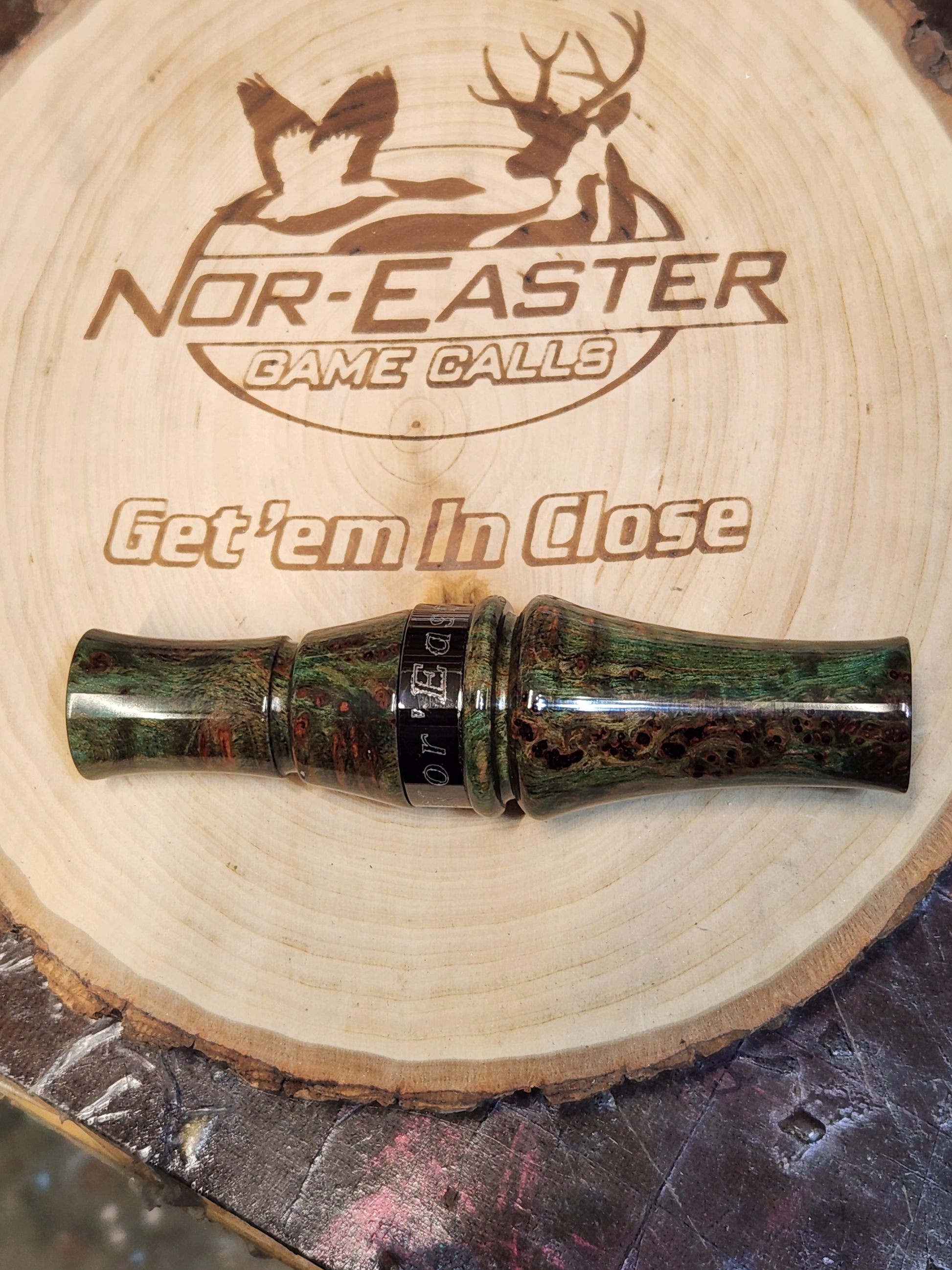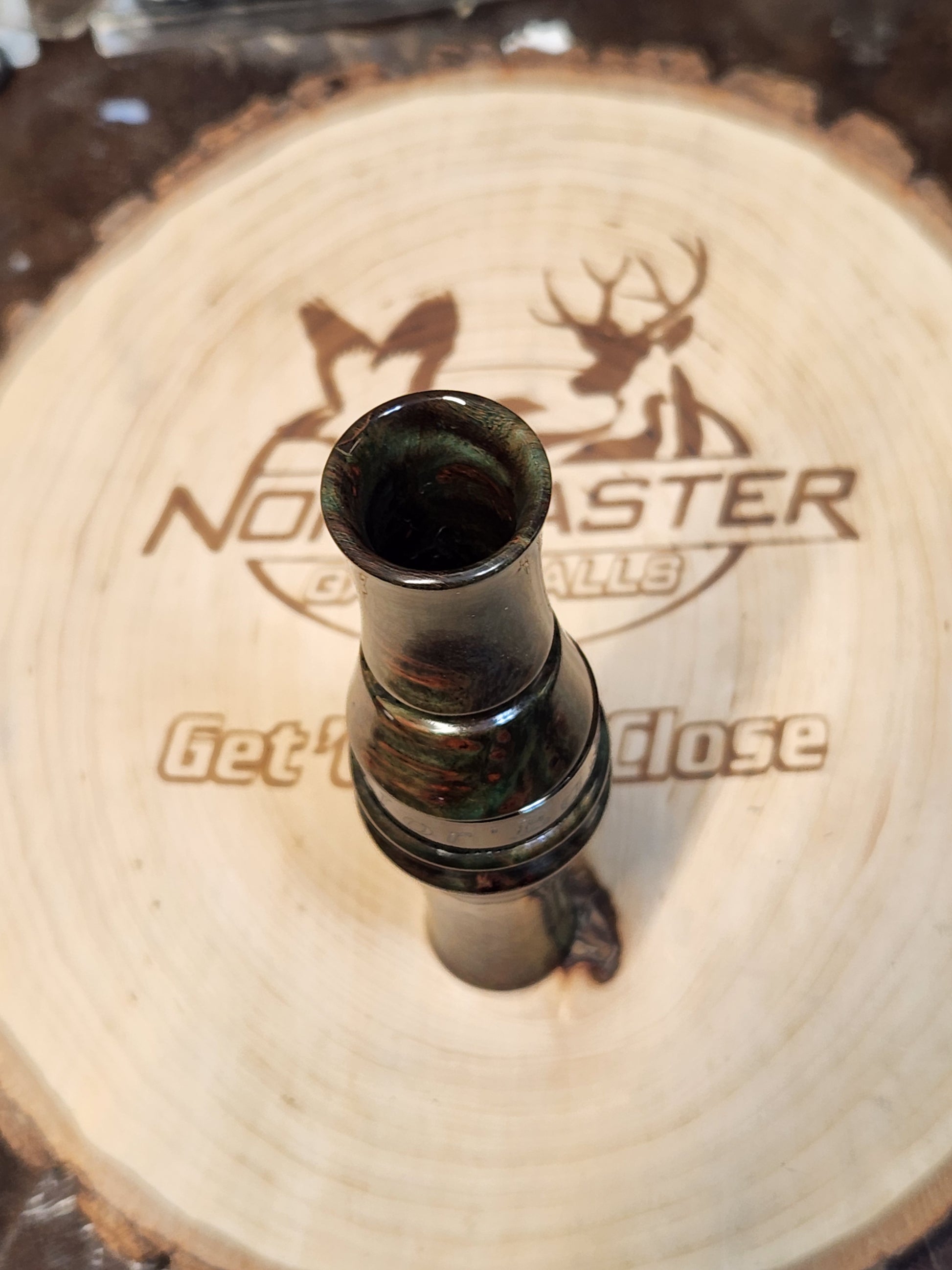 Thus is a short reed goose call made from stabilized and dyed redwood lace burl wood, great looking call and sounds amazing, the short reed tone board and wedge is made right here in the shop with lots of adjustments for the user to make if necessary. Comes with free lanyard and nor'easter storage pouch along with a nor'easter vinyl sticker.
