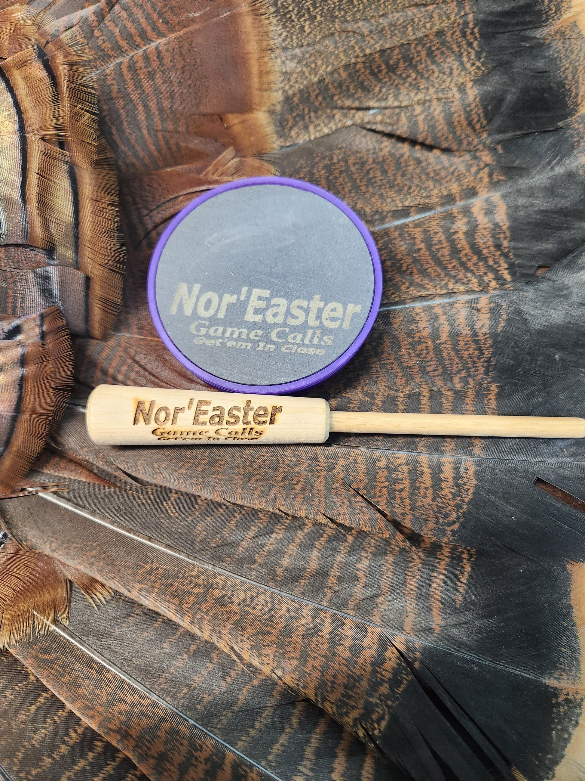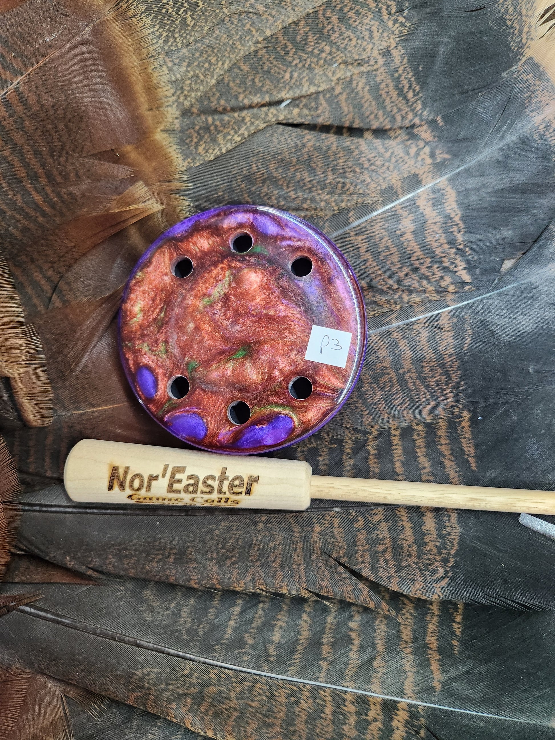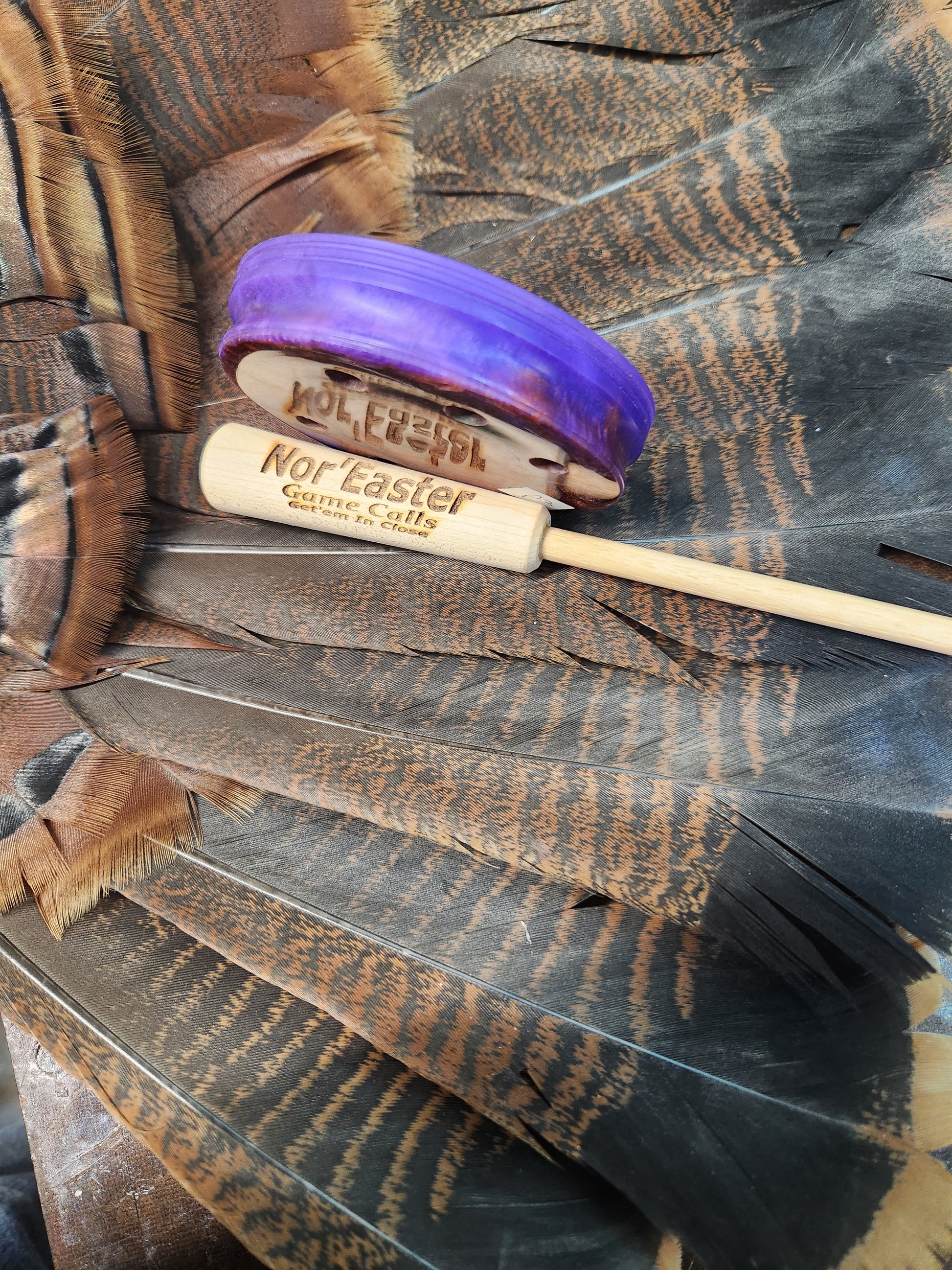 This is the new screamer turkey pot call made from alumilite resin. These calls are made one at a time by me. This series is grey slate 3.5 inch playing surface with no sound board, i have been working on this design for years tweaking it here and there for use with no sound board but tons of volume. I gave it a good test run last few years and the results where great. Just check out all the turkeys that got wacked by hunters using thus screamer call, So jump on this custom pot call and make some noise. This call can break through really windy days and still play soft to get'em in close. Call comes with storage pouch and nor'easter vinyl sticker.