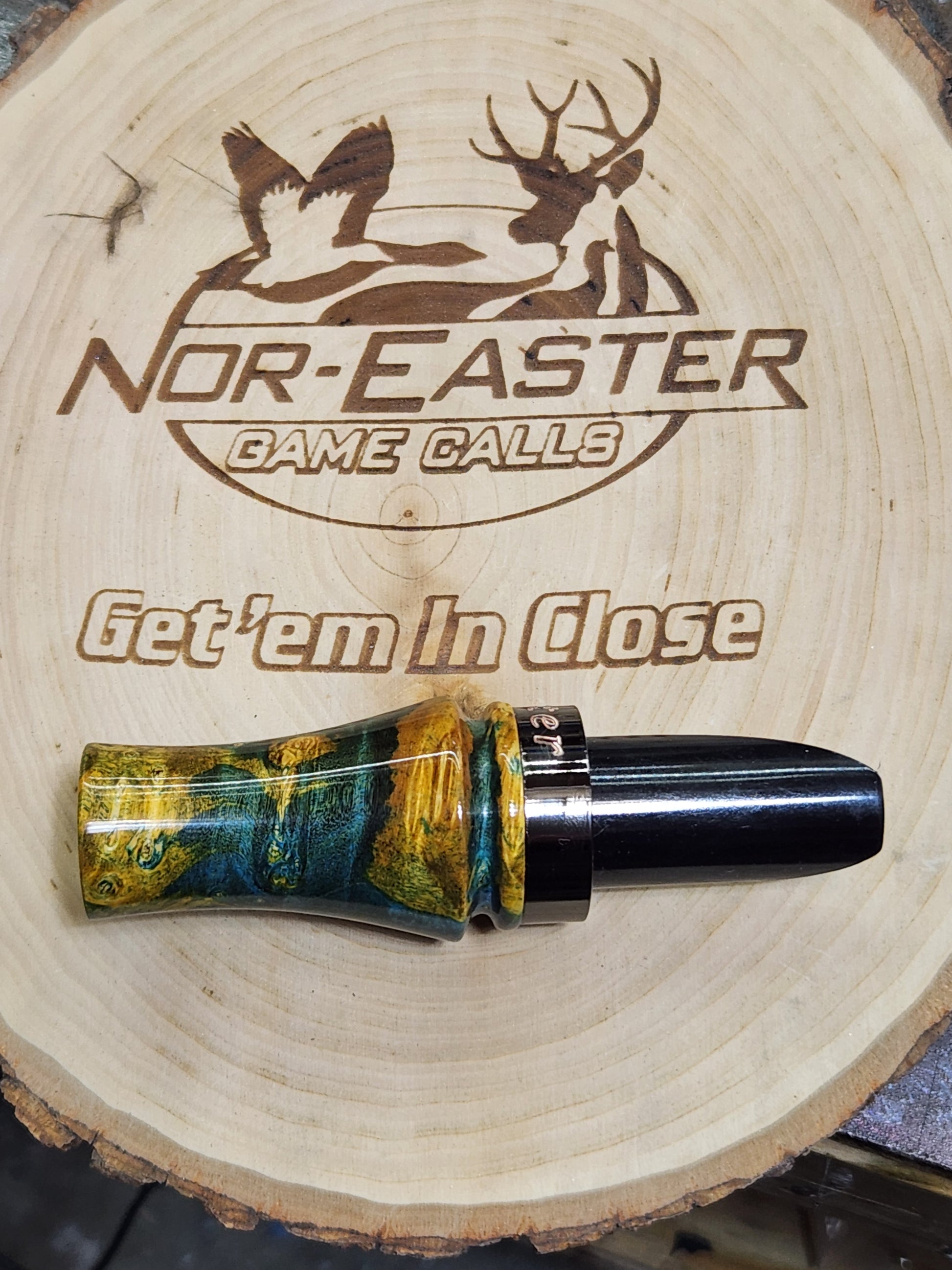 For a few years I have been asked to design a Sika deer call and with some help from some of the biggest Sika deer hunter we have finally nailed it down. I build the calls one at a time including making the sound boards and cutting all the reeds then tune each one. This one is made from stabilized and dyed boxelder burl wood with a gun metal band engraved with my logo also done here in the shop. Call comes with free lanyard, game call storage bag and of course a Nor'Easter vinyl sicker