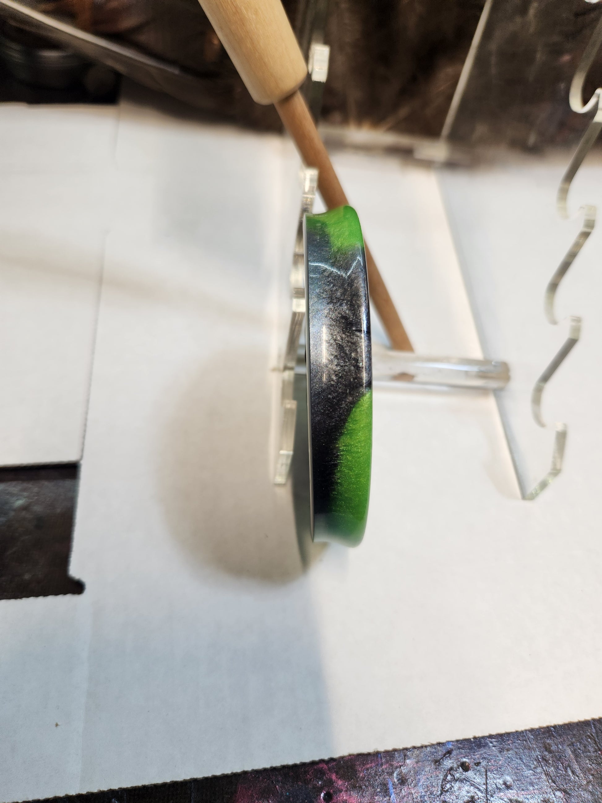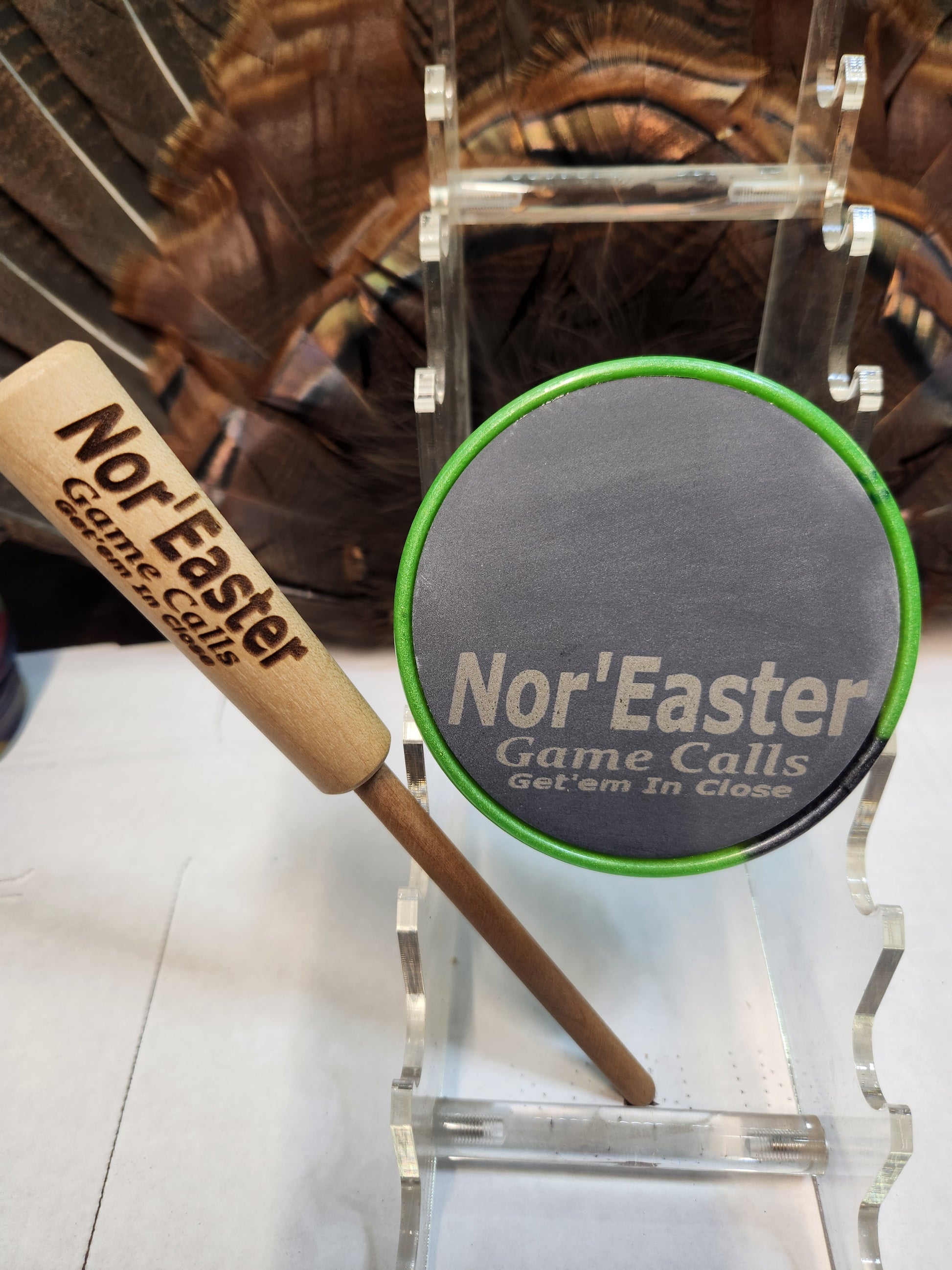 This is the new windbreaker turkey pot call designed by myself. Its made from alumilite resin. These calls are made one at a time by me. This is a thin series with grey slate with no sound board. We have been using this design for almost 6 years with great results putting many Tom's to rest. This one does NOT have a custom turned striker to help bring the cist down but does come with a standard striker. So jump on this custom pot call and make some noise. This call can break through the windy days and still play soft to get'em in close. Call comes with custom striker, storage pouch and nor'easter vinyl sticker.