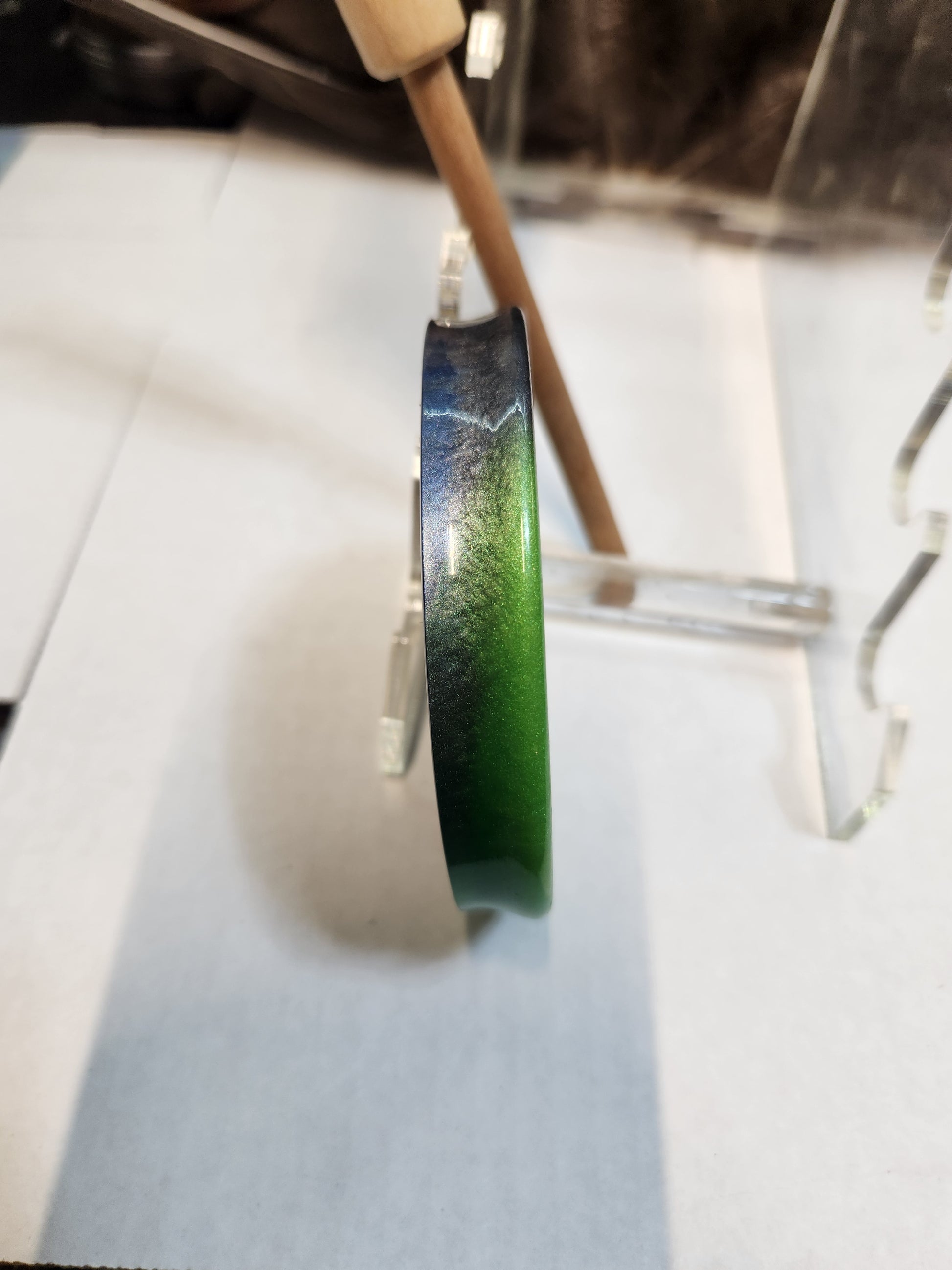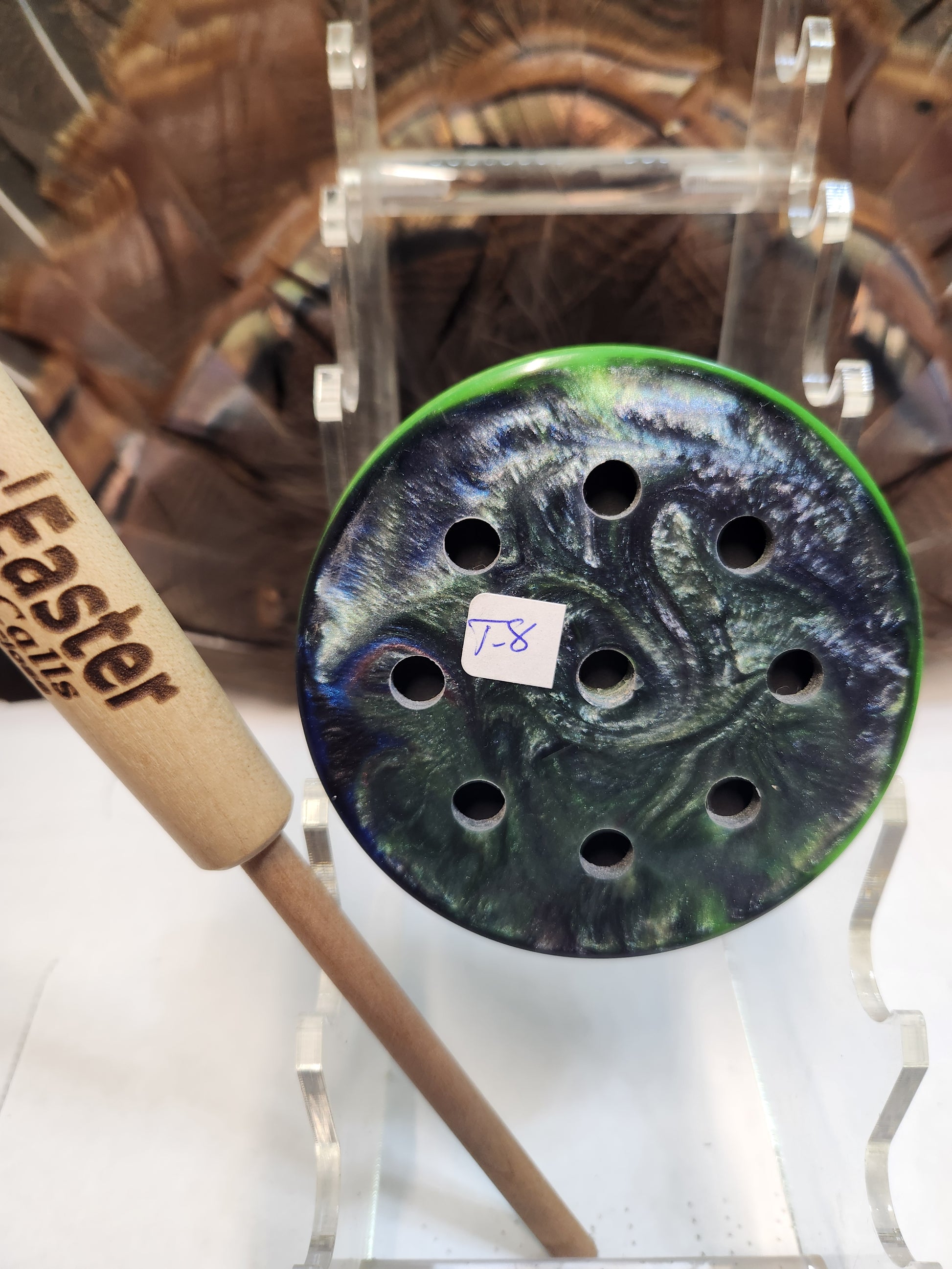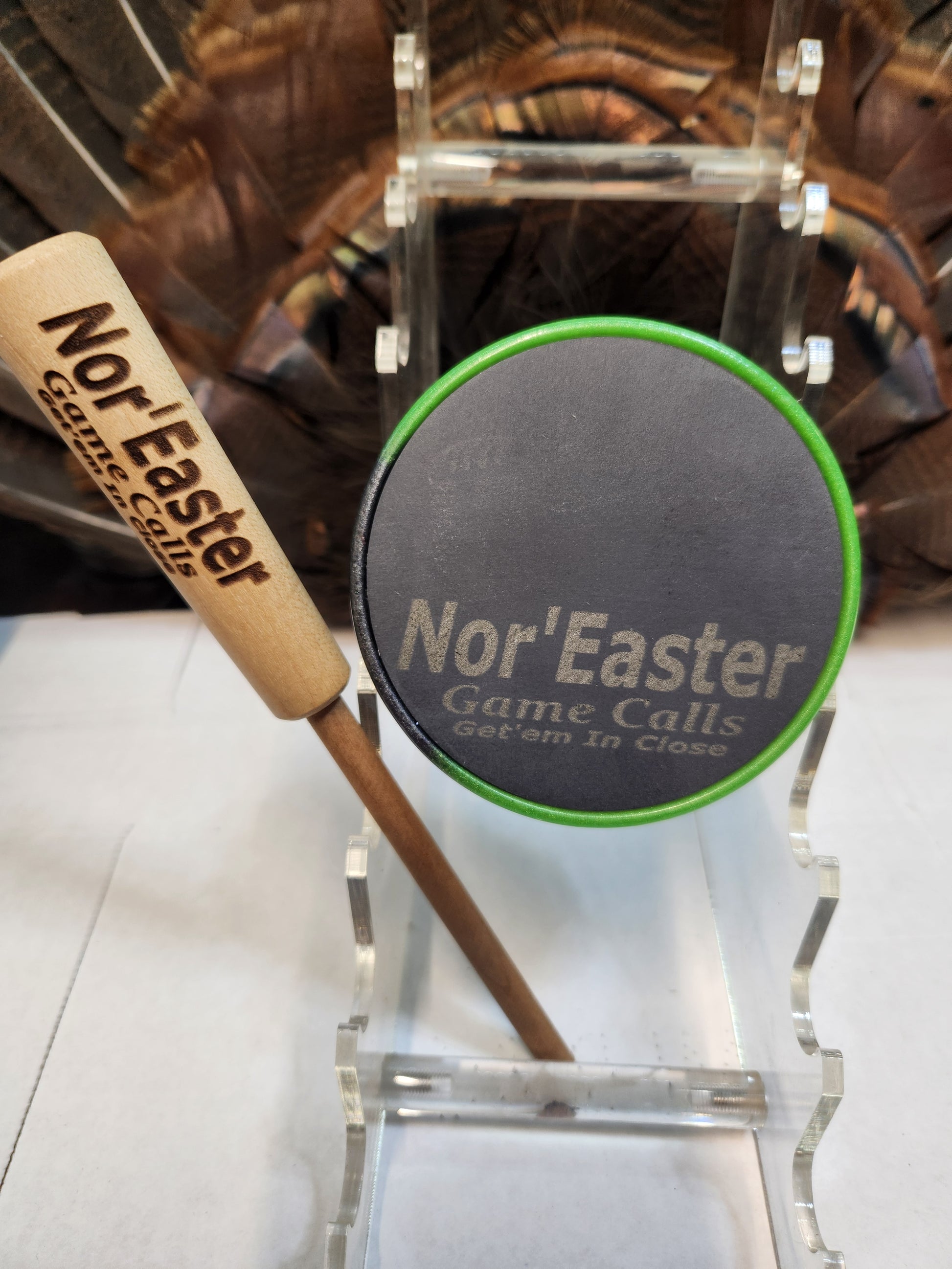 This is the new windbreaker turkey pot call designed by myself. Its made from alumilite resin. These calls are made one at a time by me. This is a thin series with grey slate with no sound board. We have been using this design for almost 6 years with great results putting many Tom's to rest. This one does NOT have a custom turned striker to help bring the cist down but does come with a standard striker. So jump on this custom pot call and make some noise. This call can break through the windy days and still play soft to get'em in close. Call comes with custom striker, storage pouch and nor'easter vinyl sticker.