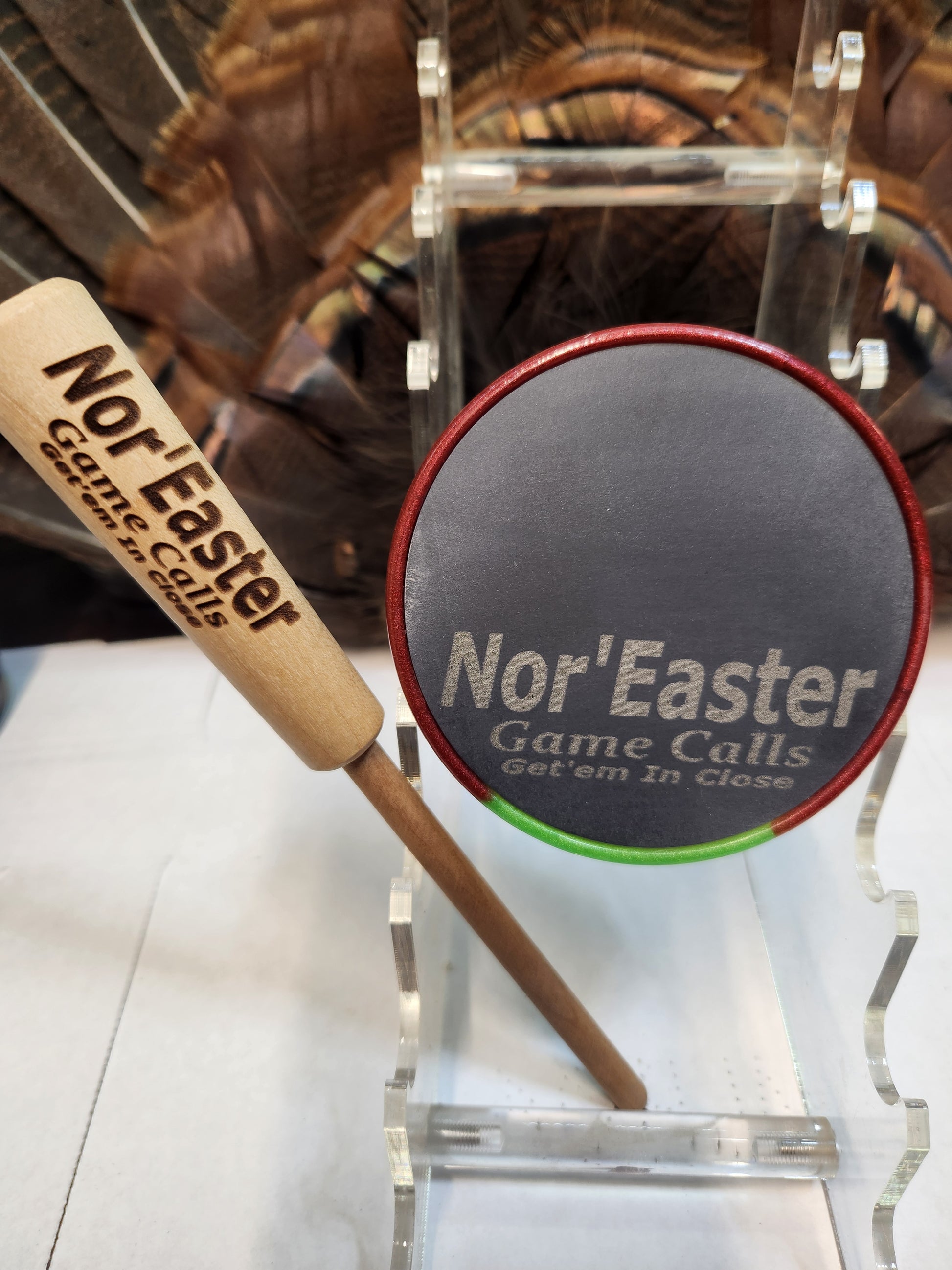 This is the new windbreaker turkey pot call designed by myself. Its made from alumilite resin. These calls are made one at a time by me. This is a thin series with grey slate with no sound board. We have been using this design for almost 6 years with great results putting many Tom's to rest. This one does NOT have a custom turned striker to help bring the cist down but does come with a standard striker. So jump on this custom pot call and make some noise. This call can break through the windy days and still play soft to get'em in close. Call comes with custom striker, storage pouch and nor'easter vinyl sticker.