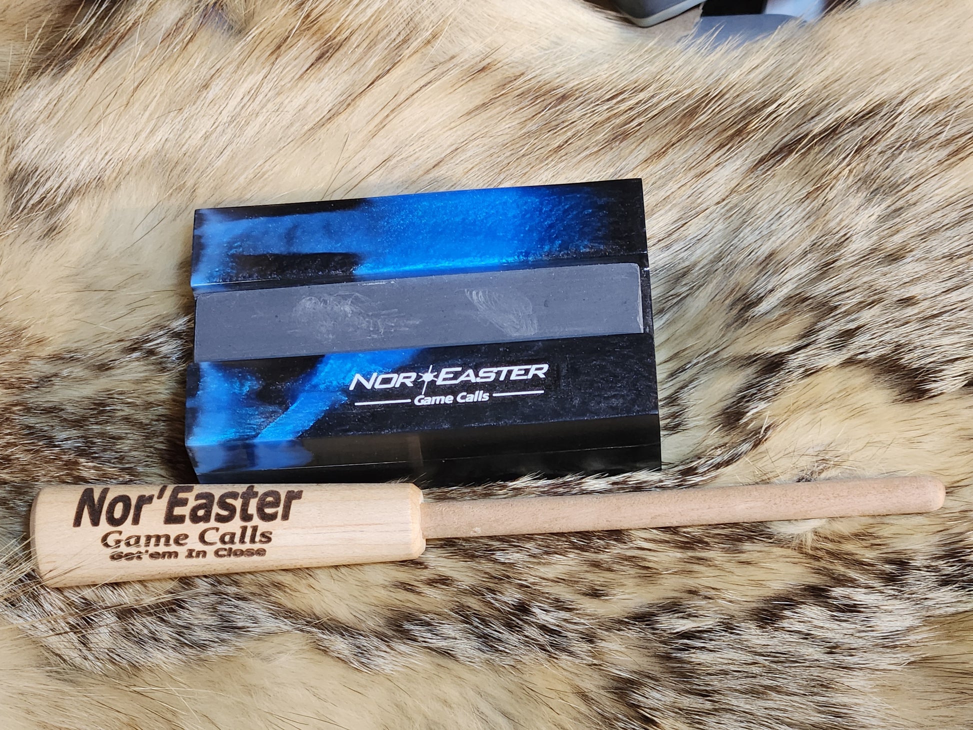 This little through Box Call is made by me right here in the shop using alumilite resin. They are 4" long by 2-1/2 wide and just under 1-1/4 inch thick great sounds and easy to play slate surface. Nice and small to fit I'm your pocket for your next hunt. Comes with noreaster striker. Storage pouch and nor'easter vinyl sticker.
