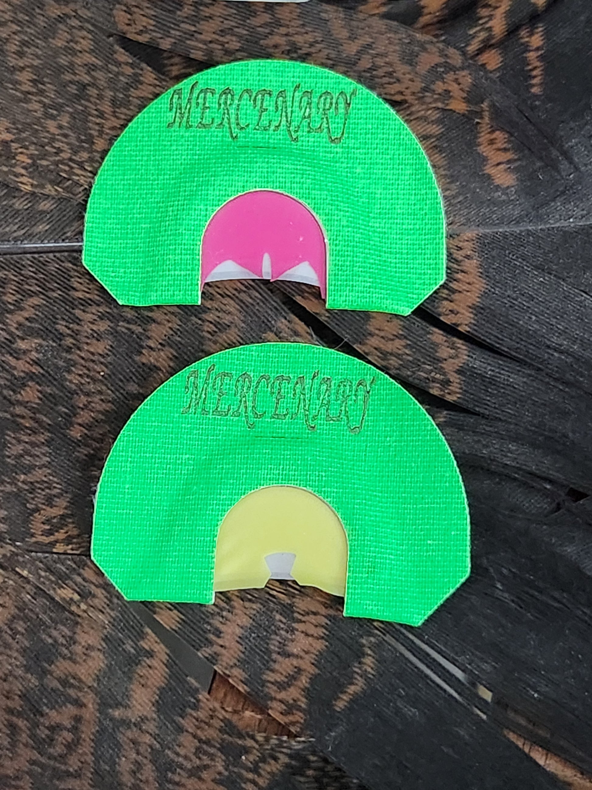 This is a two pack of Mercenary mouth calls two of the most popular cuts. Comes with the plastic storage case. These calls have been fine tuned and tested by turkey hunters over the last 5 years to out preform any store bought calls. My reed colors may change throughout the season but the sound will always be the same. Made right here in the noreaster game calls shop.