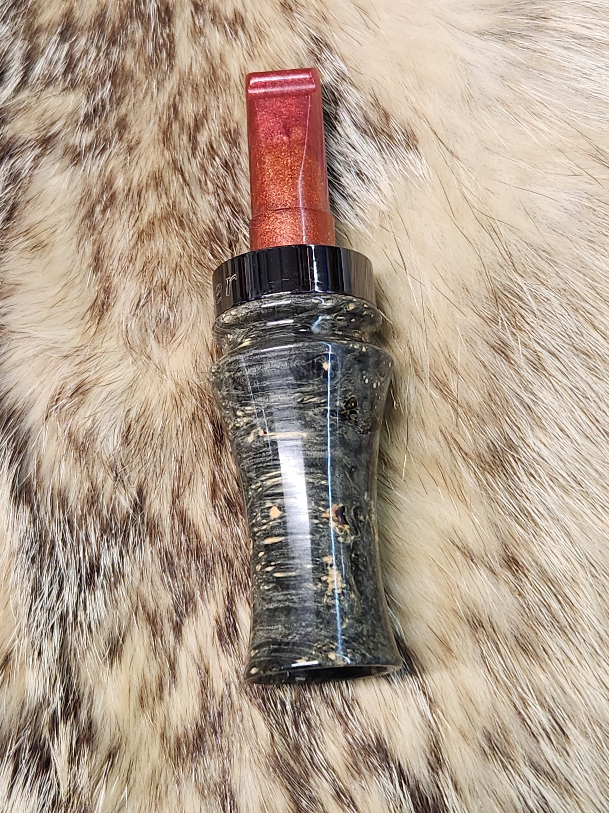 This is a custom crow call made from stabilized and dyed boxelder burl wood. The custom tone boards are made here in the shop and the reeds are hand cut and then the call is tested and adjusted for tone, very easy to use for the beginner or seasoned caller. Call will come with a free lanyard, storage pouch and nor'easter sticker,