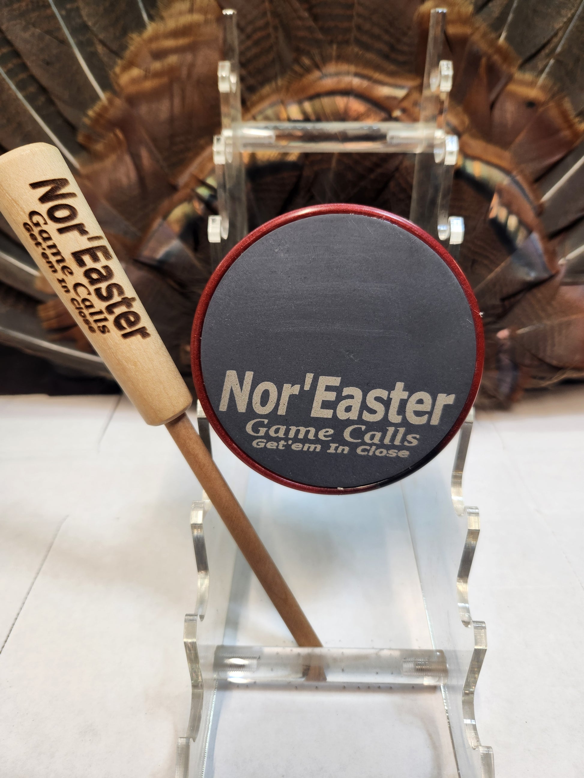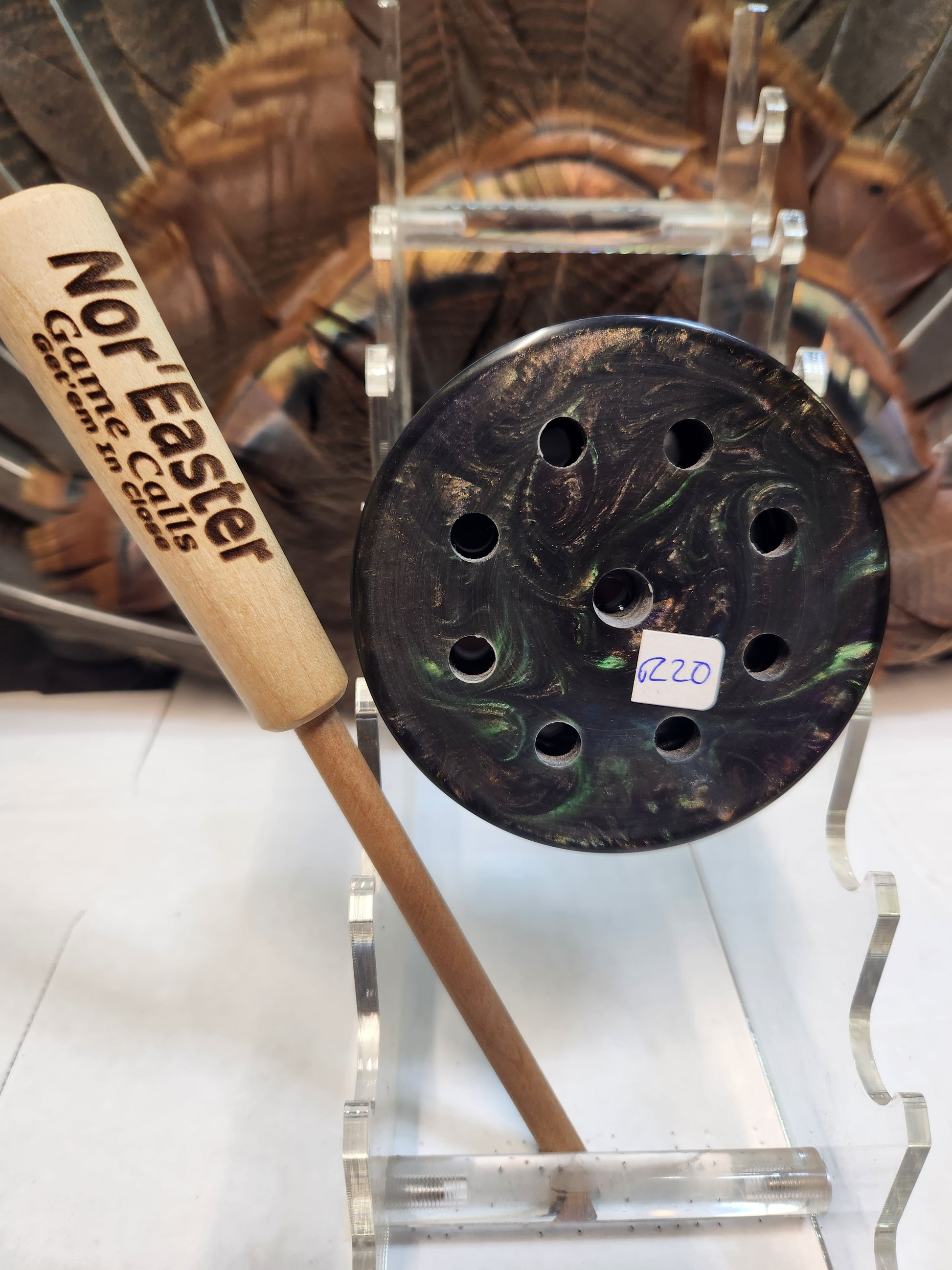 This is the new windbreaker turkey pot call designed by myself. Its made from alumilite resin. These calls are made one at a time by me. This is a regular series with a slate surface and a glass sound board. We have been using this design for almost 6 years with great results putting many Tom's to rest. This one does NOT have a custom turned striker to help bring the cost down but does come with a standard striker. So jump on this custom pot call and make some noise. This call can break through the windy days and still play soft to get'em in close. Call comes with custom striker, storage pouch and nor'easter vinyl sticker.