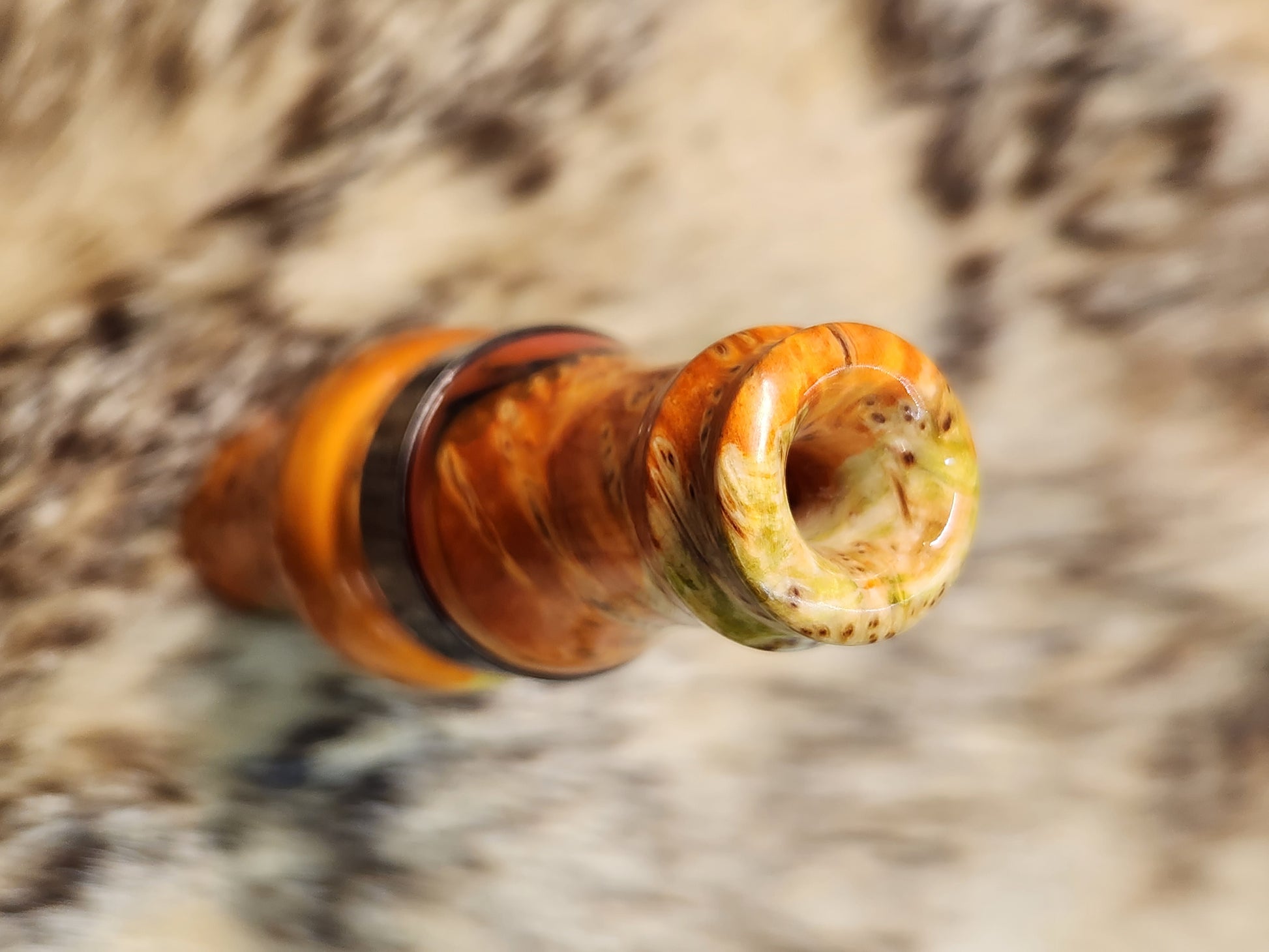 Custom Made Nor'Easter Double Reed Duck Call made from Yellow cedar Burl Wood Dyed and Stabilized in resin, I also coated the call with 6 coats of CA finish for a glass look and to protect the call. Great sounding double reed insert resin poured and shaped by me right here in the shop, call comes with a gun metal nickle band engraved with the nor'easter logo, also done right here in the shop, great call for getting the wary Ducks to come to your blind, If your looking for a true one of a kind call to show off this should do it, all the looks and great sounds.