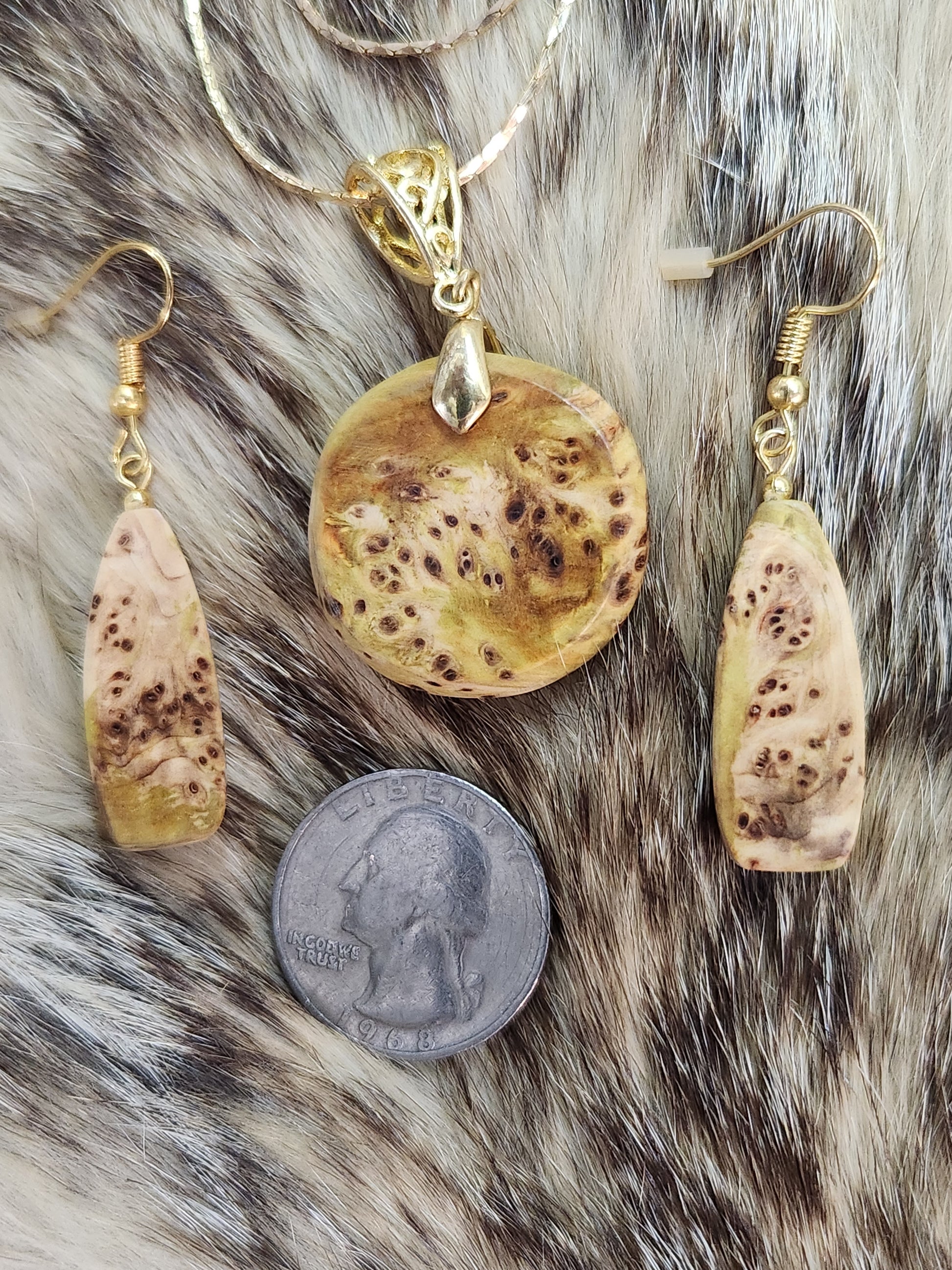 This unique set is crafted from Yellow cedar burl wood, treated to retain its vibrant, eye-catching hues. Meticulously handcrafted and stabilized, the set includes a pair of earrings and a matching neckless, with 14kt yellow gold plated fittings. Enjoy a polished, statement-making look with this one-of-a-kind set. made right here in the shop by me.